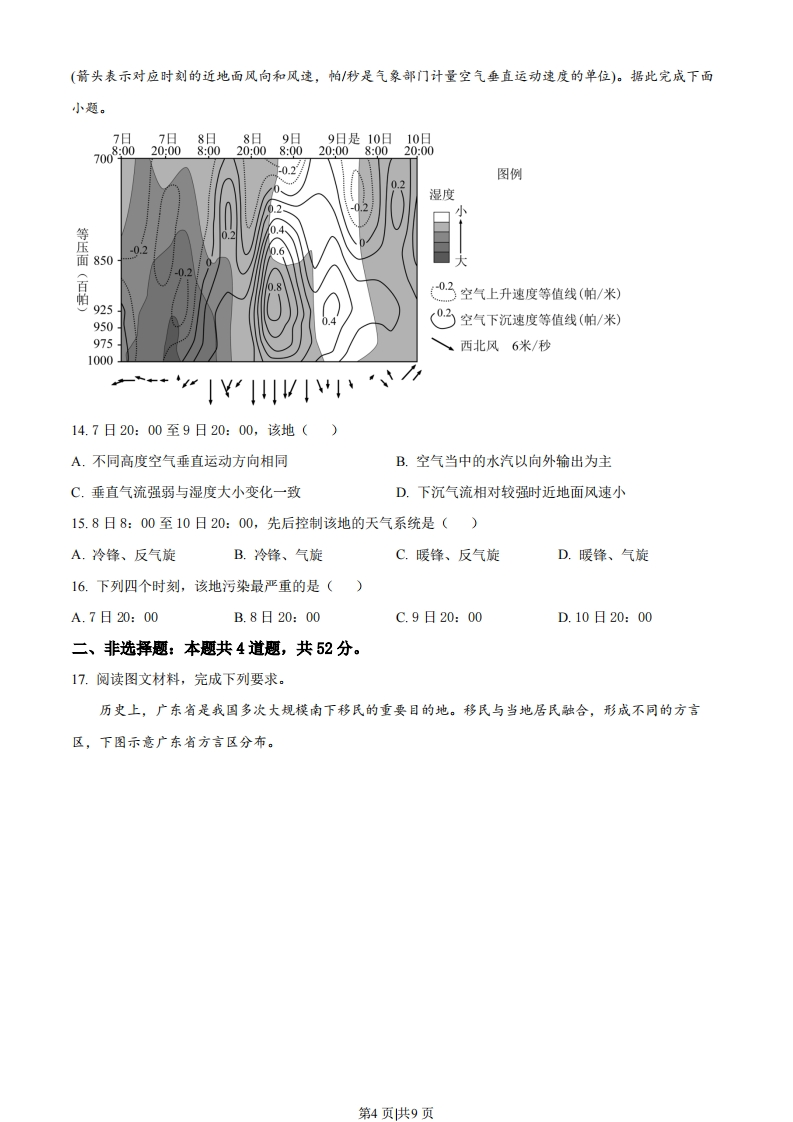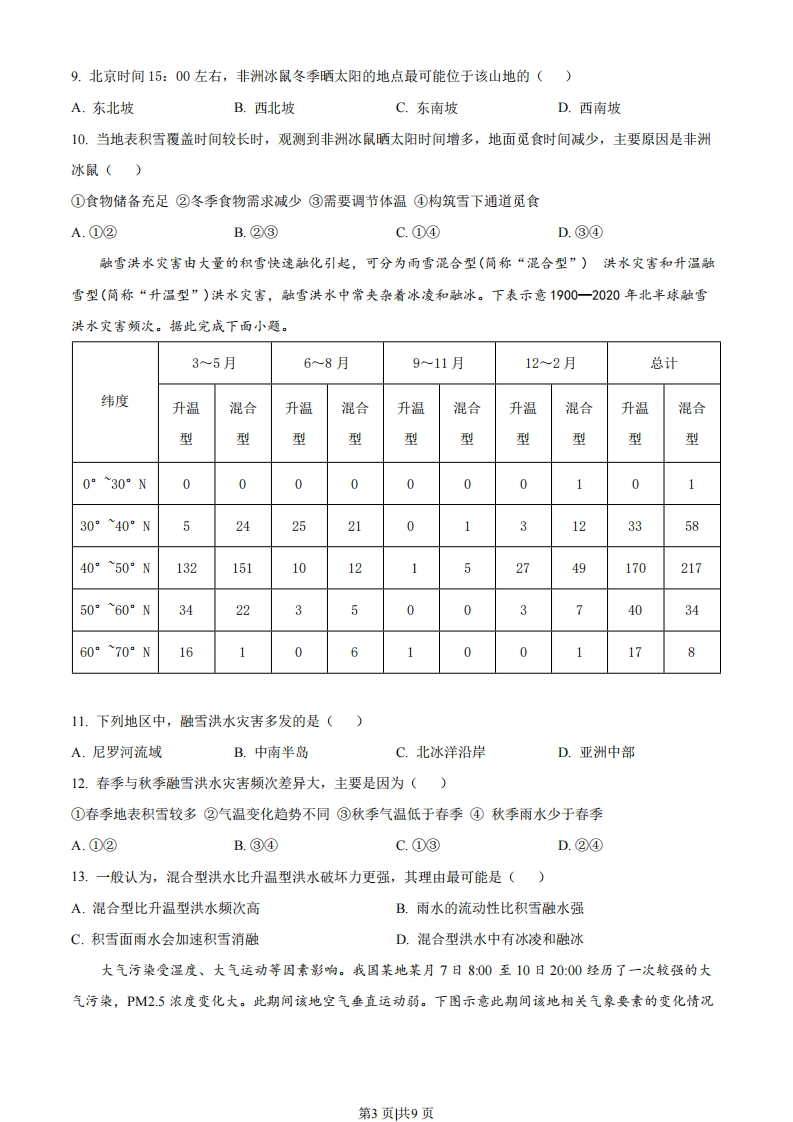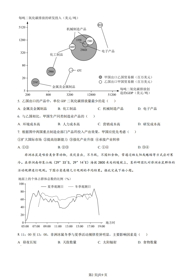 2023湖南高考地理真题一.选择题服装制造商可以在全球范围内选择分包商,产品残次率是影响其选择的重要因素之一。在交货期允许的情况下,洛杉矾时尚区内的韩国制造商更倾向选择代工厂位于东南亚的韩国分包商,而不是代工厂位于拉丁美洲的分包商。东南亚服装生产所需的面料大多产自中国,面料生产所需的棉花来自北美洲。据此完成下面小题。1.东南亚服装生产所需的面料大多产自中国,是因为中国()A.原材料丰富B.产业基础好C.劳动力廉价D.环境容量大2.时尚区内的韩国制造商更倾向选择代工厂位于东南亚的韩国分包商,最可能考虑的是()①贸易壁垒②文化关联③市场环境④生产技能A.①②B.①③C.②④D.③④港口地域组合是指一定地域范围内的诸多港口长期相互作用。形成具有某种分布格局、结构形式和功能类型的组合。下图示意海岛港口地域组合演变的不同阶段。据此完成下面小题。陆域①②③④图例·港口《六陆桥→客货流●岛域[!岛际区域→岛际轴线3.海岛港口地域组合演变阶段的顺序是()A.④①③②B.②④③①C.②④①③D.④②③①4.图中④示意的阶段,岛域内港口()A.功能尚未出现分化B.腹地界线较清晰C.分布格局趋向集中D.演化出不同等级碳排放强度与社会经济发展水平、创新投入密切相关,碳中和需要付出经济代价。下图示意某年甲国和乙国重点制造业部门产品的贸易颜、每吨二氧化碳排放的研发投入与经济产出情况。据比完成下面小题。第1页供9页每吨二氧化碳排放的研发投入(美元/吨)512082机械制造产品1280119582500116605256626320电子产品化工制品8029066629220○甲国出口乙国贸易额(百万美元)23545O乙国出口甲国贸易额(百万美元)金属及金属制品5每吨二氧化碳排放创20080032001280051200造的GDP(美元/吨)5.乙国出口的产品中,单位GDP二氧化碳排放量最少的是()A.金属及金属制品B.化工制品C.机械制造产品D.电子产品6.与乙国相比,甲国生产同类制造业产品的()A.环境成本高B.人力成本高C.营销成本高D.研发成本高7.根据图中两国重点制造业部门产品的投入产出效果,甲国应优先考虑()①扩大国际市场②提高创新能力③强化产业升级④承接产业转移A.①②B.②③C.①④D.③④非洲冰鼠是啮齿类食草动物,夜伏昼出,不冬眠,不囤积食物,常通过晒太阳或蜷缩等方式应对寒冷。在非润南部某山地(29°33^S,29°14E)海拔2800米处的缓坡上,某科研团队对非洲冰鼠群体的活动规律进行观测。下图示意连续几日观测的平均结果。据此完成下面小题。地面上的个体占群体总数的比例(%)100夏季观测日·冬季观测日806040200一地方时05:0007:00090011:0013:0015:0017:0019:008.11:00至13:00,非洲冰鼠冬季与夏季活动规律差异明显,主要影响因素是()A昼夜长短B.天敌数量C.太阳辐射D.食物数量第2页供9页