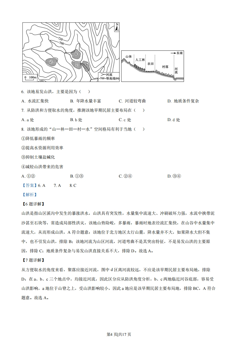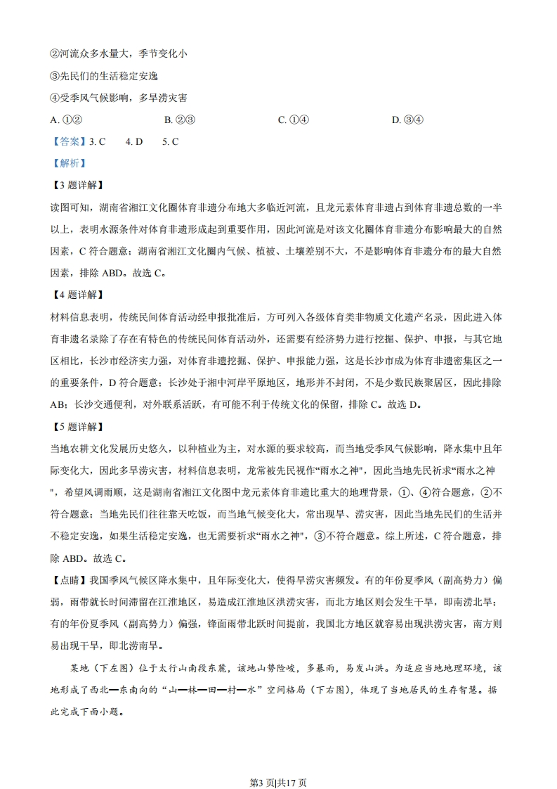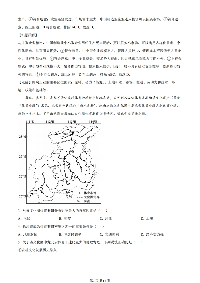 湖南省2022年普通高中学业水平选择性考试地理注意事项:1.答卷前,考生务必格自己的姓名、准考证号填写在本试卷和答题卡上。2.回答选择题时,选出每小题答案后,用铅笔把答题卡上对应题目的答案标号涂黑。如需改动,用橡皮擦干净后,再选涂其他答案标号,回答非选择题时,将答案写在答题卡上。写在本试卷上无效。3。考试结束后,将本试卷和答题卡一并交回。一、选择题:本题共16小题,每小题3分,共48分。在每小题给出的四个选项中,只有一项是符合题目要求的。中国制造业企业海外子公司在全球分布广泛,中小型企业是海外投资的主体。据此完成下面小题。1.截至2018年底,中国制造业企业海外子公司近半数分布在欧盟国家。这些企业在欧盟国家投资主要考虑当地()①原材料丰富②市场开放③经济发达④劳动力充足A.①②B.②③C.①④D.③④2.与大型企业相比,中国制造业中小型企业在海外投资的优势有()①大多为民营企业,抵御风险能力强②研发资金雄厚,创新能力较强③更好服务小市场,满足多样化需求④管理人员较少,管理成本较低A.①②B.①③C.②④D.③④【答案】1.B2.D【解析】【1题详解】欧盟为经济发达地区,产业规模大,原材料需求大,人口增长缓慢,多个国家长期呈负增长,因此一般情况下当地原材料和劳动力数量不具有突出优势,不会是中国制造业企业海外子公司在欧盟国家投资主要考虑因素,①、④不符合题意:欧盟为市场经济发达,市场开放程度较高,有利于中国制造业企业进入投资第1页共17页生产,②符合题意:欧盟经济发达,市场需求量大,中国制造业企业进入投资可以拓展市场,③符合题意。综上所述,B符合题意,排除ACD。故选B。【2题详解】与大型企业相比,中国制造业中小型企业组织生产更加灵活,更好服务小市场,可以满足多样化需求、个性化需求,具有明显优势,③符合题意:中小型企业规模不大,管理人员较少,管理成本应远低于大型企业,具有明显优势,④符合题意:中小企业资金、技术势力较弱,因此抵御风险能力可能不强,①不符合题意:中小型企业规模不大,融资能力较弱,技术投入较少,因此一般不具有研发资金雄厚,创新能力较强的特征,②不符合题意。综上所述,D符合题意,排除ABC。故选D。【点睛】影响工业的主要区位因素:原料、动力(能源)、土地和水、市场、交通、劳动力和技术、环境、政策和基础等。舞龙、赛龙舟、武术等传统民间体育活动经申报批准后,方可列入各级体育类非物质文化遗产(简称“体育非遗”)名录。龙常被先民视作“雨水之神",湖南省湘江文化图中龙元素体育非遗占到体育非遗总数的一半以上。下图示意湖南省湘江文化圈体育非遗分布情况。据此完成下面小题。111E112E13°E114°E28N27N26N体育非遗25N-…文化圈边界>一河流3.对该文化圈体育非遗分布影响最大的自然因素是()A.气候B.植被C.河流D.土壤4.长沙市成为体育非遗密集区之一的重要条件是()A.地形封闭B.聚居民族多C.交通便利D.经济实力强5.关于该文化圈中龙元素体育非遗比重大的地理背景,下列说法正确的是()①农耕文化发展历史悠久第2页共17页
