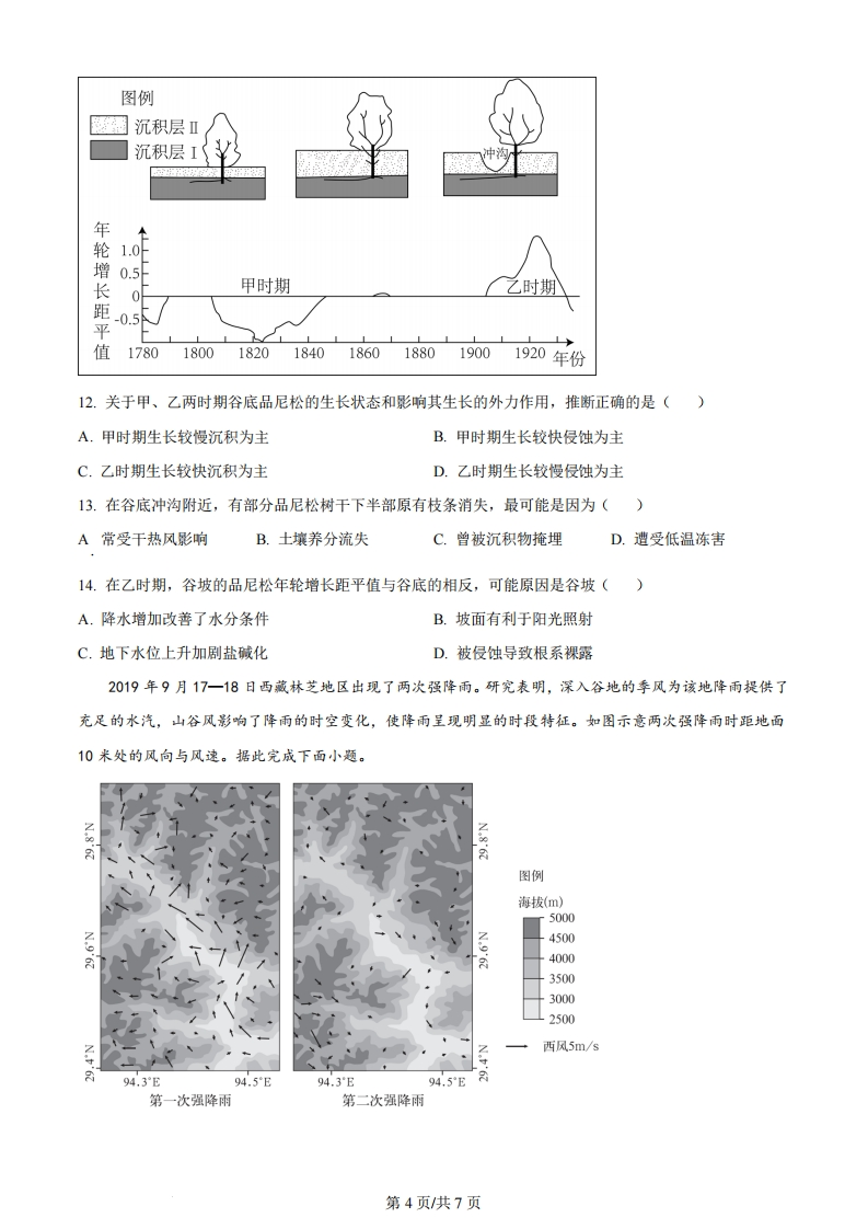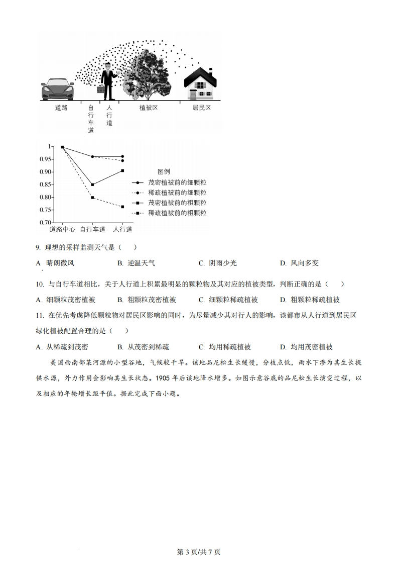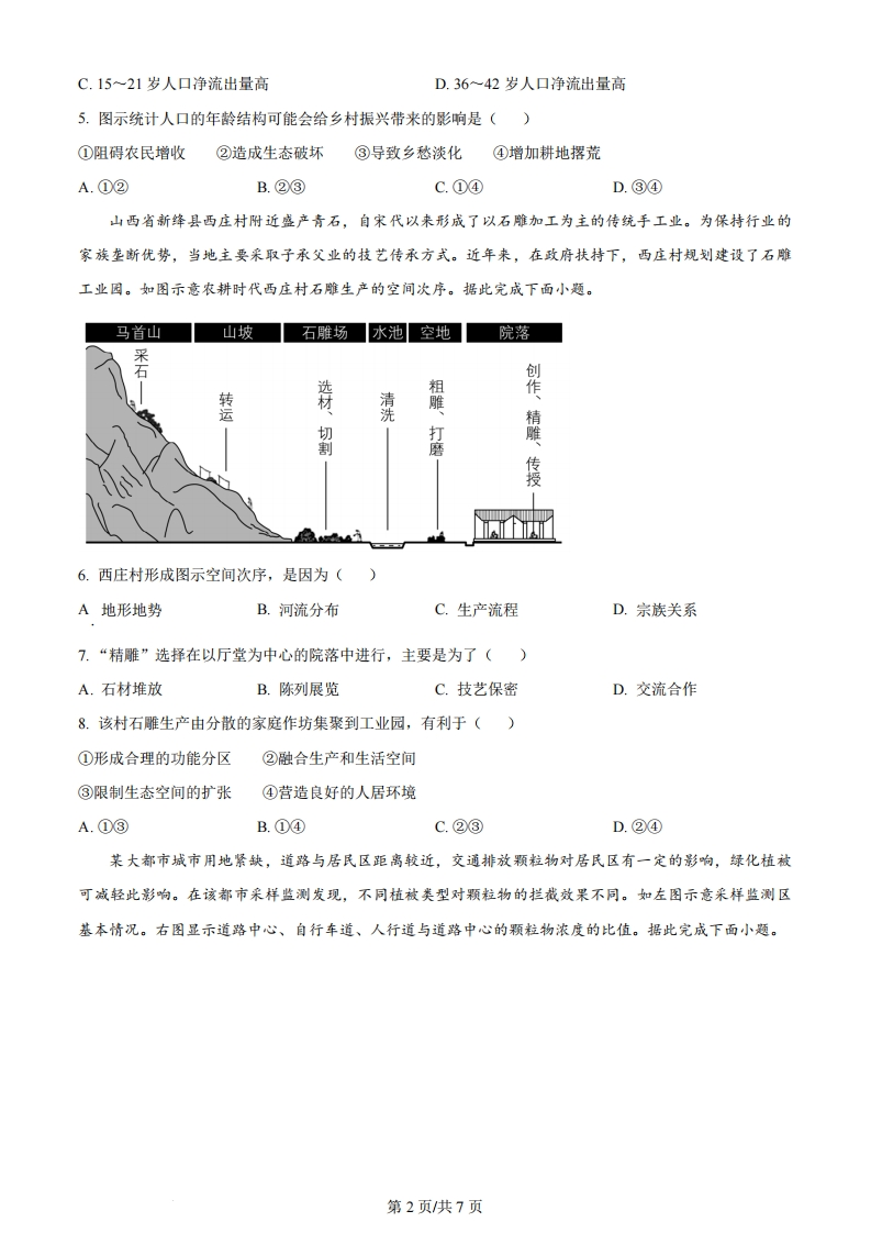 湖南省2024年普通高中学业水平选择性考试地理本试卷满分100分,考试时间75分钟。一、选择题:本题共16小题,每小题3分,共48分。在每小题给出的四个选项中,只有一项是符合题目要求的。石牌镇地处汉江之滨,古时商贾云集,舟楫繁忙,南来北往的人们路过这里都会吃上一碗豆腐。该镇种植的黄豆富含微量元素,豆腐的制作工艺考究,口感独特。近年来,全镇半数以上劳动力在外从事豆制品加工及相关产业,“石牌豆腐郎”远近闻名。据此完成下面小题。1.古时石牌镇豆腐声名远播,主要得益于()A.历史悠久B.交通便利C.宣传有力D.物美价廉2.当前有些“石牌豆腐郎”将豆制品加工企业迁回家乡发展,看重的是该镇的()①产业基础②人才优势③劳动力数量④市场需求A.①②B.①③C.②④D.③④3.随着产业规模的扩大,为保障“石牌豆腐”品质,可采取的有效举措是()A.采购外地大豆B.开发新产品C.制定技术标准D.举办文化节某学者以2010年常住人口为基础,在不考虑城乡人口迁移的条件下,测算出2020年我国乡村各年龄段常住人口数量。下图示意2020年我国乡村常住人口的测算结果与统计结果。据此完成下面小题。年龄(岁)908测算人422460150010005000050010001500人数(万人)4.测算人口数量与统计人口数量差异最显著的年龄段及该年龄段两者数量差异形成的原因()A.15~21岁人口自然增长慢B.36~42岁人口自然增长慢第1页共7页C.15~21岁人口净流出量高D.36~42岁人口净流出量高5.图示统计人口的年龄结构可能会给乡村振兴带来的影响是()①阻碍农民增收②造成生态破坏③导致乡愁淡化④增加耕地撂荒A.①②B.②③C.①④D.③④山西省新锋县西庄村附近盛产青石,自宋代以来形成了以石雕加工为主的传统手工业。为保持行业的家族垄断优势,当地主要采取子承父业的技艺传承方式。近年来,在政府扶持下,西庄村规划建设了石雕工业园。如图示意农耕时代西庄村石雕生产的空间次序。据此完成下面小题。马首山山坡石雕场水池空地院落采石雕切打蘿镬6.西庄村形成图示空间次序,是因为()A地形地势B.河流分布C.生产流程D.宗族关系7.“精雕”选择在以厅堂为中心的院落中进行,主要是为了()A.石材堆放B.陈列展览C.技艺保密D.交流合作8.该村石雕生产由分散的家庭作坊集聚到工业园,有利于()①形成合理的功能分区②融合生产和生活空间③限制生态空间的扩张④营造良好的人居环境A.①③B.①④C.②③D.②④某大都市城市用地紧缺,道路与居民区距离较近,交通排放颗粒物对居民区有一定的影响,绿化植被可减轻此影响。在该都市采样监测发现,不同植被类型对颗粒物的拦截效果不同。如左图示意采样监测区基本情况。右图显示道路中心、自行车道、人行道与道路中心的颗粒物浓度的比值。据此完成下面小题。第2页共7页