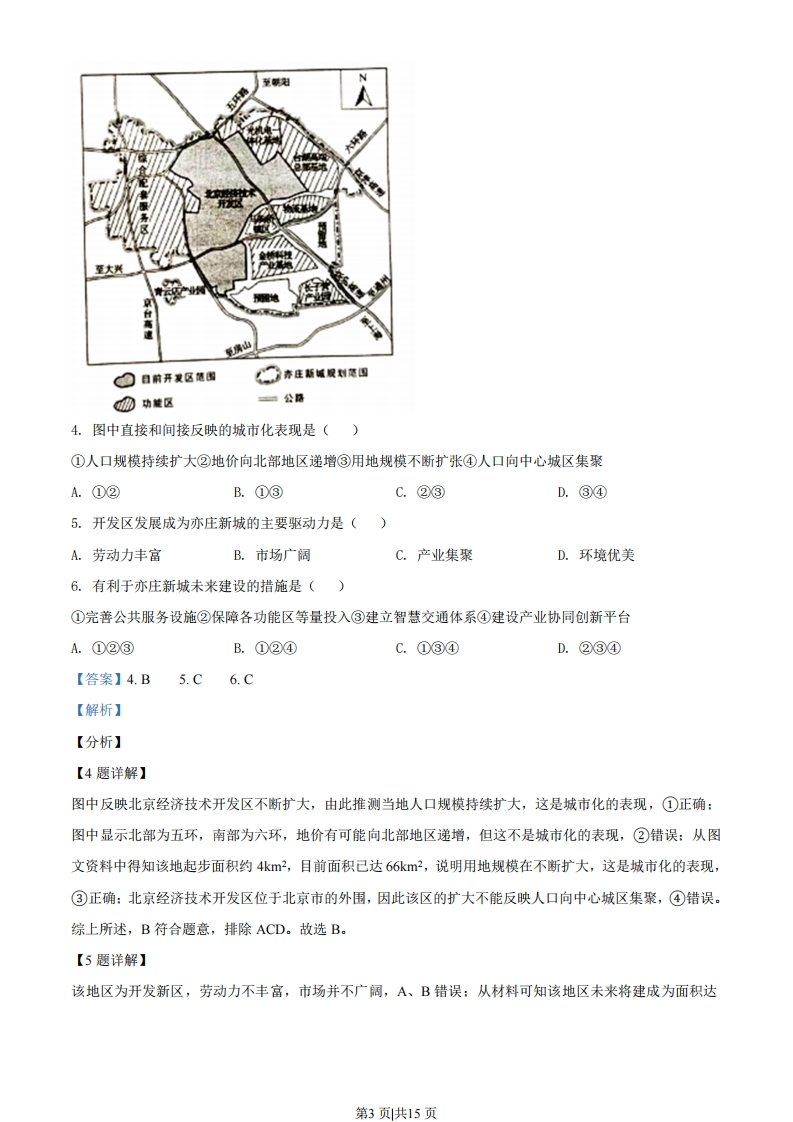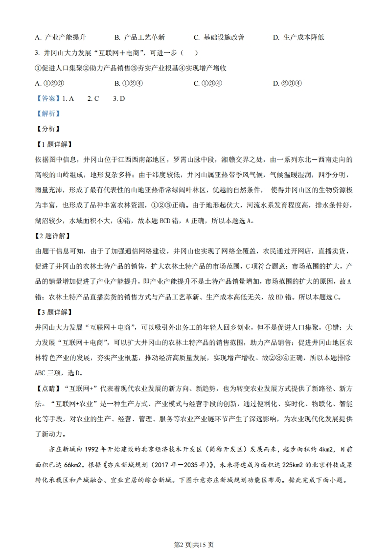 2021年湖北省普通高中学业水平选择性考试地理本试卷共6页,18题。全卷满分100分。考试用时75分钟。注意事项:1.答题前,先将自已的姓名、准考证号、考场号、座位号填写在试卷和答题卡上,并将准考证号条形码粘贴在答题卡上的指定位置。2.选择题的作答:每小题选出答案后,用2B铅笔把答题卡上对应题目的答案标号涂黑。写在试卷、草稿纸和答题卡上的非答题区域均无效。3.非选择题的作答:用黑色签字笔直接答在答题卡上对应的答题区域内。写在试卷、草稿纸和答题卡上的非答题区域均无效。4.考试结束后,请将本试卷和答题卡一并上交。一、选择题:本题共15小题,每小题3分,共45分。在每小题给出的四个选项中,只有一项是符合题目要求的。党的十八大以来,革命老区井冈山贯彻新发展理念,加强通信网络建设,推动经济高质量发展。随着网络全覆盖,农民通过开网店,直播卖货,足不出户就可将农林土特产品迅速销往全国各地。下图示意井冈山地理概况。据此完成下面小题。▲7.,山峰及高程/e>一河⊙县级行政中心多镇公路比倒R39m1.井冈山农林土特产品丰富,其形成的主要自然条件是()①地形复杂多样②气候温暖湿润③生物物种丰富④水域面积广大A.①②③B.①②④C.①③④D.②③④2.直播卖货让井冈山的农林土特产品不愁卖了,这主要得益于()第1页共15页A.产业产能提升B.产品工艺革新C.基础设施改善D.生产成本降低3.井冈山大力发展“互联网+电商”,可进一步()①促进人口集聚②助力产品销售③夯实产业根基④实现增产增收A.①②③B.①②④C.①③④D.②③④【答案】1.A2.C3.D【解析】【分析】【1题详解】依据图中信息,井冈山位于江西西南部地区,罗霄山脉中段,湘赣交界之处,由一系列东北一西南走向的高峻的山岭组成,地形复杂多样:由于纬度较低,井冈山属亚热带季风气候,气候温暖湿润,四季分明,雨量充沛,形成了最有代表性的山地亚热带常绿阔叶林区,优越的自然条件,使得井冈山区的生物资源极为丰富,也形成了品种丰富农林资源,①②③正确。由于地形起伏大,河流水系发育程度高,排水条件好,湖沼较少,水域面积不大,④错,故本题BCD错,A正确,所以本题选A。【2题详解】由题干信息可知,由于了加强通信网络建设,井冈山也实现了网络全覆盖,农民通过开网店,直播卖货,促进了井冈山的农林土特产品的销售,扩大农林土特产品的市场范围,C项符合题意:市场范围的扩大,产品的销量增加促进了产业产能提升,即产业产能提升不是土特产品销量增加,市场范围的扩大的原因,故A错:农林土特产品直播卖货的销售方式与产品工艺革新、生产成本高低无关,故BD错。所以本题选C。【3题详解】井冈山大力发展“互联网十电商”,可以吸引外出务工的年轻人回乡创业,但不是促进人口集聚,①错:大力发展“互联网+电商”,可以扩大井冈山的农林土特产品的销售范围,助力产品销售:促进井冈山地区农林特色产业的发展,夯实产业根基,推动经济高质量发展,实现增产增收。故②③④正确,所以本题排除ABC三项,选D.【点睛】“互联网+”代表着现代农业发展的新方向、新趋势,也为转变农业发展方式提供了新路径、新方法。“互联网+农业”是一种生产方式、产业模式与经营手段的创新,通过便利化、实时化、物联化、智能化等手段,对农业的生产、经营、管理、服务等农业产业链环节产生了深远影响,为农业现代化发展提供了新动力。亦庄新城由1992年开始建设的北京经济技术开发区(简称开发区)发展而来,起步面积约4km2,目前面积已达66km2。根据《亦庄新城规划(2017年一2035年)》,未来将建成为面积达225km2的北京科技成果转化承载区和产城融合、宜业宜居的粽合新城。下图示意亦庄新城规划功能区布局。据此完成下面小题。第2页共15页