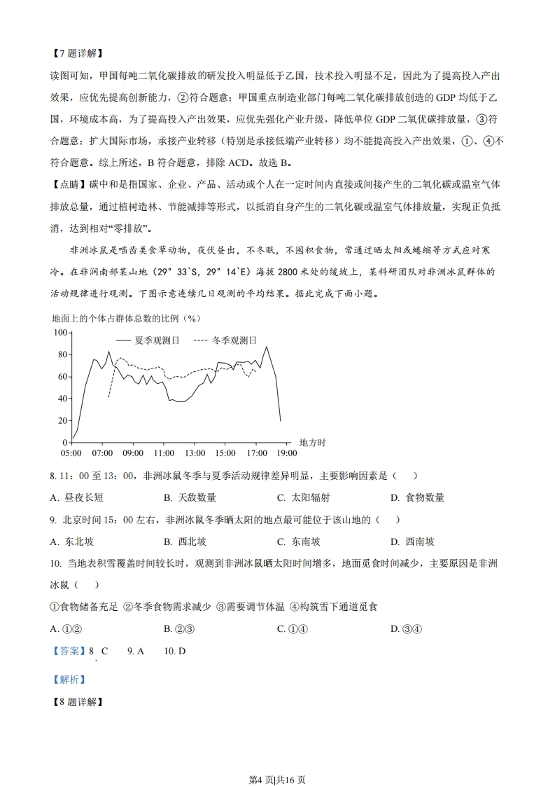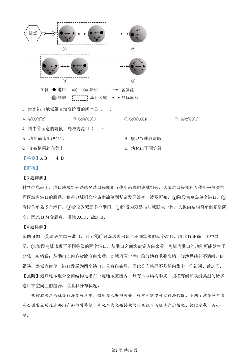 2023湖南高考地理真题一.选择题服装制造商可以在全球范围内选择分包商,产品残次率是影响其选择的重要因素之一。在交货期允许的情况下,洛杉矾时尚区内的韩国制造商更倾向选择代工厂位于东南亚的韩国分包商,而不是代工厂位于拉丁美洲的分包商。东南亚服装生产所需的面料大多产自中国,面料生产所需的棉花来自北美洲。据此完成下面小题。1.东南亚服装生产所需的面料大多产自中国,是因为中国()A.原材料丰富B.产业基础好C.劳动力廉价D.环境容量大2.时尚区内的韩国制造商更倾向选择代工厂位于东南亚的韩国分包商,最可能考虑的是()①贸易壁垒②文化关联③市场环境④生产技能A.①②B.①③C.②④D.③④【答案】1.B2.C【解析】【1题详解】与东南亚相比,中国在劳动力价格、环境容量不占优势,但由于中国生产面料的产业基础好,面料生产量大,性价比高,因此东南亚服装生产所需的面料大多产自中国,排除CD,B符合题意。材料信息表明,面料生产所需的棉花来自北美洲,因此原材料丰富不是东南亚服装生产所需的面料大多产自中国的原因,排除A。故选B。【2题详解】洛杉矾时尚区内的韩国制造商更倾向选择代工厂位于东南亚的韩国分包商,两者均来自韩国,文化相同,经营理念相似,交流便利,②符合题意:材料信息表明,产品残次率是影响其选择的重要因素之一,洛杉矾时尚区内的韩国制造商更倾向选择代工厂位于东南亚的韩国分包商,而不是代工厂位于拉丁美洲的分包商,可能是东南亚工人的生产技能高于拉丁美洲,产品残次率相对较低,④符合题意:与拉丁美洲相比,东南亚在贸易壁垒、市场环境并不具有明显优势,且无材料信息支撑,因此①、③不符合题意。综上所述,C符合题意,排除ABD。故选C。【点睛】影响工业的主要区位因素:原料、动力(能源)、土地和水、市场、交通、劳动力和技术、环境、文化联系、政策和基础等。港口地域组合是指一定地域范围内的诸多港口长期相互作用。形成具有某种分布格局、结构形式和功能类型的组合。下图示意海岛港口地域组合演变的不同阶段。据此完成下面小题。第1页共16页陆域①②③④图例●港口《—沪陆桥→客货流●岛域!岛际区域→岛际轴线3.海岛港口地域组合演变阶段的顺序是()A.④①③②B.②④③①C.②④①③D.④②③①4.图中④示意的阶段,岛域内港口()A.功能尚未出现分化B.腹地界线较清晰C.分布格局趋向集中D.演化出不同等级【答案】3.B4.D【解析】【3题详解】材料信息表明,港口地域组合是诸多港口长期相互作用形成的地域组合。诸多港口长期相互作用一般会加强区域内港口的联系,使得地域组合状态由简单到复杂发展演变。读图可知,②阶段为单岛单个港口,④阶段为单岛多个港口,③阶段为双岛多个港口,①阶段为双岛与陆域联成一体,大致由结构简单到复杂演变,因此B符合题意,排除ACD。故选B.【4题详解】读图可知,②阶段的单一港口,到了④阶段岛域内出现了不同等级的两个港口,因此D正确:图中显示,④阶段岛域出现了不同等级的两个港口,从港口之间客货流方向来看,岛域内港口的功能可能发生了分化,A错误:从港口之间客货流方向来看,岛域内两个港口的腹地有重叠交错,腹地界线并不清晰,B错误:岛域内由单一港口发展为两个港口,且背向布局,因此分布格局不是趋向集中,C错误。故选D。【点睛】港口地域组合空间结构是指在一定地域范围内、具有不同结构形式、规模等级和功能类型的诸多港口在空间上的组合、联系和分布状况。碳排放强度与社会经济发展水平、创新投入密切相关,碳中和需要付出经济代价。下图示意某年甲国和乙国重点制造业部门产品的贸易颜、每吨二氧化碳排放的研发投入与经济产出情况。据比完成下面小题。第2页共16页