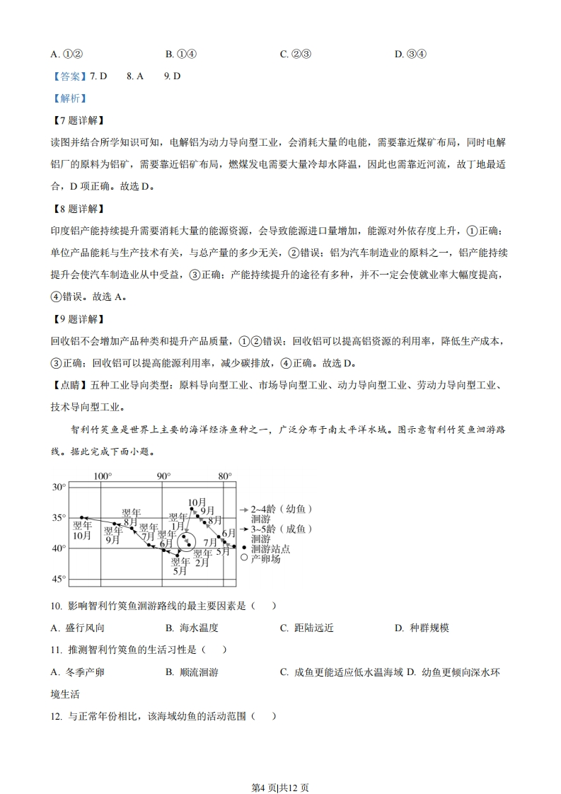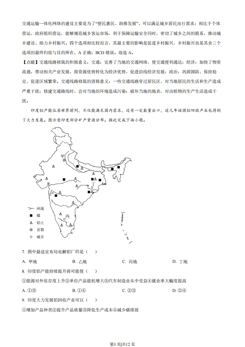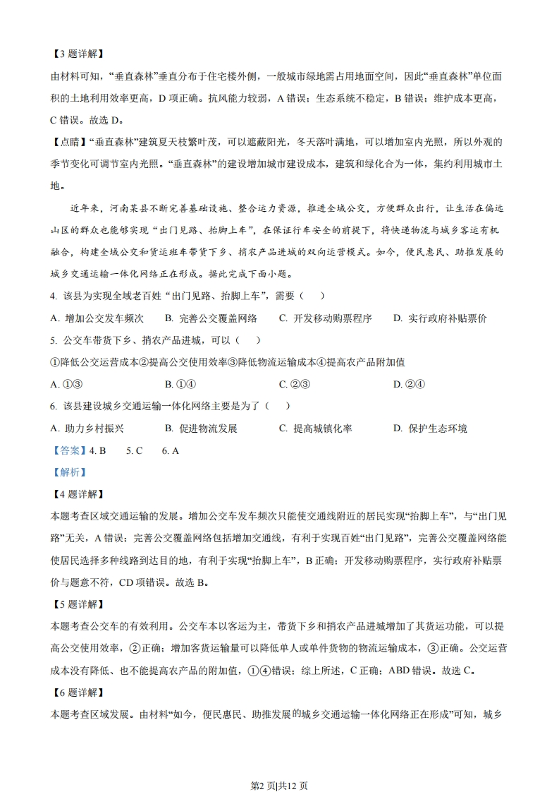 2022年普通高中学业水平选择性考试(湖北卷)地理本试卷满分100分,考试时间75分钟。一、选择题:本大题共15小题,每小题3分,共45分。在每小题给出的四个选项中,只有一项是符合题目要求的。在某城市中心,一种创新型绿色建筑一垂直森林高层住宅落成面世。它是在建筑的垂直方向上,覆盖满本地乔木、灌木和草本等植物,为每层住户营造“空中花园”,形成具有森林效应的生态居住群落。图示意“垂直森林”局部景观。据此完成下面小题。1.与传统设计相比,“垂直森林”在居住空间设计上变化最大的地方是()A.阳台B.客厅C.卧室D.厨房2.“垂直森林”的灌溉系统适宜采用()A.井灌B.漫灌C.喷灌D.滴灌3.相较于一般城市绿地,“垂直森林”()A.抗风能力更强B.生态系统更加稳定C.维护成本更低D.土地利用效率更高【答案】1.A2.D3.D【解析】【1题详解】根据材料可知,为每层住户营造“空中花园”,植物主要是在建筑外侧的垂直方向延伸,由图可知,植被主要分布在阳台上,阳台也更适合种植植被,因此与传统设计相比,“垂直森林”变化最大的是阳台,A项正确。故选A。【2题详解】由材料可知,“垂直森林”在建筑的垂直方向上延伸,垂直高度差异大,滴灌可以精准灌溉,节水的同时对楼体及居民生活影响较小,D项正确。故选D。第1页共12页【3题详解】由材料可知,“垂直森林”垂直分布于住宅楼外侧,一般城市绿地需占用地面空间,因此“垂直森林”单位面积的土地利用效率更高,D项正确。抗风能力较弱,A错误:生态系统不稳定,B错误:维护成本更高,C错误。故选D.【点睛】“垂直森林”建筑夏天枝繁叶茂,可以遮蔽阳光,冬天落叶满地,可以增加室内光照,所以外观的季节变化可调节室内光照。“垂直森林”的建设增加城市建设成本,建筑和绿化合为一体,集约利用城市土地。近年来,河南某县不断完善基础设施、整合运力资源,推进全域公交,方便群众出行,让生活在偏远山区的群众也能够实现“出门见路、抬脚上车”,在保证行车安全的前提下,将快递物流与城乡客运有机融合,构建全域公交和货运班车带货下乡、捎农产品进城的双向运营模式。如今,便民患民、助推发展的城乡交通运输一体化网络正在形成。据此完成下面小题。4.该县为实现全域老百姓“出门见路、抬脚上车”,需要()A.增加公交发车频次B.完善公交覆盖网络C.开发移动购票程序D.实行政府补贴票价5.公交车带货下乡、捎农产品进城,可以()①降低公交运营成本②提高公交使用效率③降低物流运输成本④提高农产品附加值A.①③B.①④C.②③D.②④6.该县建设城乡交通运输一体化网络主要是为了()A.助力乡村振兴B.促进物流发展C.提高城镇化率D.保护生态环境【答案】4.B5.C6.A【解析】【4题详解】本题考查区域交通运输的发展。增加公交车发车频次只能使交通线附近的居民实现“抬脚上车”,与“出门见路”无关,A错误:完善公交覆盖网络包括增加交通线,有利于实现百姓“出门见路”,完善公交覆盖网络能使居民选择多种线路到达目的地,有利于实现“抬脚上车”,B正确:开发移动购票程序,实行政府补贴票价与题意不符,CD项错误。故选B。【5题详解】本题考查公交车的有效利用。公交车本以客运为主,带货下乡和捎农产品进城增加了其货运功能,可以提高公交使用效率,②正确:增加客货运输量可以降低单人或单件货物的物流运输成本,③正确。公交运营成本没有降低、也不能提高农产品的附加值,①④错误:综上所述,C正确:ABD错误。故选C。【6题详解】本题考查区域发展。由材料“如今,便民惠民、助推发展的城乡交通运输一体化网络正在形成”可知,城乡第2页共12页