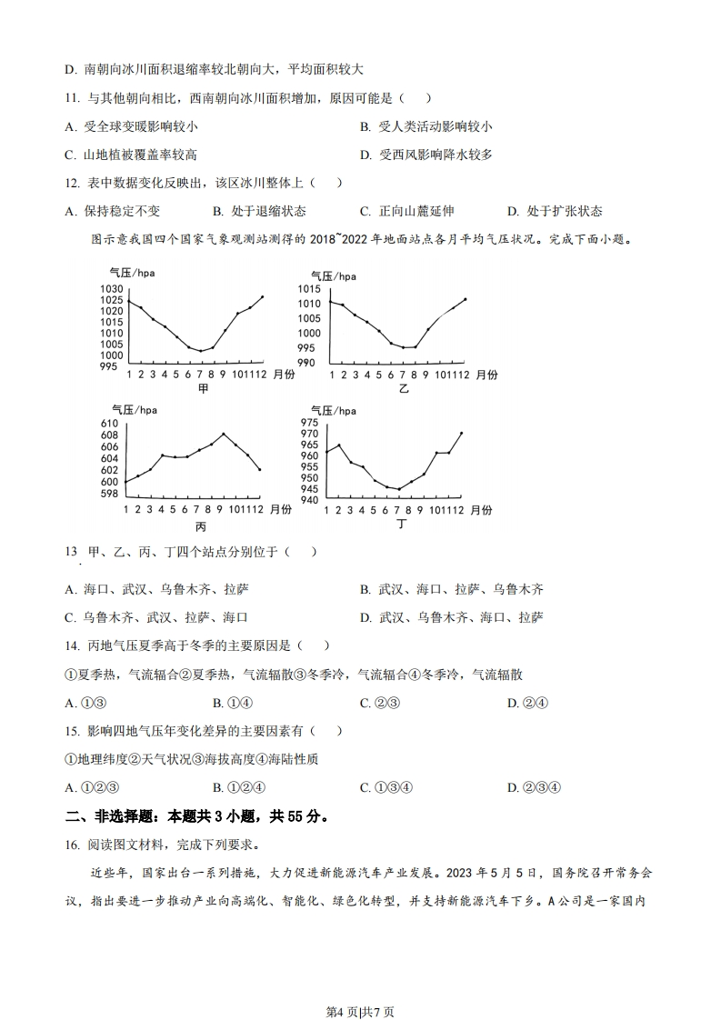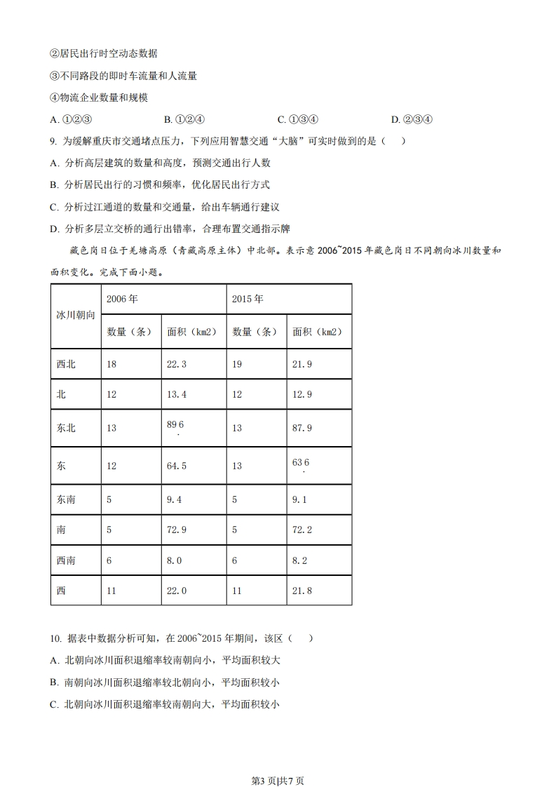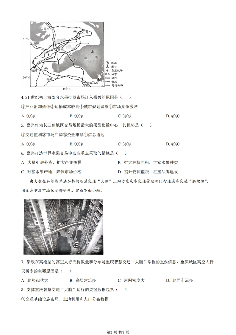 2023年湖北省普通高中学业水平选择性考试地理一、选释题:本题共15小题,每小题3分,共45分。在每小题给出的四个选项中,只有一项是符合题目要求的。“产村景”一体化融合是我国乡村振兴过程中形成的一种具有地域特色的发展模式。图示意该模式中“产、村、景”各要素之间的互动关系。完成下面小题。村庄空间资源经济价值营造环境资土景观协调乡村产业结构产业景观提供特色景观资源1.该模式发展的基础是()A.人口规模B.基础设施C.生产水平D.资源禀赋2.“产、村、景”各要素融合的主要途径是()A.乡村旅游开发B.生态环境建设C.农副产品加工D.电子商务推广3.该模式的特色在于()A.推动城镇服务业逐渐向周边传统村落转移B.促进传统村落人口的城镇化水平不断提升C.体现农村生产、生活、生态空间高度融合D.协调农村第一、第二、第三产业均衡发展浙江嘉兴水果市场创办于1992年,21世纪初随着上海部分水果批发市场的迁入,规模不断壮大,目前已成为长三角地区交易规模最大的果品集散中心。近年来,嘉兴积极拓展进口水果市场,打造世界水果交易中心。图示意嘉兴交通运输布局。完成下面小题。第1页供7页④机场港口木在建机场30.N山河铁路高速公路121°E4.21世纪初上海部分水果批发市场迁入嘉兴的原因是()①产业附加值低②运输成本较高③城市规划调整④市场竞争激烈A.①②B.①③C.②④D.③④5.嘉兴作为长三角地区交易规模最大的果品集散中心,其优势是()①交通便利②市场广阔③资金雄厚④信息通达A.①②B.①③C.②④D.③④6.嘉兴打造世界水果交易中心应重点采取的措施是()A.大量引进外资,扩大产业规模B.扩大种植面积,丰官水果种类C.对接水果产地,降低市场价格D.提升物流能级,注重品牌建设由大数据和智能算法加持的智慧交通“大脑”正助力重庆市交通管理部门打通城市交通“肠梗阻”。图示意重庆市城区局部街景。完成下面小题。7.架设在高楼层的高空人行天桥数量和分布是重庆智慧交通“大脑”掌握的重要信息。重庆城区高空人行天桥多的主要原因是()A.地势起伏大B.高层建筑多C.河网密度大D.地面车流多8.支撑重庆智慧交通“大脑”运行的关键数据包括()①交通基础设施布局、土地利用和人口分布数据第2页供7页