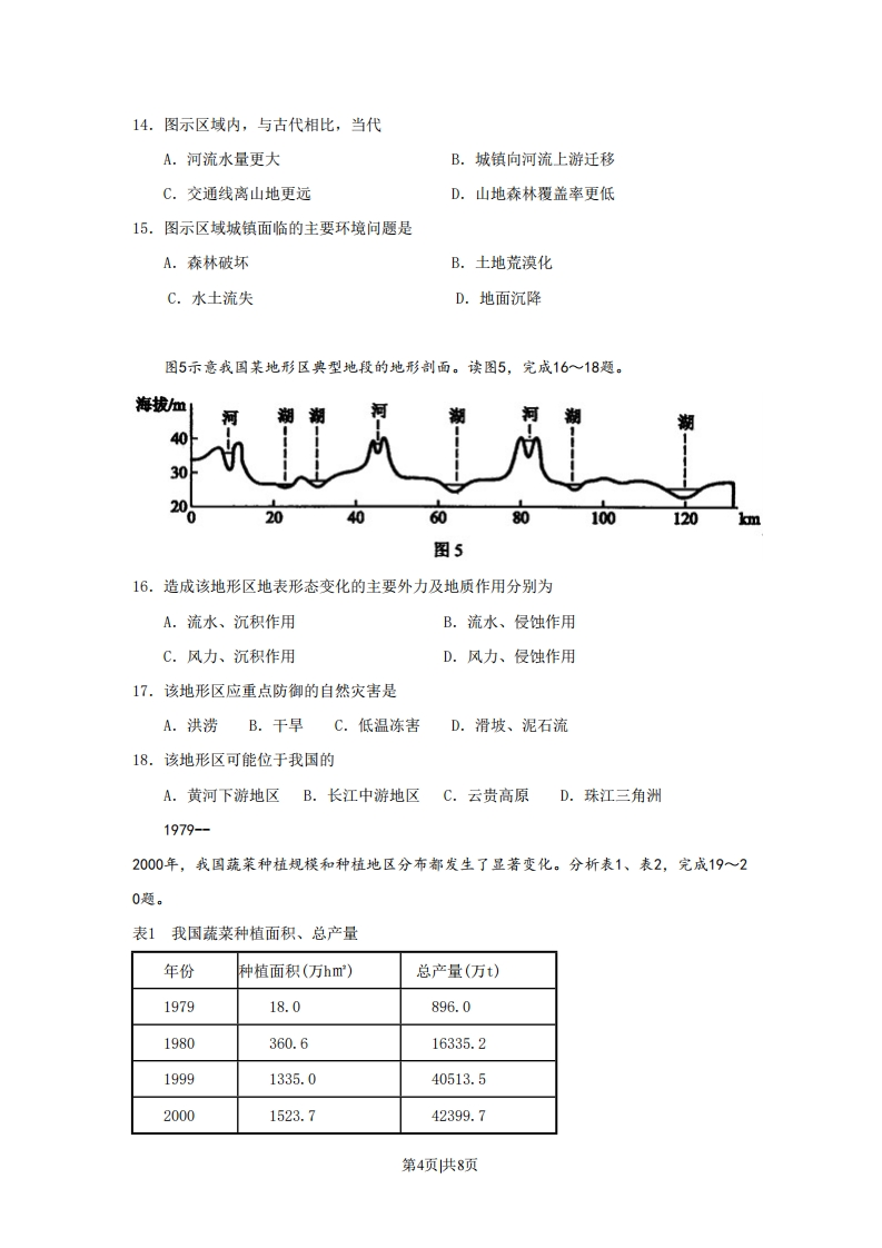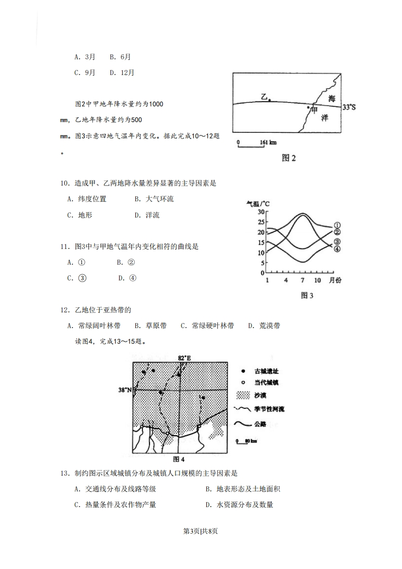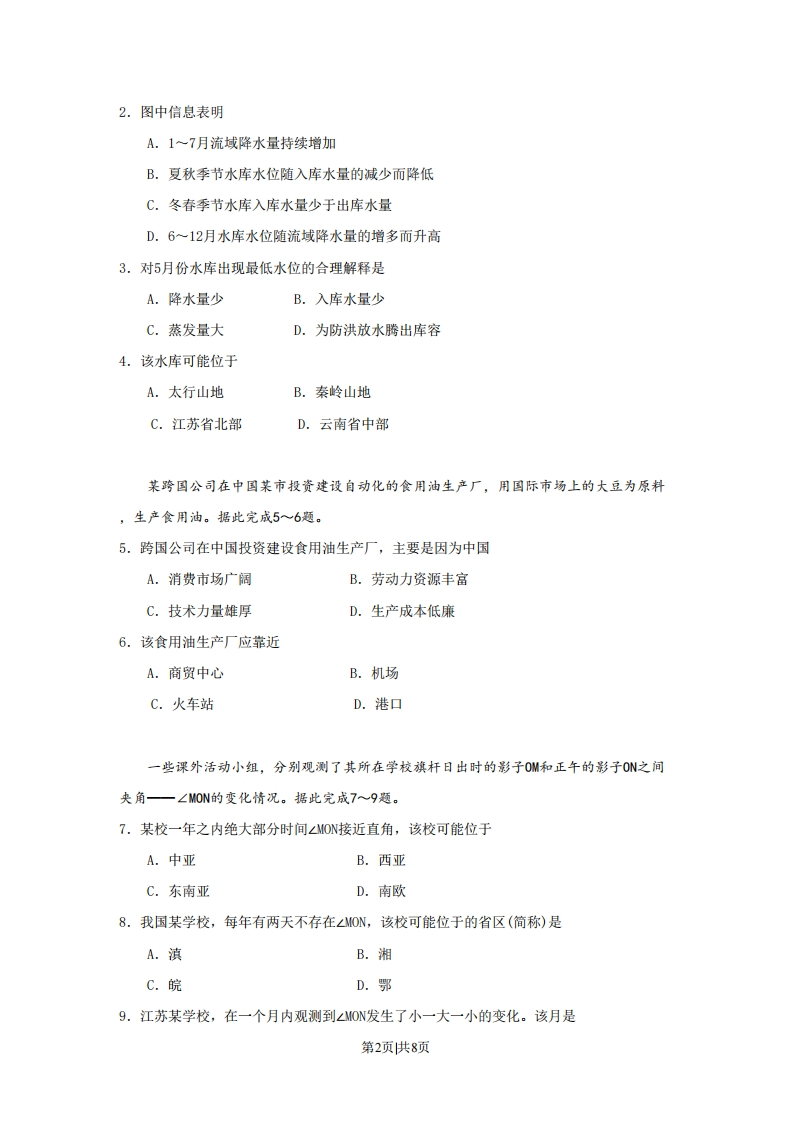 2009年普通高等学校招生全国统一考试(海南卷)地理注意事项:1.本试卷分第I卷(选择题)和第Ⅱ卷(非选择题)两部分。答卷前,考生务必将自己的姓名、准考证号填写在答题卡上。2.回答第I卷时,选出每小题答案后,用铅笔把答题卡上对应题目的答案标号涂黑。如需改动,用橡皮擦干净后,再选涂其它答案标号。写在本试卷上无效。3.回答第Ⅱ卷时,将答案写在答题卡上。写在本试卷上无效。4.考试结束后,将本试卷和答题卡一并交回。第卷一、选择题(本题共有20小题,每小题3分,共60分。在每小题给出的四个选项中,只有一项最符合题目要求.)1.某国际机构在美国首都华盛顿(西五区)主持视频会议,请中国的王教授在北京给远在非洲(西一区至东三区)的同行介绍经验。下列时段中,对三方最合适的是A.华盛顿时间14:00~16:00B.北京时间14:00~16:00C.华盛顿时间21:00~23:00D.北京时间21:00~23:00图I表示我国莱水库年内逐月入库水量()、月均水位(水面海拔)(b)。读图1,完成2~4题。月入库水量/万m月均水位/m45040030350253002025020015001005050710月份10月份图1第1页共8页2.图中信息表明A.1~7月流域降水量持续增加B.夏秋季节水库水位随入库水量的减少而降低C.冬春季节水库入库水量少于出库水量D.6~12月水库水位随流域降水量的增多而升高3.对5月份水库出现最低水位的合理解释是A.降水量少B.入库水量少C.蒸发量大D.为防洪放水腾出库容4.该水库可能位于A.太行山地B.秦岭山地C.江苏省北部D.云南省中部某跨国公司在中国某市投资建设自动化的食用油生产厂,用国际市场上的大豆为原料,生产食用油。据此完成5~6题。5.跨国公司在中国投资建设食用油生产厂,主要是因为中国A.消费市场广阔B.劳动力资源丰富C.技术力量雄厚D.生产成本低廉6.该食用油生产厂应靠近A.商贸中心B.机场C.火车站D.港口一些课外活动小组,分别观测了其所在学校旗杆日出时的影子0M和正午的影子0N之间夹角一∠MON的变化情况。据此完成7~9题。7.某校一年之内绝大部分时间MON接近直角,该校可能位于A.中亚B.西亚C.东南亚D.南欧8.我国某学校,每年有两天不存在∠MON,该校可能位于的省区(简称)是A.滇B.湘C.皖D.鄂9.江苏某学校,在一个月内观测到∠MON发生了小一大一小的变化。该月是第2页共8页