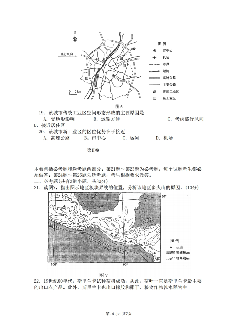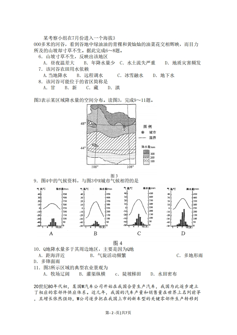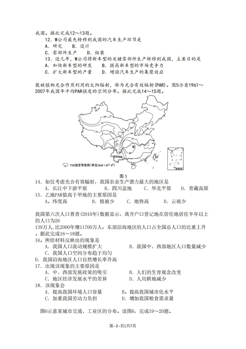 2011年普通高等学校招生全国统一考试(海南卷)地理第1卷一、选择题(本题共有20小题,每小题3分,共60分。在每小题给出的四个选项中,只有一项最符合题目要求。)图1显示的长江大桥创造了多项世界记录:最大主跨(1088米)、最深桥基、最高桥塔和最长拉索。建造该桥经历的挑战是气象条件差(面临台风等的威胁)、水文条件复杂(江面宽,水深,浪高)、基岩埋藏深(达300米)、航运密度高等。据此完成1~2题。1.该大桥位于A.湖北B.江西图1C.安徽D.江苏2.该桥主跨度大是为了A.保证通航顺畅B.降低施工成本C.减轻台风影响D.缓和海潮冲击读图2,完成35题。18N图例74山峰、海拔回》河流、湖泊67066图23.图示岛屿的山脉主体走向大致为A.南北B.东西C.东北一西南D.西北一东南4.根据图示信息可以判断出A.甲、乙两河流汛期均出现在夏季B.平均流速甲河较乙河快C.含沙量甲河较乙河大D.流量甲河较乙河大5.甲河流域处于A.热带雨林带B.亚热带常绿阔叶林带C,热带草原带D.亚热带常绿硬叶林带第-1-页|共7页某考察小组在7月份进入一个海拔3000多米的河谷,看到谷地中绿油油的青稞和黄灿灿的油菜花交相辉映,而目力所及的山坡却寸草不生。据此完成6~8题。6.山坡寸草不生,反映出该地区A.昼夜温差大B.年降水量少C.水土流失严重D.地质灾害频发7.该河谷农田用水依赖A.当地降水B.远程调水C.冰雪融水D.地下水8.该河谷可能位于的省区简称是A.甘B.新C.藏D.滇图3表示某区域降水量的空间分布。读图3,完成9~11题。图例©城市国界降水量加四300200100100108图39.图4中的气候资料,与图3中R城市气候相符的是气速℃降水量m降水量m障水量m4504504504504003040004003020300025008-10201501-3040AB图410.Q地降水量多于其周边地区,主要是因为Q地A.距海洋近B.气旋活动频繁C,多地形雨D.多锋面雨11.图3所示区域的典型农业景观为A.牧场辽阔B.灌渠纵横c.陡坡梯田D.水田密布20世纪80年代初,某国W汽车公司开始在我国合资生产汽车,我国为此逐步建立了相应的零部件供应体系。近几年,我国的汽车产量和销售量在世界上名列前茅,且增长依然强劲,W公司逐步把在我国上市的新车型的关键零部件生产转移到第-2-页|共7页