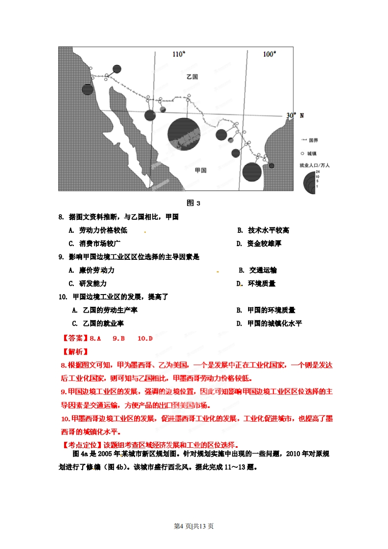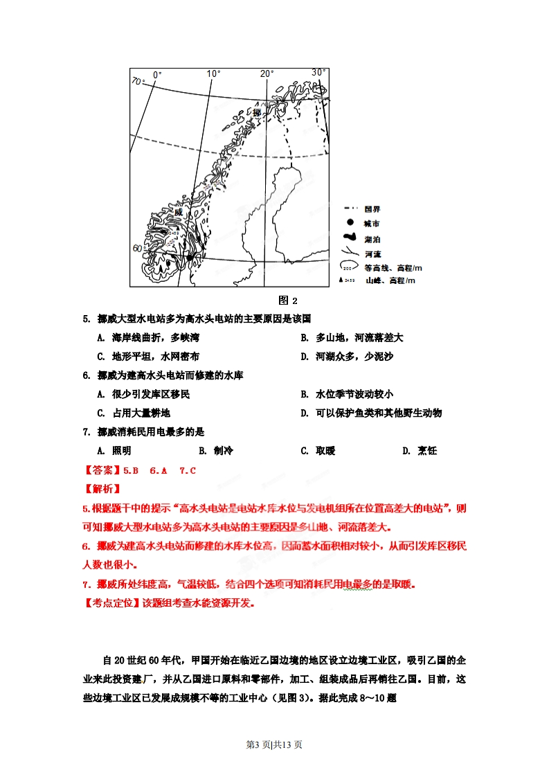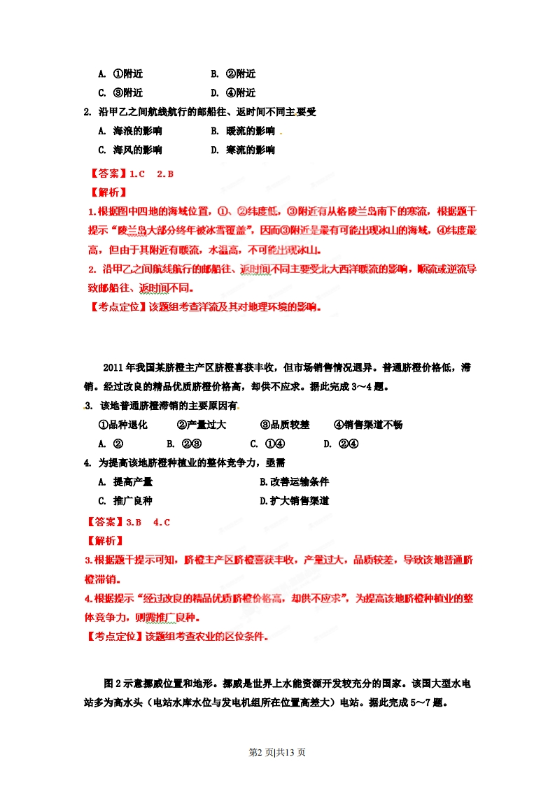 2012年普通高等学校招生全国统一考试(海南卷)地理解析【试卷总评】该套试题考查知识全面,难度适宜,符合新课标地理高考特点和要求,是一套命题质量很高的试题。选择题,命题紧紧抓住地理学科本身的学科特点以及能力要求,考查学生对地理基本原理的理解和判断能力,通过图表考查学生正确获取地理信息和理解运用的能力,20道选释愿中,共有7幅图,人文地理和自然地理的考查比重各相当。必考愿以区域地理为背景材料来命题,重点考查学生对材料阅读理解和综合分析的能力,问题设计直接明确,对学生审惠的要求较低,问唐都能明确指出答惠方向和角度,如“根据图文资料,分别简述基隆冬、夏半年都多雨的原因”,“根据图文资料,分别简述基隆冬、夏半年都多雨的原因”;选考愿部分,难度相对较低,重点考查获取材料中有用地理信息的能力,结合材料和所学知识进行简单知识迁移的能力。第I卷(选择题)本卷共20小题,每小题3分。在每小题给出的四个选项中,只有一项是符合题目要求的。图1中格陵兰岛大部分终年被冰雪覆盖,甲、乙分别是北美洲和英国的港口,甲乙之间的虚线示意航线。十八世纪邮政长官富兰克林调查发现,沿北美洲和英国之间航线航行的邮船,往、返航程耗时明显不同。据此完成1~2题。北极圈格陵兰岛40图11.图1中最有可能出现冰山的海域在第1页共13页A.①附近B.②附近C.⑧附近D.④附近2.沿甲乙之间航线航行的邮船往、返时间不同主要受A海浪的影响B.暖流的影响C.海风的影响D.寒流的彩响【答案】1.C2.B【解析】1.根据图中四地的海域位置,①、②纬度低,③附近有从格陵兰岛南下的寒流,根据题干提示“陵兰岛大部分终年被冰雪覆盖”,因而③附近是最有可能出现冰山的海核,④韩度最高,但由于其附近有暖流,水温高,不可能出现次山.2.沿甲乙之间航线航行的邮船往、返时间不同主要受北大西洋暖流的影响,流或逆流导致邮船往、返间不同.【考点定位】该题组考查祥流及其对地理环境的影响.2011年我国某脐橙主产区脐澄喜获丰收,但市场销售情况迥异。普通脐橙价格低,滞销。经过改良的精品优质脐橙价格高,却供不应求。据此完成3~4愿。3。该地普通脐橙滞销的主要原因有①品种退化②产量过大③品质较差④销售渠道不畅A②B.②⑧C.①④D.②④4,为提高该地脐橙种植业的整体竞争力,亚需A.提高产量B.改普运输条件C.推广良种D.扩大销售渠道【答案】3.B4.C【解析】3.根据题干提示可知,脐橙主产区序橙喜获丰收,产量过大,品质较差,导致该地普通序橙滞销。4.根据提示“经过改良的精品优质脐橙价格高,却供不应求”,为提高该地脐检种植业的整体竞争力,则需推广良种。【考点定位】该题组考查农业的区位条件.图2示意都威位置和地形。都威是世界上水能资源开发较充分的国家。该国大型水电站多为高水头(电站水库水位与发电机组所在位置高差大)电站。据此完成5~7题。第2页共13页