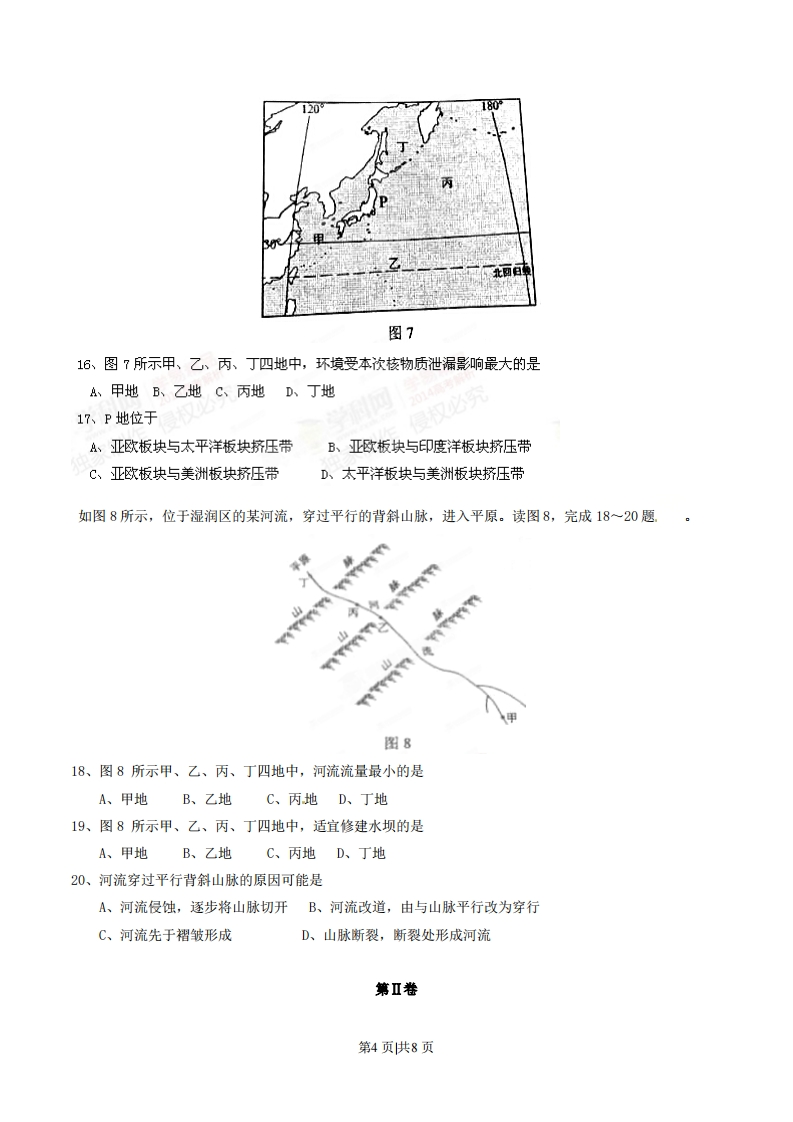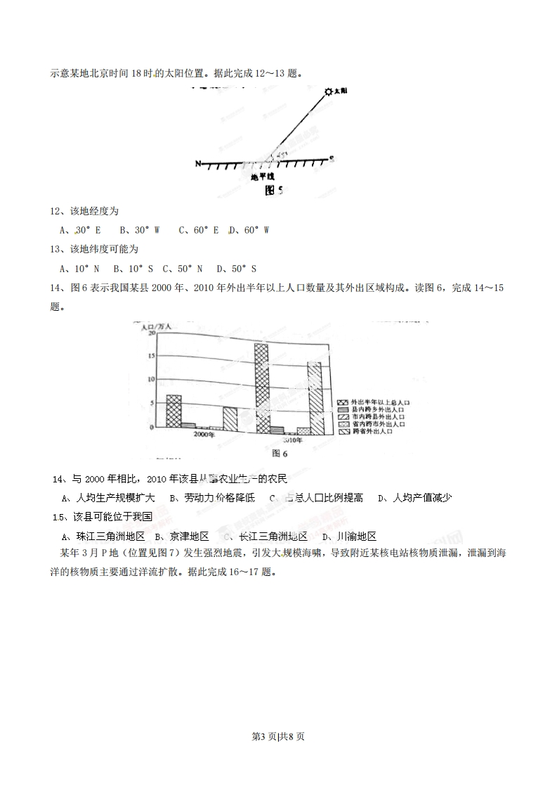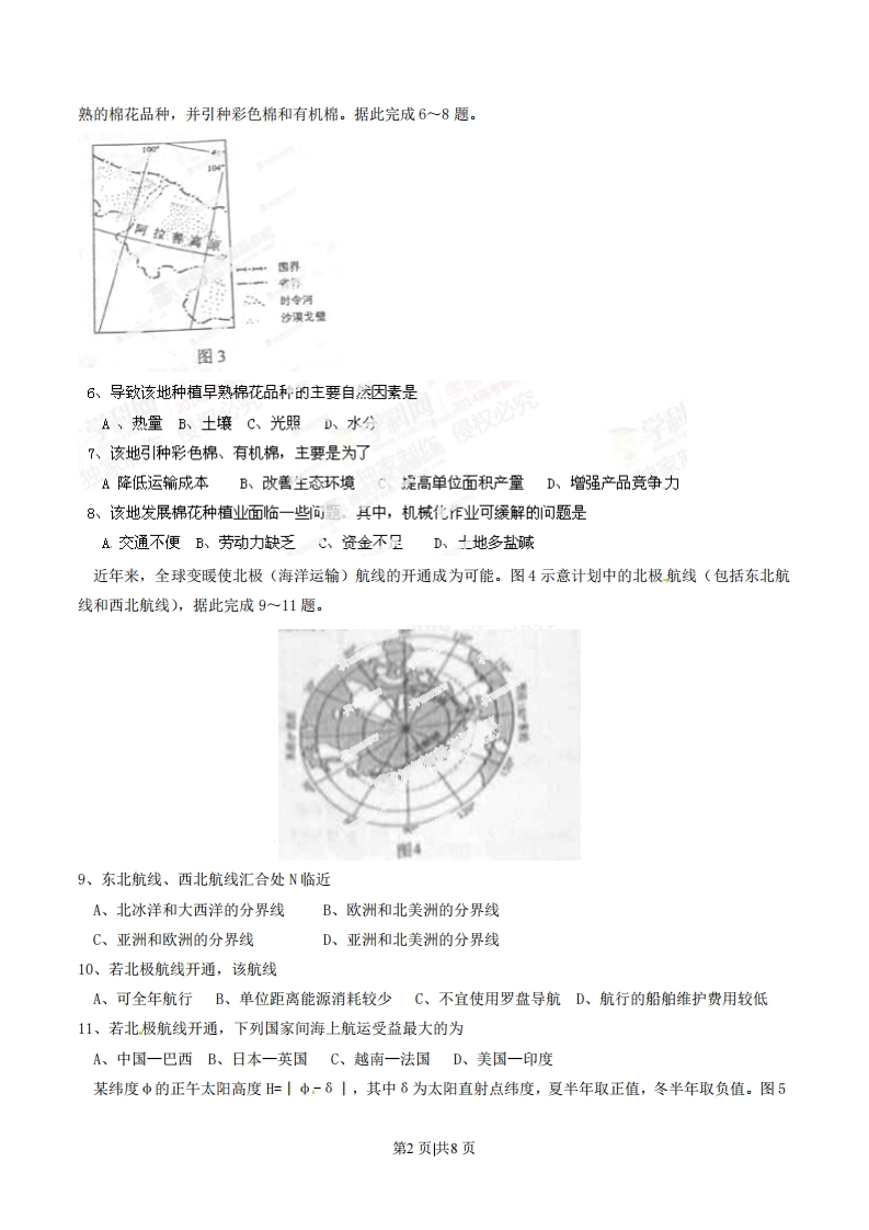 2014年普通高等学校招生全国统一考试(海南卷)文科综合地理第I卷本卷共20小题,年小题3分,在年小题给出的四个选项中,只有一项是符合题目要求的。一些跨国企业通过在国际互联网上发布订单的方式,将产品的制造环节转移给承接订单的企业。图I示意其一般模式。该模式中,制造工厂的国际转移速度较快。据此完成1~3题。发翠企量接单企业接单企业工厂其他工厂,钉单流向图11、在图示模式中A、发单企业集中在亚洲B、接单企业主要分布在发达国家C、产品全部在接单企业的工厂制造D、利润随订单流向逐级递减2、从事下列产业的跨国企业,适于采用图示模式的是A、普通服装制造B、汽车制造C、金属治炼D、甘蔗制糖3、在图示模式中,导致制造工厂国际转移速度较快的主要因素是A、原材料价格B、交通条件C、工人工资、市场甲地(位置见图2)气温年较差较小,58月降水希少。据此完减4~5题。4550出/程国河速200等燕线知图2虫家4、甲地气温年较差较小的主要原因是A、海拔较高B、纬度较低C、距海较远D、植被较好5、甲地5~8月降水稀少的主要原因是A、处在盛行西风背风坡B、受副热带高气压控制C、受干燥的东北信风影响D、受高纬干冷气流影响棉花耐旱,耐盐碱,喜光照。近年来,阿拉善高原(位置见图3)采用滴灌技术和机械化作业,种植早第1页供8页熟的棉花品种,并引种彩色棉和有机棉。据此完成6~8题。国界中时令河沙漂龙量图36、导致该地种植早熟棉花品种的主要自因素是考A、热量B、土壤C、光照D、水分权必究7、该地引种彩色棉、有机棉,主要是为了A降低运输成本B、改善生态环境C、提高单位面积产量D、增强产品竞争力8、该地发展棉花种植业面临一些可题。其中,机械化业可缓解的问题是A交通不便B、劳动力缺乏:、资金不卫D、上地多盐碱近年来,全球变暖使北极(海洋运输)航线的开通成为可能。图4示意计划中的北极航线(包括东北航线和西北航线),据此完成9~11题。9、东北航线、西北航线汇合处N临近A、北冰洋和大西洋的分界线B、欧洲和北美洲的分界线C、亚洲和欧洲的分界线D、亚洲和北美洲的分界线10、若北极航线开通,该航线A、可全年航行B、单位距离能源消耗较少C、不宜使用罗盘导航D、航行的船舶维护费用较低11、若北极航线开通,下列国家间海上航运受益最大的为A、中国一巴西B、日本一英国C、越南一法国D、美国一印度某纬度中的正午太阳高度=|中-8丨,其中6为太阳直射点纬度,夏半年取正值,冬半年取负值。图5第2页供8页