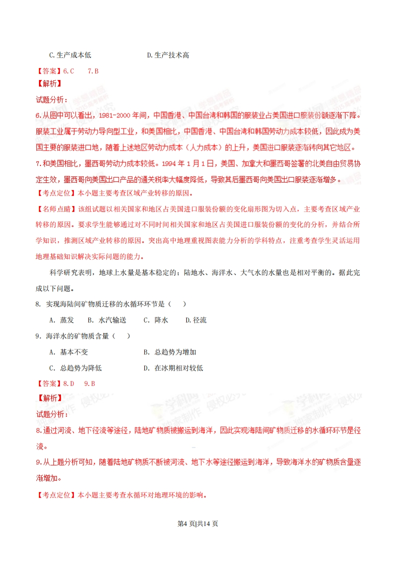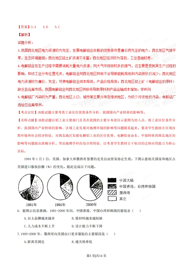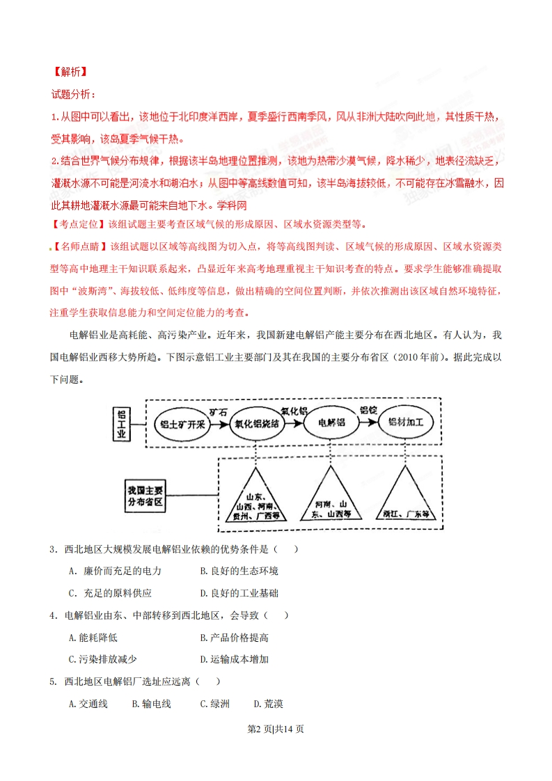 2015年普通高等学校招生全国统一考试(海南卷)地理注意事项:1.本试卷分第丨卷(选择题)和第川卷(非选择题)两部分。答题前,考生务必在将自己的姓名、考生号填写在答题卡上。2.回答第ㄧ卷时,选出每小题选出答案后,用铅笔把答题卡上对应题目的答案标号涂黑,如需改动,用橡皮擦干净后,再选涂其他答案标号。写在试卷上无效。3.回答第川卷时,将答案卸载答题卡上,写在试卷上无效。4.考试结束,将本试卷和答题卡一并交回。第I卷本卷共20小题,每小题3分,在每小题给出的四个选项中,只有一项是符合题目要求的。下图所示半岛夏季沿海地区气温可达46℃,内陆则高达49℃。读图,完成以下问题。5456波26斯湾25-200-C200)等高线/m1.该半岛夏季干热的主要原因是()A.沿岸暖流的增温作用B.受干热的西北风影响C.背风坡增温效应较强D.受干热的西南风影响2.该半岛耕地灌溉水源主要来自()A.河流水B.冰雪融水C.地下水D.湖泊水【答案】1.D2.C第1页共14页【解析】试题分析:1,从图中可以看出,该地位于北印度洋西岸,夏季盛行西南季风,风从非州大陆吹向此地,其性质干热,受其影响,该岛夏季气候干热。2.结合世界气候分布规律,根据该半岛地理位置推测,该地为热带沙漠气候,降水稀少,地表径流缺乏,灌既水源不可能是河流水和湖泊水;从图中等高线数值可知,该半岛海拔较低,不可能存在冰雪融水,因此其耕地灌溉水源最可能来自地下水。学科网【考点定位】该组试题主要考查区域气候的形成原因、区域水资源类型等。,【名师点睛】该组试题以区域等高线图为切入点,将等高线图判读、区域气候的形成原因、区域水资源类型等高中地理主干知识联系起来,凸显近年来高考地理重视主干知识考查的特点。要求学生能够准确提取图中“波斯湾”、海拔较低、低纬度等信息,做出精确的空间位置判断,并依次推测出该区域自然环境特征,注重学生获取信息能力和空间定位能力的考查。电解铝业是高耗能、高污染产业。近年来,我国新建电解铝产能主要分布在西北地区。有人认为,我国电解铝业西移大势所趋。下图示意铝工业主要部门及其在我国的主要分布省区(2010年前)。据此完成以下问题。铝矿石氧化铝铝镜氧化铝烧结电解铝铝材加工亚铝土矿开采我国主要分布省区山东、仙西、河南、河南、山/量州、广西得东、山西等/新江、广东锦3.西北地区大规模发展电解铝业依赖的优势条件是(A.廉价而充足的电力B.良好的生态环境C.充足的原料供应D.良好的工业基础4.电解铝业由东、中部转移到西北地区,会导致()A.能耗降低B.产品价格提高C.污染排放减少D.运输成本增加5.西北地区电解铝厂选址应远离()A.交通线B.输电线C.绿洲D.荒漠第2页共14页