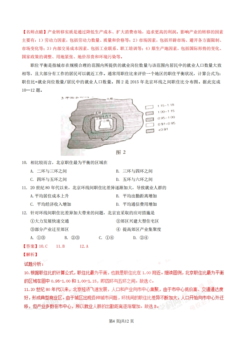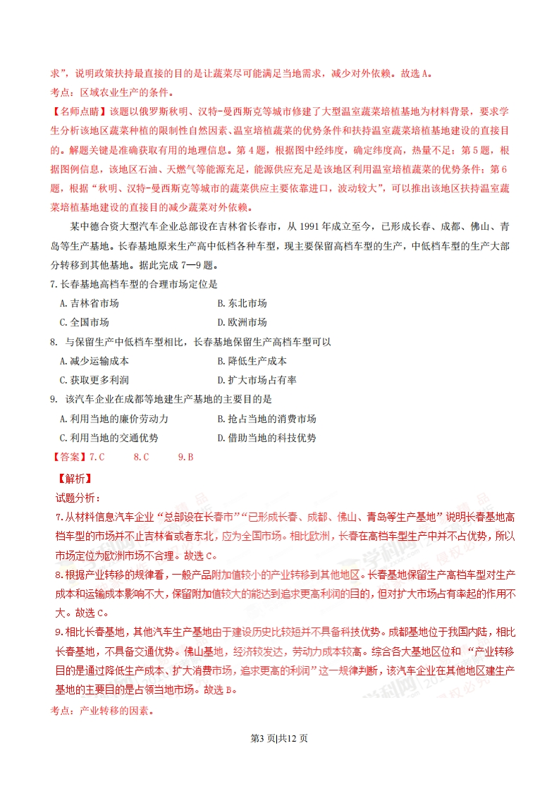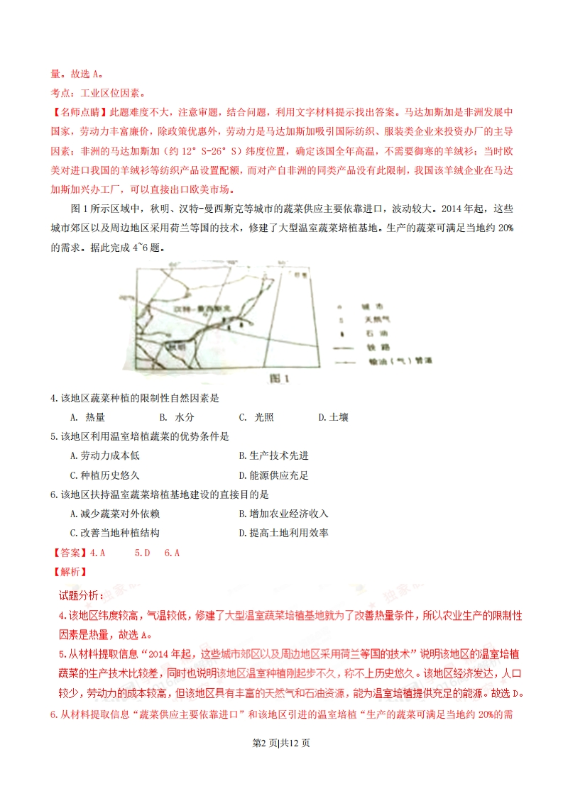 2016年普通高等学校招生全国统一考试(海南卷)地理注意事项1:本试卷分第I卷(选择题)和第Ⅱ卷(非选择题)两部分。答题前,考生务必将自己的姓名、准考证号填写在答题卡上。2.回答第Ⅱ卷时,选出每小题答案后,用铅笔把答题卡上对应题目的答案标号涂黑。如需改动,用橡皮擦干净后,再选途其他答案标号,写在本试卷上无效。3.回答第Ⅱ卷时,将答案写在答题卡上,写在本试卷上无效。4.考试结束后,将本试卷和答题卡一并交回。第I卷本卷共20小题,每小题3分。在每小题给出的四个选项中,只有一项是符合题目要求的。非洲的马达加斯加(约12°S-26°S)于1991年开设免税工业区,吸引国际投资,产业以纺织、普通服装制造为主。1997年,我国某羊绒企业在该免税工业区投资办厂,生产羊绒衫等纺织品,产品直接面向欧美市场。当时欧美对进口我国的羊绒衫等纺织产品设置配额,而对产自非洲的同类产品没有此限制。据此完成1-3题.1.除政策优惠外,马达加斯加吸引国际纺织、服装类企业来投资办厂的主导因素是A.交通B.劳动力C.资源D.技术2.导致马达加斯加对羊绒衫几乎没有市场需求的主要因素是A.居民收入B.文化传统C.国家政策D.气候3.当时,我国该羊绒企业在马达加斯加兴办工厂,主要目的是A.增加产品销量B.接近消费市场C.提高设计水平D.增加当地就业【答案】1.B2.D3.A【解析】试题分析:1.纺织、普通服装制造企业是芳动力密集型产业。非州吗达加斯加经济发展水平较低,技术水平相对较低,交通通达度较差,加上岛屿面积不大,纺织和服装的原料相对较少,但却有大量廉价的劳动力,所以吸引国际在此投资动厂的主导因素是芳动力。故选B。2.根据马达加斯加的纬度(约12°s26°s)判断,低纬度,终年气温较高,所以当地对羊绒市场需求很小。故选D。3.相比我国,马达加斯加的设计水平不高。我国在马达加斯加办厂,由于“产品直接面向欧美市场”,会远离了部分消费市场:可以增加当地就业,但不是主要目的。从材料提取信息“当时欧美对进口我国的羊绒衫等纺织产品设置配额,而对产自非洲的同类产品没有此限制”说明我国在该地兴办工厂的主要目的是增加销第1页共12页量。故选A考点:工业区位因素【名师点睛】此题难度不大,注意审题,结合问题,利用文字材料提示找出答案。马达加斯加是非洲发展中国家,劳动力丰富廉价,除政策优惠外,劳动力是马达加斯加吸引国际纺织、服装类企业来投资办厂的主导因素:非洲的马达加斯加(约12°S-26°S)纬度位置,确定该国全年高温,不需要御寒的羊绒衫:当时欧美对进口我国的羊绒衫等纺织产品设置配额,而对产自非洲的同类产品没有此限制,我国该羊绒企业在马达加斯加兴办工厂,可以直接出口欧美市场。图1所示区域中,秋明、汉特-曼西斯克等城市的蔬菜供应主要依靠进口,波动较大。2014年起,这些城市郊区以及周边地区采用荷兰等国的技术,修建了大型温室蔬菜培植基地。生产的蔬菜可满足当地约20%的需求。据此完成46题。美然气石确线路撞油(气)情活图14.该地区蔬菜种植的限制性自然因素是A.热量B.水分C.光照D.土壤5.该地区利用温室培植蔬菜的优势条件是A.劳动力成本低B.生产技术先进C.种植历史悠久D.能源供应充足6.该地区扶持温室蔬菜培植基地建设的直接目的是A.减少蔬菜对外依赖B.增加农业经济收入C.改善当地种植结构D.提高土地利用效率【答案】4.A5.D6.A【解析】试题分析:4.该地区纬度较高,气温较低,修建了大型温室蔬菜培植基地就为了改善热量条件,所以农业生产的限制性因素是热量,故选A。5.从材料提取信息“2014年起,这些城市郊区以及周边地区采用荷兰等国的技术”说明该地区的温室培植蔬菜的生产技术比较差,同时也说明该地区温室种植起步不久,称不上历史悠久。该地区经济发达,人口较少,芳动力的成本较高,但该地区具有丰富的天然气和石油资源,能为温室培植提供充足的能源。故选D。6.从材料提取信息“蔬菜供应主要依靠进口”和该地区引进的温室培植“生产的蔬菜可满足当地约20%的需第2页共12页