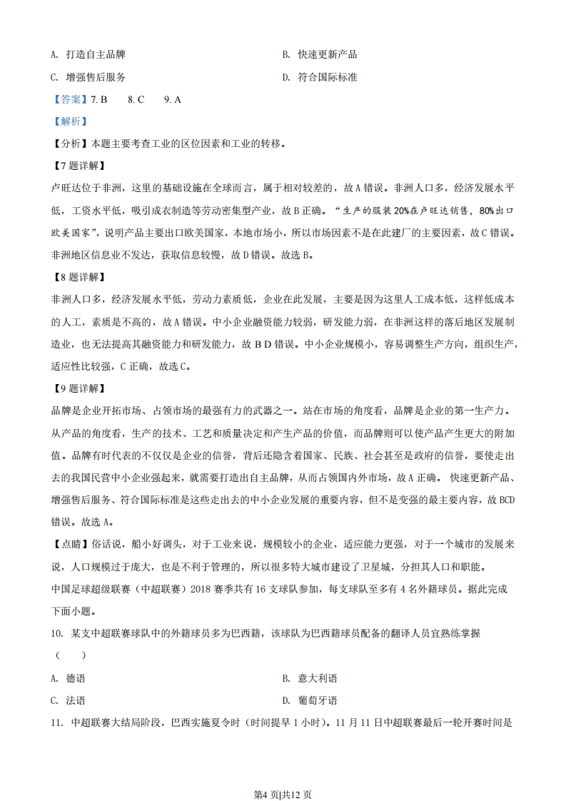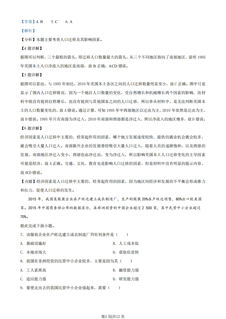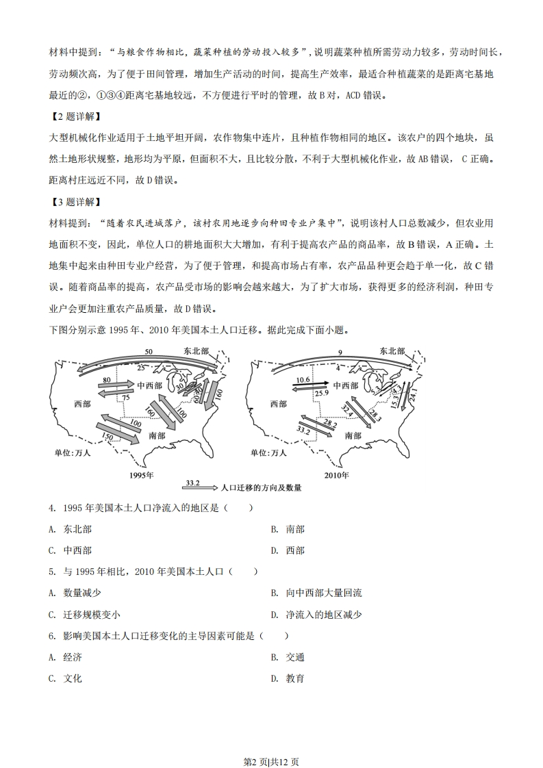 2019年海南省高考地理试题一、选择题下图示意我国中部平原地区某村庄的土地利用情况。该村将不同位置的农用地按人口进行均分,图中①②③④分别示意某农户分到的地块。该村主要种植粮食作物和蔬莱。与粮食作物相比,蔬莱种植的劳动投入较多。随着农民进城落户,该村农用地逐步向种田专业户集中。据此完成下面小题。2)③☑宅基地农用地①☐某农户的地块0200m④比例尺1.该农户分到的地块中,最便于种植蔬菜的是()A.①B.②C.③D.④2.该农户不购置大型农用机械种植农作物,主要原因是该农户的地块()A.形状规整B.地形差异小C.分散细碎D.距离村庄近3.农用地向种田专业户集中后,该村()A.农产品商品率提高B.农用地面积减少C.农产品种类多样化D.农产品质量下降【答案】1.B2.C3.A【解析】【分析】本题根据图示和材料,考查学生获取信息,分析问题,解决问题的能力。考查的知识点为农业的区位因素和生产特点。【1题详解】第1页共12页材料中提到:“与粮食作物相比,蔬莱种植的劳动投入较多”,说明蔬菜种植所需劳动力较多,劳动时间长,劳动频次高,为了便于田间管理,增加生产活动的时间,提高生产效率,最适合种植蔬菜的是距离宅基地最近的②,①③④距离宅基地较远,不方便进行平时的管理,故B对,ACD错误。【2题详解】大型机械化作业适用于土地平坦开阔,农作物集中连片,且种植作物相同的地区。该农户的四个地块,虽然土地形状规整,地形均为平原,但面积不大,且比较分散,不利于大型机械化作业,故AB错误,C正确。距离村庄远近不同,故D错误。【3题详解】材料提到:“随希农民进城落户,该村农用地逐步向种田专业户集中”,说明该村人口总数减少,但农业用地面积不变,因此,单位人口的耕地面积大大增加,有利于提高农产品的商品率,故B错误,A正确。土地集中起来由种田专业户经营,为了便于管理,和提高市场占有率,农产品品种更会趋于单一化,故C错误。随着商品率的提高,农产品受市场的影响会越来越大,为了扩大市场,获得更多的经济利润,种田专业户会更加注重农产品质量,故D错误。下图分别示意1995年、2010年美国本土人口迁移。据此完成下面小题。50东北部东北部80西部西部单位:万人单位:万人1995年2010年332之人口迁移的方向及数量4.1995年美国本土人口净流入的地区是()A.东北部B.南部C.中西部D.西部5.与1995年相比,2010年美国本土人口()A.数量减少B.向中西部大量回流C.迁移规模变小D.净流入的地区减少6.影响美国本土人口迁移变化的主导因素可能是()A.经济B.交通C.文化D.教育第2页共12页
