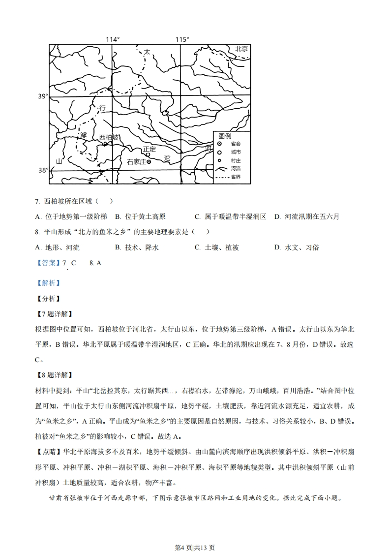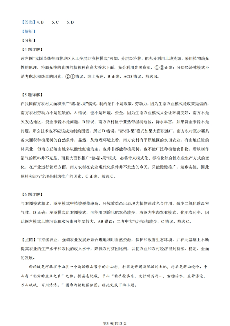 2021年海南省普通高中学业水平选择性考试地理一、选释题:本大题共20小题,每小题3分,共60分。在每小题列出的四个选项中,只有一项是符合题目要求的。2021年5月7日至10日首届中国国际消费品博览会在海口举办,展会上亮相的吉祥物“元宵”(下左图)的原型来自海南特有物种海南长臂猿。该物种在海南曾广泛分布,后濒于灭绝,1980年建立霸王岭自然保护区后,其数量已有较大增长。海南长臂猿旱季多在海拔1000米以上,雨季常到低海拔地区的树冠层活动。下右图为霸王岭的气侯资料。据此完成下面小题。607120501004080响30604010200L112123456789101112月份1.在野外追踪海南长臂猿的活动轨迹,以下方案最合理的是()A.1月,海拔1000米以下B.4月,海拔1000米以上C.7月,海拔1000米以下D.10月,海拔1000米以上2.当前,影响海南长臂猿生存和种群数量增长的因素主要表现在()A.天敌多,食物少B.热带季雨林面积不断减少C.全球变暖,病虫害增多D.栖息地破碎,彼此分割3.基于自然地理环境整体性的原理,有效保护海南长臂猿的措施是()A.发展基因技术,优化海南长臂猿种群结构B.加快道路建设,完善保护区的基础设施C.加强巡山和人工训化,保护海南长臂猿的生存环境D.加强山水林田湖草系统治理,扩大海南长臂猿的生存空间【答案】1.C2.D3.D【解析】【分析】【1题详解】第1页共13页根据材料海南长臂猿旱季多在海拔1000米以上,雨季常到低海拔地区的树冠层活动,海南为热带季风气候,10月-次年3月为旱季,410月为雨季:1月降水少,主要分布在海拔1000米以上:7月为雨季,主要分布在海拔1000米以下的区域,故A错误,C正确,4月和10月为旱季和雨季的交换的季节,其活动轨迹不易追踪,故BD错误,故选C。【2题详解】根据材料1980年建立了霸王岭自然保护区,生物数量增多,其食物增多,故A错误:建立自然保护区,热带季雨林面积不会不断减少,故B错误:全球气候变暖主要对中高纬度影响较大,对低纬度影响小,故C错误:读图,自然保护区中道路将其栖息地分割,影响其生存,故D正确。故选D。【3题详解】基因技术应主要针对濒临灭绝的生物种类,根据材料近些年海南长臂猿数量有所增加,不需要采用基因技术,故A错误:根据材料道路使栖息地破碎,不利于其保护,故B错误:加强巡山会破坏其生存环境,人工驯化不利于野生习性的保护,故C错误:加强山水林田湖草系统治理,改善生态环境,有利于扩大栖息地,进而扩大其生存空间,有利于其保护,故D正确。故选D。【点睛】保护生物多样性的措施:完善保护生物的法律法规:建立自然保护区:严禁滥捕乱杀、乱砍滥伐及各种破坏生态:加强防治环境污染等。图左示意我国某热带雨林地区人工多层经济林模式,图右示意我国某地区“猪沼果”模式,二者均为生态农业模式。据此完成下列小题。照明炊事卫生间沼气灯猪圈果园热沼液沼渣人蓄粪便入沁沼气池4.图左模式中能充分利用的自然资源是()①土地②水③光照④热量A.①②B.①③C.②④D.③④5.目前,制约图右模式在我国南方农村大面积推广的主要因素是()A.政策、劳动力B.环境、资金C.原料、运行管理D.降水、技术6.与图右模式相比,图左模式的环境效益凸显在()A.减少土壤污染B.减少水污染C.减少大气污染D.减少温室气体第2页共13页