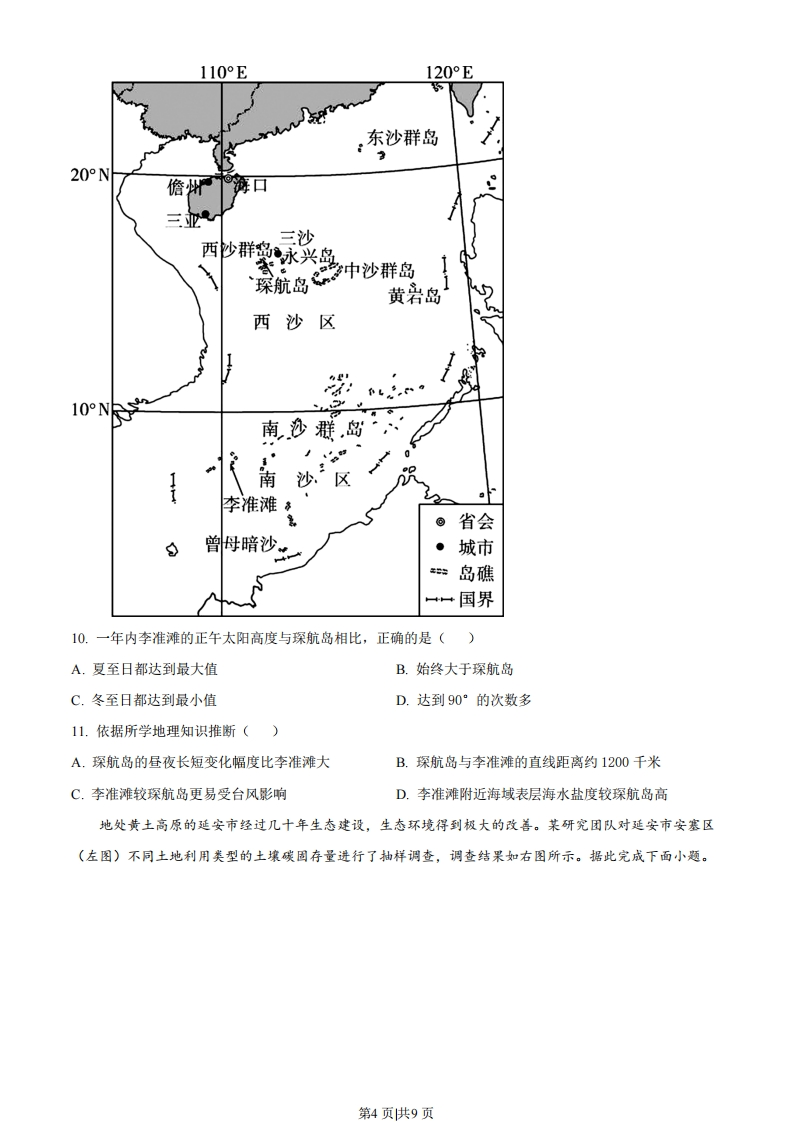 海南省2022年普通高中学业水平选择性考试地理本试卷共6页,19小题,试卷满分100分,考试时间90分钟。注意事项:1.答卷前,考生务必先将自已的姓名、考生号、考场号和座位号填写在答题卡上。将条形码横贴在答题卡右上角“条形码粘贴处”。2.作答选择题时,选出每小题答案后,用2B铅笔把答题卡上对应题目选项的答案信息点涂黑;如需改动,用橡皮擦干净后,再选涂其他答案。答案不能答在试卷上。3。非选释题必须用黑色字迹的钢笔或签字笔作答,答案必须写在答题卡上各题目指定区域内相应位置上。如需改动,先划掉原来的答案,然后再写上新答案;不准使用铅笔和涂改液。不按以上要求作答无效。4.考生必须保持答题卡整洁。考试结束后,将试卷和答题卡一并交回。一、选释题:本题共15小题,每小题3分,共45分。在每小题给出的四个选项中,只有一项是符合题目要求的。下图示意撒哈拉沙漠南缘某国1965一2005年间的城镇化发展状况。据此完成下面小题。1008060840200196519701975198019851990199520002005(年)◆第二、三产业产值比重·第二、三产业从业人口比重◆城镇化率1.下列关于该国1965一2005年间城镇化发展状况的描述,正确的是()A.第一产业产值高B.第一产业从业人口比重低第1页供9页C.第二、三产业产值比重增速快D.城镇人口占总人口比重低2.该国该时期()A.工业基础雄厚B.服务业水平高C.就业机会充足D.农业生产落后在治理吐鲁番风沙的过程中,中国科学院的科研人员克服各种困难,建设了吐鲁番沙漠植物园,引种和收集荒漠区的植物,开展繁殖培育工作。除了小部分植物因气侯等原因引种失败外,目前已成功引种栽培500多种植物。据此完成下面小题。3.春季露天苗圃栽培中面临的最大困难是()A.大风B.严寒C.千旱D.雨雪4.引种栽培失败的荒漠植物最有可能源于()A.哈萨克斯坦B.沙特阿拉伯C.阿根廷D.蒙古5.建设吐鲁番沙漠植物园的主要目的是()①繁殖培育固沙植物,促进荒漠化防治②繁殖培育观赏植物,发展沙漠旅游业③繁殖培育药用植物,发展沙漠产业④提取抗病耐寒基因,丰富青藏地区作物品种A①③B.①④C.②③D.②④下图为2022年4月20日20时亚洲部分地区海平面等压线分布图(单位:百帕)。据此完成下面小题。60°E80°E100°E120°E140°E01501040°N1010@i015000015丙01020°N1/0003015606.据图,此时()A.甲地大风降温B.乙地北风劲吹C.丙地阴雨连绵D.丁地风大浪高7.4月21日上午,北京地面能见度较高,高空出现浮尘。浮尘升空的动力来源是()第2页共9页