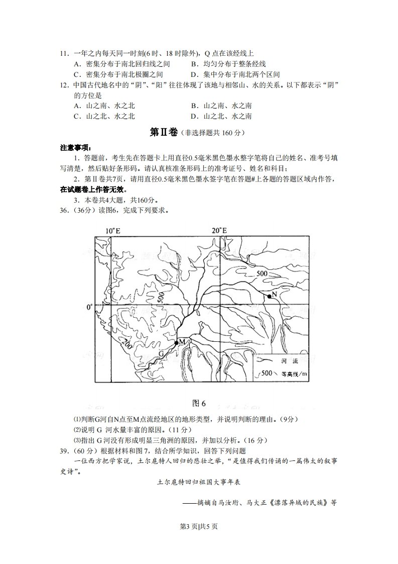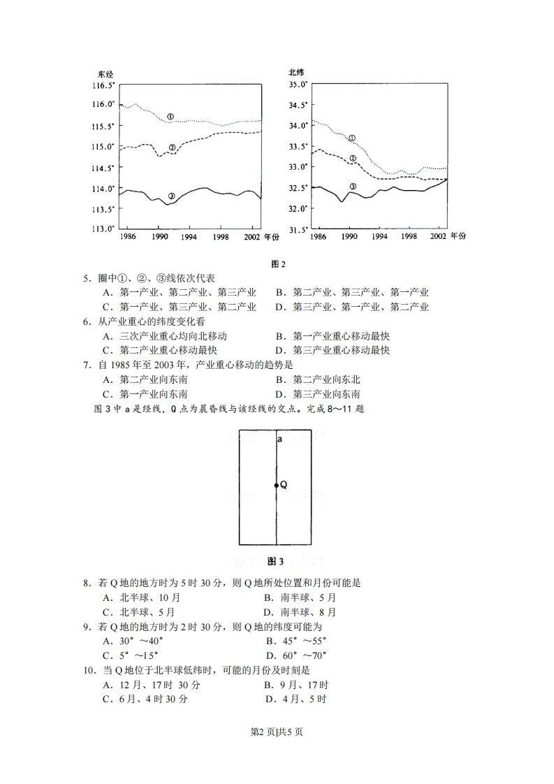 2008年普通高等学校招生全国统一考试文科综合第I卷(选择题共140分)本卷共35小题,每小题4分,共140分。在每小题给出的四个选项中,只有一项符合题目要求。张某承包了0.5公顷耕地.种植结枸变化如图1。当地1月平均气温3℃。完成1~2题。图例☐水稻Z☑蔬菜留花卉田油菜1985年1995年2005年8密其他图11.张某承包的耕地可能位于A.珠江三角洲B.太湖平原C.华北平原D.松嫩平原2.导致种植结构变化的主要因素是A.市场需求B.生产经验C.自然条件D.国家政策下表为我国某城市人口资料。读下表完成3~4题。1982年1990年2000年总人口(万人)35167701014岁(%)35.2714.638.515~64岁(%)58.3683.1590.3965岁及以上(%)6.372.221.113.该城市自1982年至2000年A,人口自然增长率很高,人口增长迅速B.人口出生率增高,人口老龄化问题得到缓解C.人口出生率大幅度降低,人口死亡率大幅度增高D.人口增长率很高,有大量青壮年人口迁入4.该城市是A.南京B.深圳C.西安D.沈阳产业重心是区域产业产值空间分布的重心。图2示意中国三次产业重心的经、纬度变化(不含台湾、香港、澳门的统计资料)。完成5~7题。第1页供5页东经北纬116.535.0116.034.5115.534.0115.033.5114.533.0114.032.5113.532.0113.0°31.519861990199419982002年份19861990199419982002年份图25.圈中①、②、③线依次代表A.第一产业、第二产业、第三产业B.第二产业、第三产业、第一产业C.第一产业、第三产业、第二产业D.第三产业、第一产业、第二产业6.从产业重心的纬度变化看A.三次产业重心均向北移动B.第一产业重心移动最快C.第二产业重心移动最快D.第三产业重心移动最快7.自1985年至2003年,产业重心移动的趋势是A.第二产业向东南B.第二产业向东北C.第一产业向东南D.第三产业向东南图3中a是经线,Q点为晨昏线与该经线的交点。完成8~11题图38.若Q地的地方时为5时30分,则Q地所处位置和月份可能是A.北半球、10月B.南半球、5月C.北半球、5月D.南半球、8月9.若Q地的地方时为2时30分,则Q地的纬度可能为A.30°-40B.45°~55C.5°-15D.60°-70°10.当Q地位于北半球低纬时,可能的月份及时刻是A.12月、17时30分B.9月、17时C.6月、4时30分D.4月、5时第2页供5页