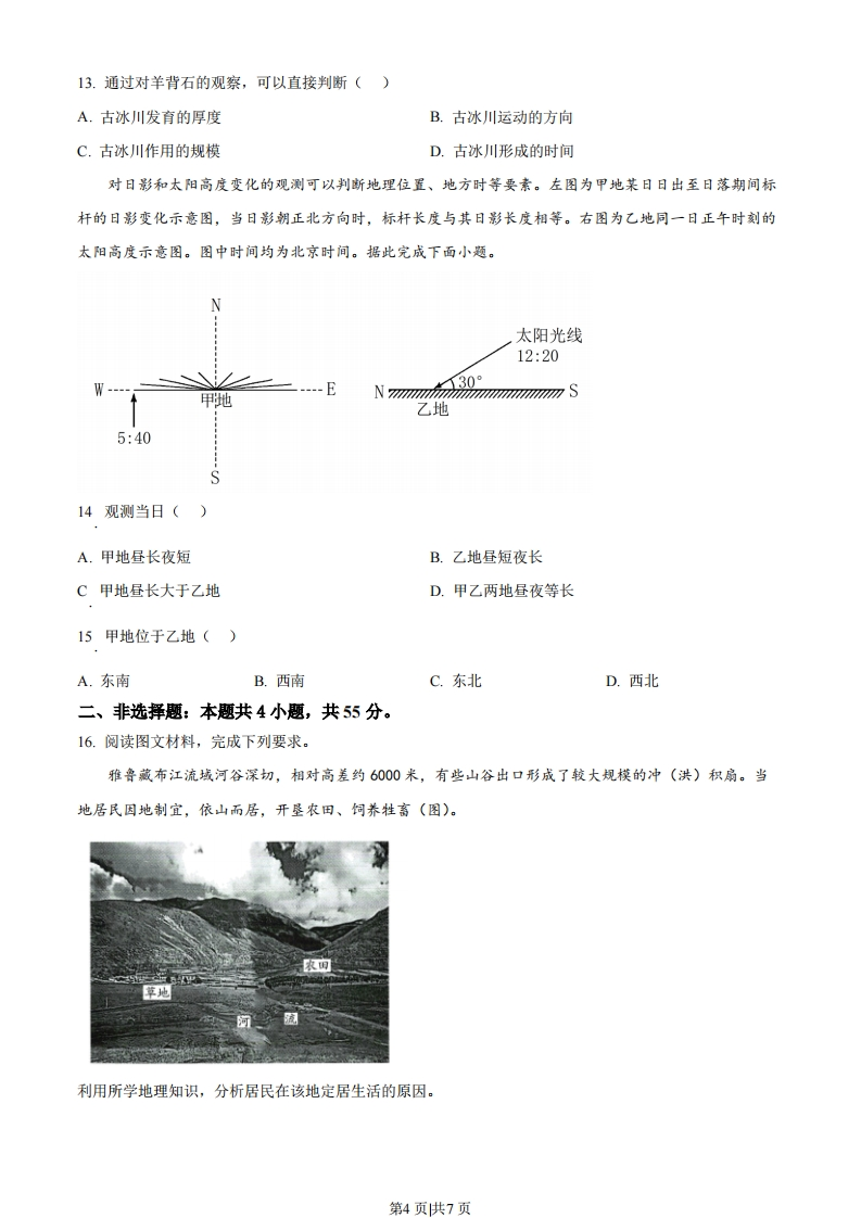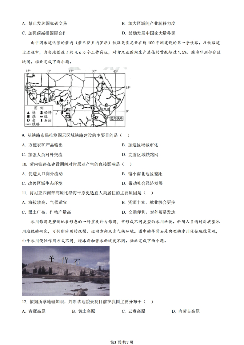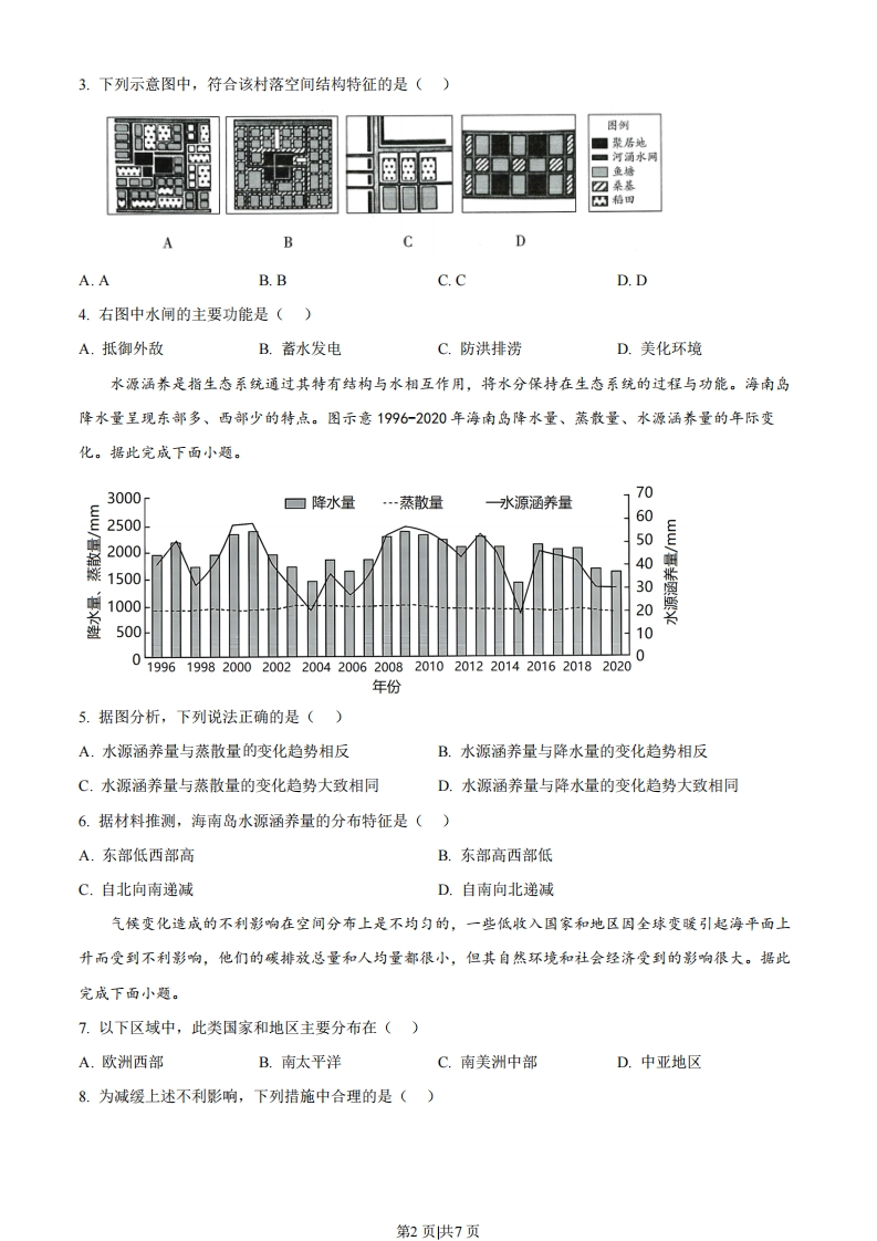 海南省2023年普通高中学业水平选择性考试地理一、选择题:本题共15小题,每小题3分,共45分。在每小题给出的四个选项中,只有一项是符合题目要求的。人口重心是指区城空间中人口数量可维持空间均衡的受力点,其时序变化可反映区城发展的空间演变轨迹。随着西部大开发、中部崛起等国家发展战略的实施,区域内人口重心迁移明显。图示意1978一2018年我国中部和西部地区人口重心迁移轨迹。据此完成下面小题。2008201320022018201320182008203192178199819971988拉1993图例1988回西部地区口中部地区1983西部地区女首都中部地区01020km。市。人口重心05001000km02km19781.下列关于20032008年我国中部和西部地区人口重心迁移的描述,正确的是()A.人口重心移动速度西部小于中部B.人口重心移动距离西部大于中部C.中部人口重心向西北移动D.西部人口重心向东南移动2.对我国中部地区1978-2018年人口重心迁移影响相对较小的是()A.中部地区人口外流B.中部地区城市群发展C.中部地区跨境贸易D.中部地区矿产资源开发岭南某古村落地处滨水低地,因势而建,内修墩塘,外防水患,形成具有“堤围护村,墩塘相间,墩上立宅,基上种桑,塘中养鱼”景观特征的散村聚落结构(左图)。右图为该古村落的提围及水闸分布示意图。据此完成下面小题。0800面水第1页供7页3.下列示意图中,符合该村落空间结构特征的是()图例聚居地恩闲■河滴水网刀桑基BDA.AB.BC.CD.D4.右图中水闸的主要功能是()A.抵御外敌B.蓄水发电C.防洪排涝D.美化环境水源涵养是指生态系统通过其特有结构与水相互作用,将水分保持在生态系统的过程与功能。海南岛降水量呈现东部多、西部少的特点。图示意1996-2020年海南岛降水量、蒸散量、水源涵养量的年际变化。据此完成下面小题。300070☐降水量一蒸散量水源涵养量A250060200050150030100025000019961998200020022004200620082010201220142016201820200年份5.据图分析,下列说法正确的是()A.水源涵养量与蒸散量的变化趋势相反B.水源涵养量与降水量的变化趋势相反C.水源涵养量与蒸散量的变化趋势大致相同D.水源涵养量与降水量的变化趋势大致相同6.据材料推测,海南岛水源涵养量的分布特征是()A.东部低西部高B.东部高西部低C.自北向南递减D.自南向北递减气候变化造成的不利影响在空间分布上是不均匀的,一些低收入国家和地区因全球变暖引起海平面上升而受到不利影响,他们的碳排放总量和人均量都很小,但其自然环境和社会经济受到的影响很大。据此完成下面小题。7.以下区域中,此类国家和地区主要分布在()A.欧洲西部B.南太平洋C.南美洲中部D.中亚地区8.为减缓上述不利影响,下列措施中合理的是()第2页供7页