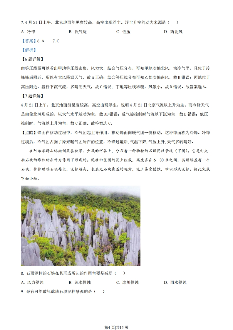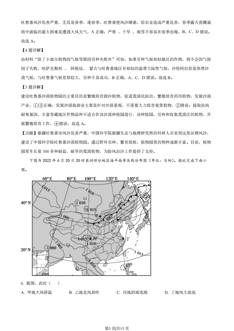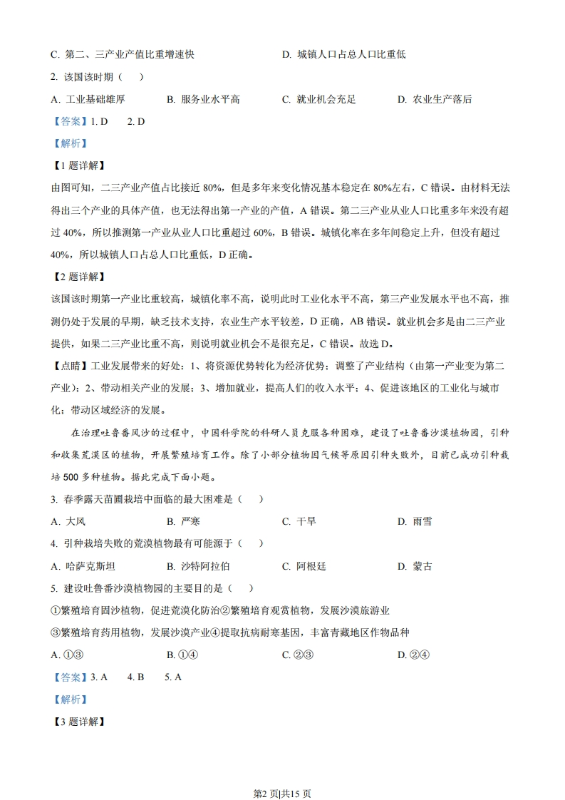 海南省2022年普通高中学业水平选择性考试地理本试卷共6页,19小题,试卷满分100分,考试时间90分钟。注意事项:1.答卷前,考生务必先将自已的姓名、考生号、考场号和座位号填写在答题卡上。将条形码横贴在答题卡右上角“条形码粘贴处”。2.作答选择题时,选出每小题答案后,用2B铅笔把答题卡上对应题目选项的答案信息点涂黑;如需改动,用橡皮擦干净后,再选涂其他答案。答案不能答在试卷上。3。非选释题必须用黑色字迹的钢笔或签字笔作答,答案必须写在答题卡上各题目指定区域内相应位置上。如需改动,先划掉原来的答案,然后再写上新答案;不准使用铅笔和涂改液。不按以上要求作答无效。4.考生必须保持答题卡整洁。考试结束后,将试卷和答题卡一并交回。一、选释题:本题共15小题,每小题3分,共45分。在每小题给出的四个选项中,只有一项是符合题目要求的。下图示意撒哈拉沙漠南缘某国1965一2005年间的城镇化发展状况。据此完成下面小题。1008060840200196519701975198019851990199520002005(年)◆第二、三产业产值比重·第二、三产业从业人口比重◆城镇化率1.下列关于该国1965一2005年间城镇化发展状况的描述,正确的是()A.第一产业产值高B.第一产业从业人口比重低第1页共15页C.第二、三产业产值比重增速快D.城镇人口占总人口比重低2.该国该时期()A.工业基础雄厚B.服务业水平高C.就业机会充足D.农业生产落后【答案】1.D2.D【解析】【1题详解】由图可知,二三产业产值占比接近80%,但是多年来变化情况基本稳定在80%左右,C错误。由材料无法得出三个产业的具体产值,也无法得出第一产业的产值,A错误。第二三产业从业人口比重多年来没有超过40%,所以推测第一产业从业人口比重超过60%,B错误。城镇化率在多年间稳定上升,但没有超过40%,所以城镇人口占总人口比重低,D正确。【2题详解】该国该时期第一产业比重较高,城镇化率不高,说明此时工业化水平不高,第三产业发展水平也不高,推测仍处于发展的早期,缺乏技术支持,农业生产水平较差,D正确,AB错误。就业机会多是由二三产业提供,如果二三产业比重不高,则说明就业机会不是很充足,C错误。故选D。【点睛】工业发展带来的好处:1、将资源优势转化为经济优势:调整了产业结构(由第一产业变为第二产业):2、带动相关产业的发展:3、增加就业,提高人们的收入水平:4、促进该地区的工业化与城市化:带动区域经济的发展。在治理吐鲁番风沙的过程中,中国科学院的科研人员克服各种困难,建设了吐鲁番沙漠植物园,引种和收集荒漠区的植物,开展繁殖培育工作。除了小部分植物因气候等原因引种失败外,目前已成功引种栽培500多种植物。据此完成下面小题。3.春季露天苗圃栽培中面临的最大困难是(A.大风B.严寒C.干旱D.雨雪4.引种栽培失败的荒漠植物最有可能源于()A.哈萨克斯坦B.沙特阿拉伯C.阿根廷D.蒙古5.建设吐鲁番沙漠植物园的主要目的是()①繁殖培育固沙植物,促进荒漠化防治②繁殖培育观赏植物,发展沙漠旅游业③繁殖培育药用植物,发展沙漠产业④提取抗病耐寒基因,丰富青藏地区作物品种A.①③B.①④C.②③D.②④【答案】3.A4.B5.A【解析】【3题详解】第2页共15页