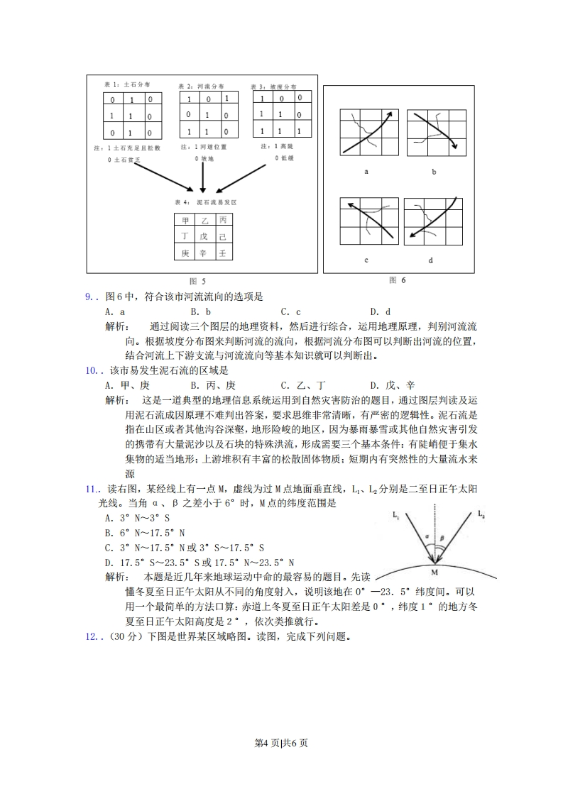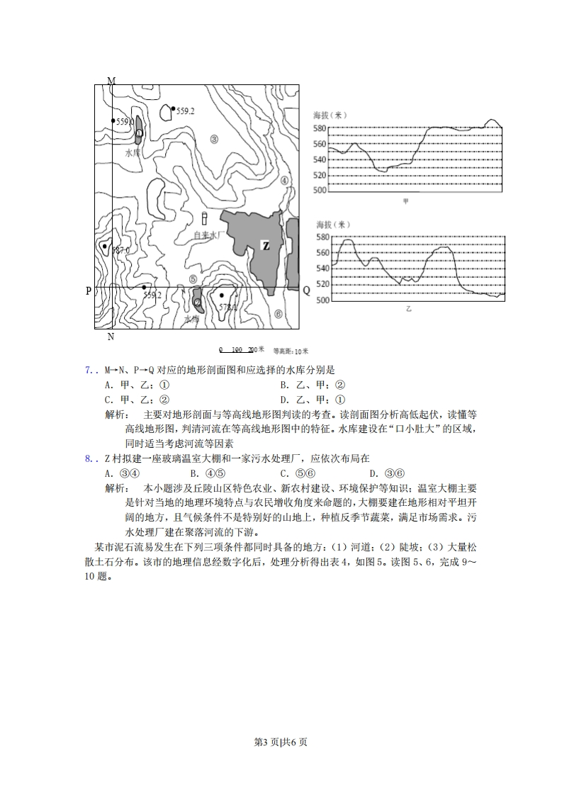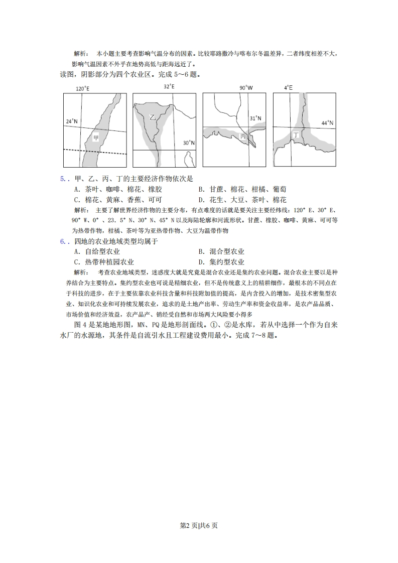 绝密★考试结束前2010年普通高等学校招生全国统一考试选择题部分共35小题,每小题4分,共140分。在每题给出的四个选项中,只有一项是符合题目要求的。右图为欧洲部分地区略图,图中四条线是重要的地理界线。完成1~2题。1..哪一条界线可能是1月0℃等温线?影响其分布的主要因素是A.甲:盛行风、洋流B.乙:纬度、地形C.丙:经度、地形D.丁:盛行风、纬度2.,“这里地质活动活跃,石灰岩层受板块挤压而变质成大理石”,此叙述所指的地区,可能接近的界线是A.甲B.乙C.丙D.丁主要考查的是板块运动及变质作用:是一道初高中知识结合的题目,这里涉及到板块运动与地质作用中的变质作用。欧洲的巴尔干半岛是有大面积的喀斯特地貌分布,该地貌的基岩是石灰岩为主,因此再结合试题材料可以判断下图为西亚三个城市的气温、降水量图。完成3一4题。气温℃降水量m气温℃降水量mm气温℃降水量mm30H30030H30030H.300202020102001020010200a0100100100-10-10-1020-20201357911月)1357911(月)1357911(月)降水量5541mm降水量230mm降水量312mm耶路撒冷(32N,35E)德黑兰(36N,51E)喀布尔(35N,69°E)3.,不论降水量多寡,三地都冬雨较多,其主要原因是冬季A.风带南移B.受印度洋影响明显C.信风强盛D.暖流带来的水汽多解析:本小趣通过气温曲线、降水柱状图判读及冬季降水成因的判读来考查气候形成因素。读三个城市的气温曲线与降水柱状图可以得出,这是一个冬雨明显的区域,冬雨是被西风带控制时,盛行西风把海洋中水汽送到陆地,且距海洋越近降水越多4.,耶路撒冷与喀布尔的夏温相当,但冬温相差约10℃,影响喀布尔冬温较低的主要因素超A.纬度B.地势C.洋流D.人类活动第1页供6页解析:本小趣主要考查影响气温分布的因素。比较耶路撒冷与喀布尔冬温差异,二者纬度相差不大,影响气温因素不外乎在地势高低与距海远近了。读图,阴影部分为四个农业区。完成5~6题。120'E32'E90W4E24'N31N44N甲30N5.,甲、乙、丙、丁的主要经济作物依次是A.茶叶、咖啡、棉花、橡胶B.甘蔗、棉花、柑橘、葡萄C.棉花、黄麻、香蕉、可可D.花生、大豆、茶叶、棉花解析:主要了解世界经济作物的主要分布,有点难度的话就是要关注主要经纬线:120°E、30°E、90°、0°、23.5°N、30°N、45°N以及海陆轮廓和河流形状。甘蔗、橡胶、咖啡、黄麻、可可等为热带作物,柑橘、茶叶等为亚热带作物、大豆为温带作物6..四地的农业地域类型均属于A.自给型农业B.混合型农业C.热带种植园农业D.集约型农业解析:考查农业地域类型,迷惑度大就是究竞是混合农业还是集约农业问趣。混合农业主要以是种养结合为主要特点。集约型农业也可说是精细农业,但不是传统意义上的精耕细作,最根本的不同点在于科技的进步,在于主要依靠农业科技含量和科技附加值的提高,是内含投入的增加,是技术密集型农业、知识化农业和可持续发展农业,追求的是土地产出率、劳动生产率和资金收益率,是农产品品质、市场价值和经济效益,农产品产、销经受自然和市场两大风险要小得多图4是某地地形图,N、PQ是地形剖面线。①、②是水库,若从中选择一个作为自来水厂的水源地,其条件是自流引水且工程建设费用最小。完成7~8题。第2页供6页