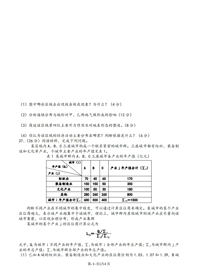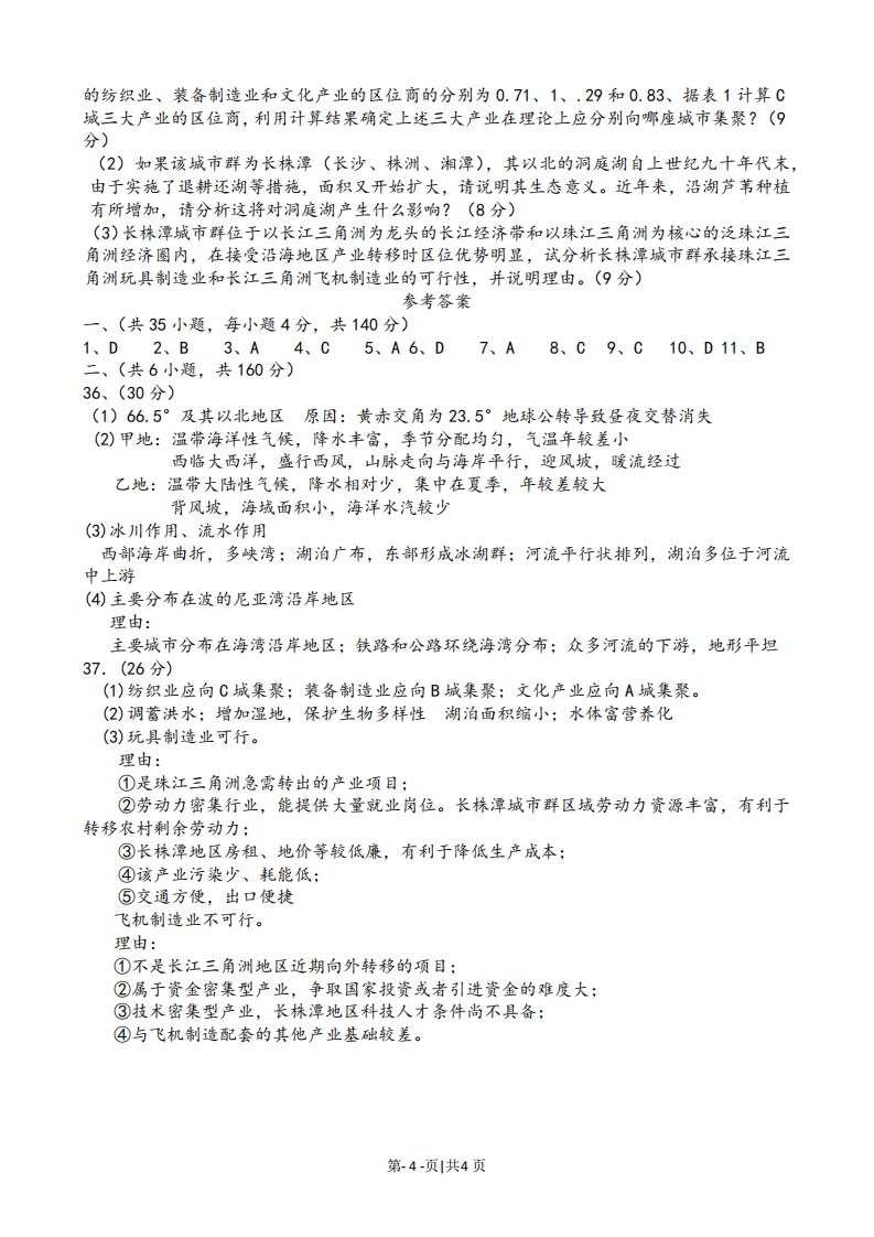 2009年普通高等等学校招生全国统一考试文科综合(淅江卷)第1卷1、读图①,②,③,④代表的土壤类型依次是有机嘴含量/⅓A、荒漠土壤,森林土壤,草原土壤B、草原土壤,荒漠土壤森林土壤C、森林土壤,草原土壤荒漠土壤D、草原土壤森林土壤,荒漠土壤专家认为,由于人类的生产活动等原因,预计到2100年全球平均增温4C5C,这对全球环境的产生重大影响。完成2~3题2对全球变暖的环境响应,叙述正确的是某地区三种土爆有机质含量坐直分布示意图A北半球热带地区降水减少:海平面上升图1B灾害性天气频繁,中国自然带北移C洋流发生变化:大部分动物栖息地发生根本本性改变D北欧影响最大:北半球亚热带地区降水增多3在节能减排中,公众可参与有利于抑制全球变暖的行动是A充分利用太阳能:尽量使用公共交通工具B采用节水措施:开发利用无污染能源C多种水稻:充分利用风能D维持能源消费结构现状;自备购物袋读图2,完成4~5题180「250f一气温402001540.101359山月)山(月150气超0.1557911月13579月园24、四地气候类型的判断,正确的是A、①温带海洋气候②亚热带季风气候B、②热带草原气候④温带季风气侯C、①温带季风气候③亚热带季风气侯D、③地中海气候④温带海洋性气候5.四季气候类型分布的叙述,正确的是A、①仅分布的北半球B、②主要分布的赤道附近C、③主要分布在纬度30°~40°的大陆西岸甲D、④主要分布在纬度30°~40°的大陆东岸河流工区读图3,完成6~7题。6.甲地有意引进一家造纸企业,正确的选项是A.布局的甲域的工业区内。B.布局在甲乙两域行政边界处。C.布局在甲域盛行风下风向的西南郊。D.不宜引进该企业。7.乙域的最佳宅区和CBD应分别布局在A.①处和⑤处B、①处和③处C、⑦处和⑤处D、③流上新甲、乙两区位示意田3第-1-页|共4页处和④处东京市目前是日本太平洋沿岸大都市带的核心城市,远郊出现许多星城。读图4回答8~9题。辆木县马县茨城县中奈川县2155n106m图城市中心区图卫星城开发区近郊发展区翻近郊绿地保护区一机动车国道困4东京成都市國空间站构示意国8、东京市城市化过程目前已处于A、中期阶段B、加速发展阶段C、高级阶段D、衰落阶段9、东京市的空间扩张模式恰城市规化带来的有益启示是A、解决大城市交通拥堵的最好方法是规划放射状交通干道。B、中心区不保留绿化带,以提高城市土地利用率。C、在基础设施,土地利用等方面实现城乡统一规划。D、乡村一城市转型的的根本动力是大都市郊区的卫星城建设。10、关于土地荒漠化的叙述,正确的是A、中国南方土地荒漠化地区生态环境尤为脆弱。B、自然因素引起的荒漠化速率比人为活动引起的要快。C、三江平原过度垦殖,土地荒漠化更加严重。D、西北地区风蚀强烈,风沙灾害比较普遍11、图5中,当a,c值相差20°时,该地的纬度值为200EA、23°NB、63°NC、43、5°ND、27°N066.5N春分夏至图5某地一年内正午太用波第川卷甲的36、(30分)读图6,完成下列问题河流☐水域主要铁路主要公路。主要城市世界莱区城示意图