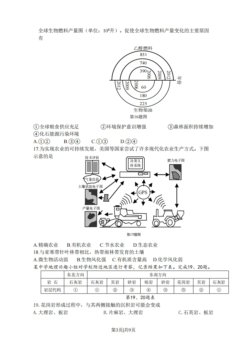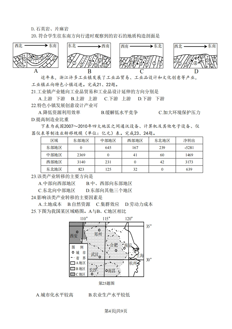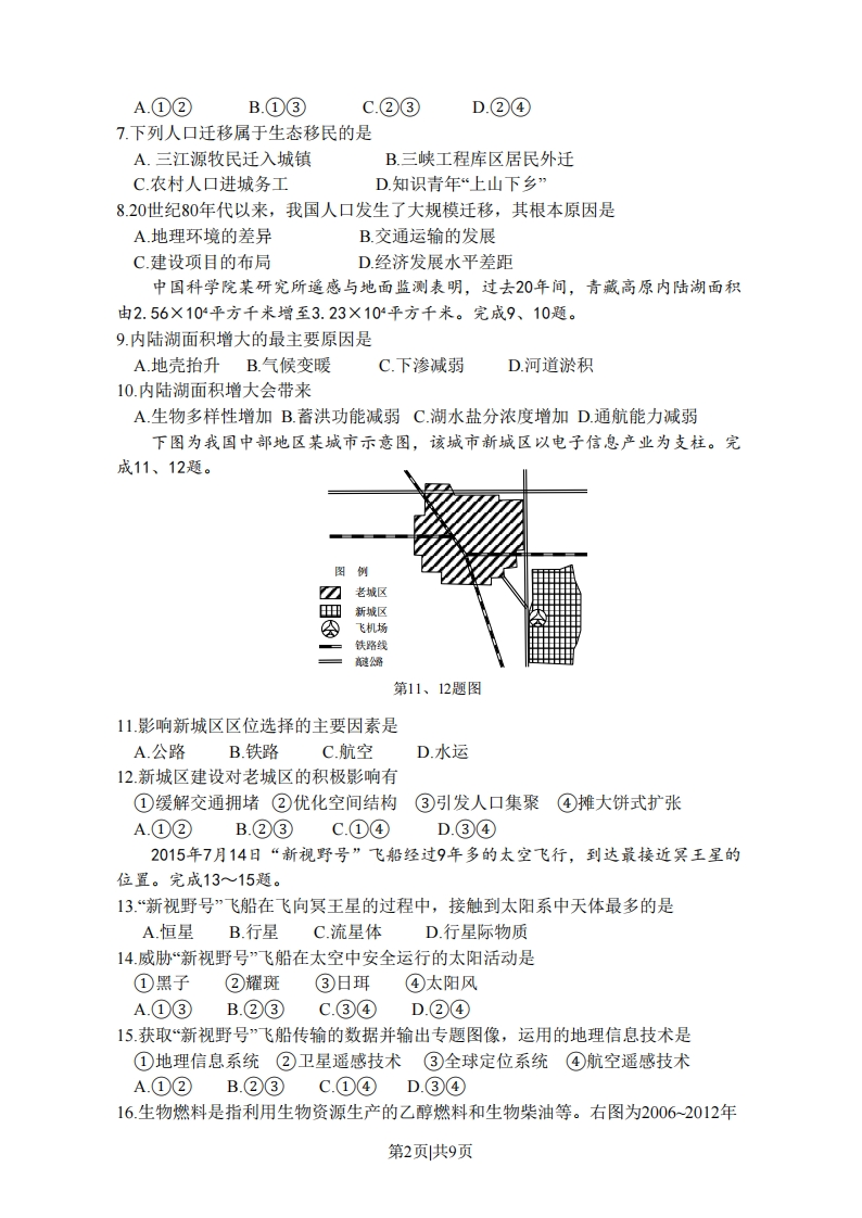 绝密★考试结束前2015年10月浙江省普通高中学业水平考试地理试题姓名:准考证号:考生须知:1.本试题卷分选择题和非选择题两部分,共5页,满分70分,考试时间60分钟。2.考生答题前,须将自己的姓名、准考证号用黑色字迹的签字笔或钢笔填写在答题纸上。3.选择题的答案必须使用2B铅笔将答题纸上对应题目的答案标号涂黑,如要改动,须将原填涂处用橡皮擦净。4.非选择题的答案必须使用黑色字迹的签字笔或钢笔写在答题纸上相应区域内,答案写在本试题卷上无效。选择题部分一、选择题(本大题共25小题,每小题2分,共50分。每小题列出的四个备选项中只有一个是符合题目要求的,不选、多选、错选均不得分)1.驱动水循环的能量主要来自A.地球内能B.太阳辐射C.地表径流D.大气环流2.霜冻往往出现于深秋至第二年早春晴朗的夜晚,因为此时A地面辐射强,地表降温慢B.空气中水汽多,地表降温快C.大气逆辐射弱,地表降温快D.大气保温作用强,地表降温慢3.我国东部地区不少城市出现了“热岛效应”,其主要原因有①城市郊区化②绿地面积增大(③能源消耗加大④城市人口剧增A.①②B.③④c.②④D.①③4解决漫画中反映的环境问题,合理的措施是亲,太脏了,A.生产纯净水洗澡啦:B.治理水体污染C.修建水利工程好中D.节约生产用水5.下列山地中,垂直方向自然带类型最多的是A.秦岭B.喜马拉雅山C.阿尔卑斯山第4题图D.阿巴拉契亚山6.GS的数据存储采用分层技术,叠加不同图层后可以分析地理事物的相互关系。现已有某城市交通线路分布图层、地形图层等,若在该城市进行污水处理厂选址,还应增加①大气污染图层②土地利用图层③水系分布图层④土壤类型图层第1页共9页A.①②B.①3C.②③D.②④7.下列人口迁移属于生态移民的是A.三江源牧民迁入城镇B.三峡工程库区居民外迁C.农村人口进城务工D.知识青年“上山下乡”820世纪80年代以来,我国人口发生了大规模迁移,其根本原因是A.地理环境的差异B.交通运输的发展C建设项目的布局D.经济发展水平差距中国科学院某研究所遥感与地面监测表明,过去20年间,青藏高原内陆湖面积由2.56×10平方千米增至3.23×10平方千米。完成9、10题。9.内陆湖面积增大的最主要原因是A.地壳抬升B.气候变暖C.下渗减弱D.河道淤积10.内陆湖面积增大会带来A.生物多样性增加B.蓄洪功能减弱C.湖水盐分浓度增加D.通航能力减弱下图为我国中部地区某城市示意图,该城市新城区以电子信息产业为支柱。完成11、12题。图例☑老城区田新城区因飞机场铁路线链公婚第11、12题图11.影响新城区区位选择的主要因素是A.公路B.铁路C航空D.水运12.新城区建设对老城区的积极影响有(①缓解交通拥堵②优化空间结构③引发人口集聚④摊大饼式扩张A.①②B.②③C.①④D.③④2015年7月14日“新视野号”飞船经过9年多的太空飞行,到达最接近冥王星的位置。完成13~15题。13.“新视野号”飞船在飞向冥王星的过程中,接触到太阳系中天体最多的是A.恒星B.行星C.流星体D.行星际物质14.威胁“新视野号”飞船在太空中安全运行的太阳活动是①黑子②耀斑(③日珥④太阳风A.①③B.②③C.③④D.②④15.获取“新视野号”飞船传输的数据并输出专题图像,运用的地理信息技术是(①地理信息系统②卫星遥感技术③全球定位系统(④航空遥感技术A.(①②B.②③C.①④D.③④16.生物燃料是指利用生物资源生产的乙醇燃料和生物柴油等。右图为2006~2012年第2页共9页