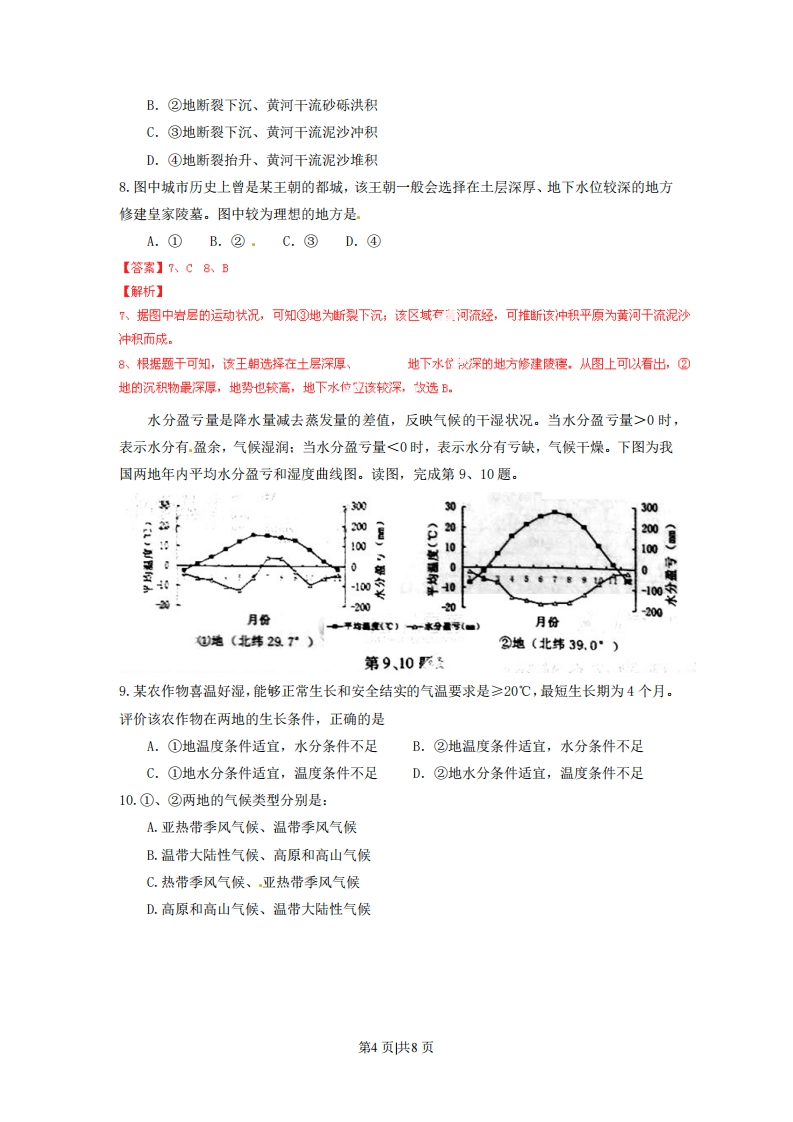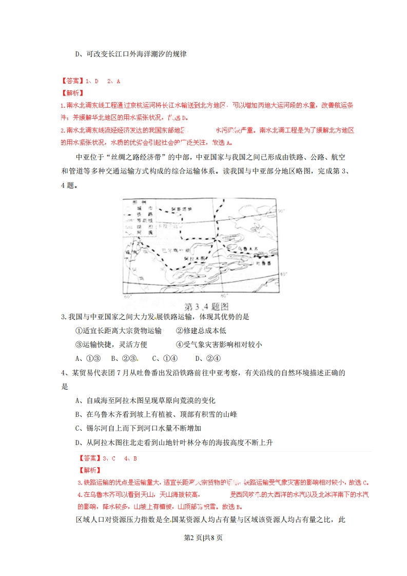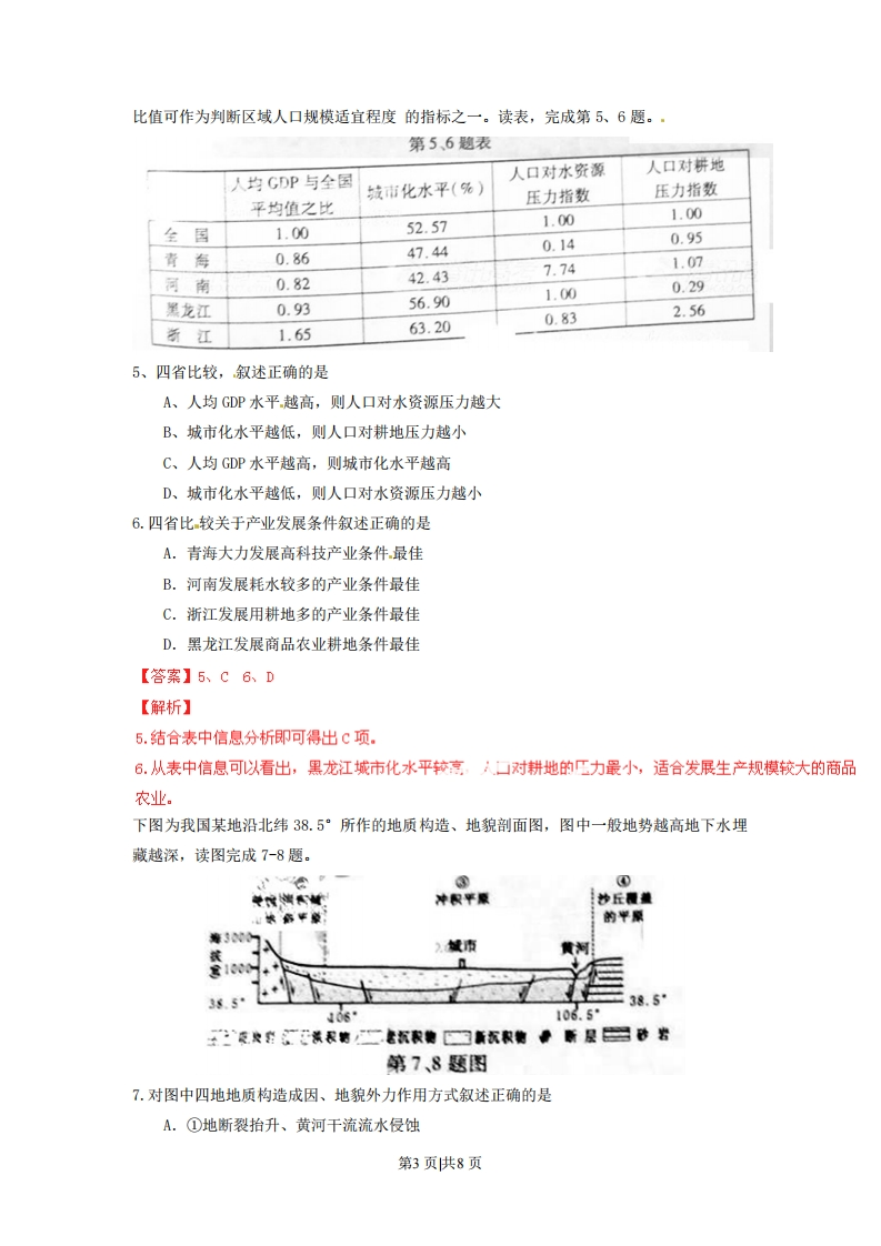 2014年普通高等学校招生全国统一考试(浙江卷)文科综合地理第I卷本卷共35小题。每小题4分,共140分。在每个小题给出的四个选项中,只有一项是符合题目要求的。一、选择题:本大题共35小题,每小题4分,共140分。在每小题列出的四个选项中,只有一项是符合题目要求的。南水北调东线工程是把长江的水调往北方的调水工程,调水线路主要为大运河。读南水北调东线工程调水线路图,完成第1、2题。”域形,”、重界·4a每装企>■泊一调水地磨第1、2题图1、对南水北调东线工程及其可能带来的影响,叙述正确的是①可以解决华北平原的盐碱化问题②有利于改善丙地大运河航运条件③丙至戊段可以自流引水④可缓解戊地的用水紧张A、①②B、③④C、①③D、②④2、南水北调东线工程对长江可能带来的影响,叙述正确的是A、可提高社会对长江水质的关注B、可促使长江的泥沙向海洋输送C、可降低甲地咸水入侵发生的问题第1页供8页D、可改变长江口外海洋潮汐的规律【答案】1、D2、A【解析】1.南水北调东线工程通过京杭运河将长江水输送到北方地区,可以增加丙地大运河段的水童,改善航运条件:并缓解华北地区的用水紧张状况,”透D,2.南水北调东线流经经济发达的我国东部地水污严重。南水北调工程是为了缓解北方地区的用水紧张状况,水质的优劣会起社会的广泛关注,牧选A中亚位于“丝绸之路经济带”的中部,中亚国家与我国之间己形成由铁路、公路、航空和管道等多种交通运输方式构成的综合运输体系。读我国与中亚部分地区略图,完成第3、4题。、系第等线第3、4题图3.我国与中亚国家之间大力发展铁路运输,体现其优势的是①适宜长距离大宗货物运输②修建总成本低③运输快捷,灵活方便④受气象灾害影响相对较小A、①③B、②③.C、①④D、②④4、某贸易代表团7月从吐鲁番出发沿铁路前往中亚考察,有关沿线的自然环境描述正确的是A、自咸海至阿拉木图呈现草原向荒漠的变化B、在乌鲁木齐看到坡上有植被、顶部有积雪的山峰C、锡尔河自上而下到河口水量不断增加D、从阿拉木图往北走看到山地针叶林分布的海拔高度不断上升【答案】3、C4,B【解析】3,铁路运输的优点是运输量大,适宜长距亨人宗货物的首·状路运输受气象灾害的影响相对较小,故选℃,4.在乌鲁木齐可以看到天山,天山海拔较高,受西风吹*的大西洋的水汽以及北冰洋南下的水汽的影响,降水较多,山坡上有植被,山顶部织雪。故选。区域人口对资源压力指数是全国某资源人均占有量与区域该资源人均占有量之比,此第2页供8页