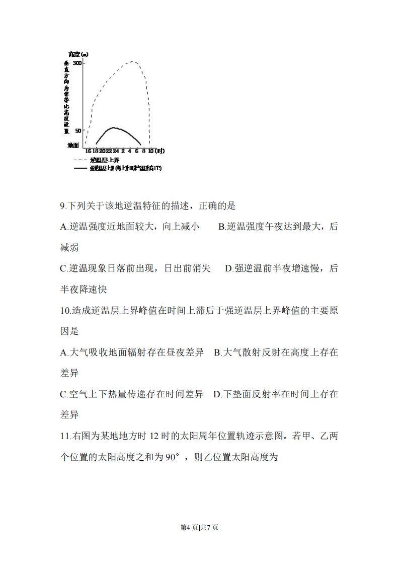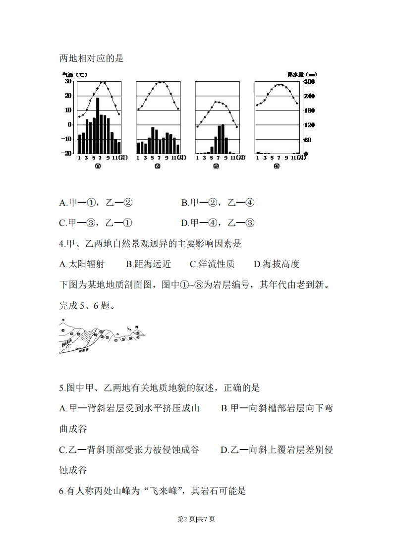 2015年高考地理试题(浙江卷)浙江古代盛产青瓷,其中越窑生产的青瓷(越瓷)远销东亚、东南亚、南亚、西亚和非洲东部地区等。古代越瓷贸易船主要以风力和洋流为动力,晴夜观星定向,一般出航半年内到达非洲。下图为越瓷外销西南航线示意图。完成1、2题。1.与陆路运输相比,越瓷西南方向贸易选择海运方式可①缩短路程②增加运量③减少货物破损④增强贸易灵活性A.①②B.①④C.②③D.③④2.在输出越瓷的贸易航程中,船上的人可能会在A.甲处夜观北极星定向B.乙处借船右后方来风作动力C.丙处见到河水的暴涨D.丁处跳望到大片茂盛的草地一地的自然景观主要取决于其水热条件。下图为北纬30°附近甲、乙两地的自然景观图。完成3、4题。3.下图为北纬30°附近①、②、③、④四地的气候统计图。与甲、乙第1页供7页两地相对应的是芦〔C】水量】0S002024010180012010602013579110月)13579110月)135791101357910月母©A.甲一①,乙一②B.甲一②,乙一④C.甲一③,乙-①D.甲一④,乙一③4.甲、乙两地自然景观迥异的主要影响因素是A.太阳辐射B.距海远近C.洋流性质D.海拔高度下图为某地地质剖面图,图中①⑧为岩层编号,其年代由老到新。完成5、6题。5.图中甲、乙两地有关地质地貌的叙述,正确的是A.甲一背斜岩层受到水平挤压成山B.甲一向斜槽部岩层向下弯曲成谷C.乙一背斜顶部受张力被侵蚀成谷D.乙一向斜上覆岩层差别侵蚀成谷6.有人称丙处山峰为“飞来峰”,其岩石可能是第2页供7页
