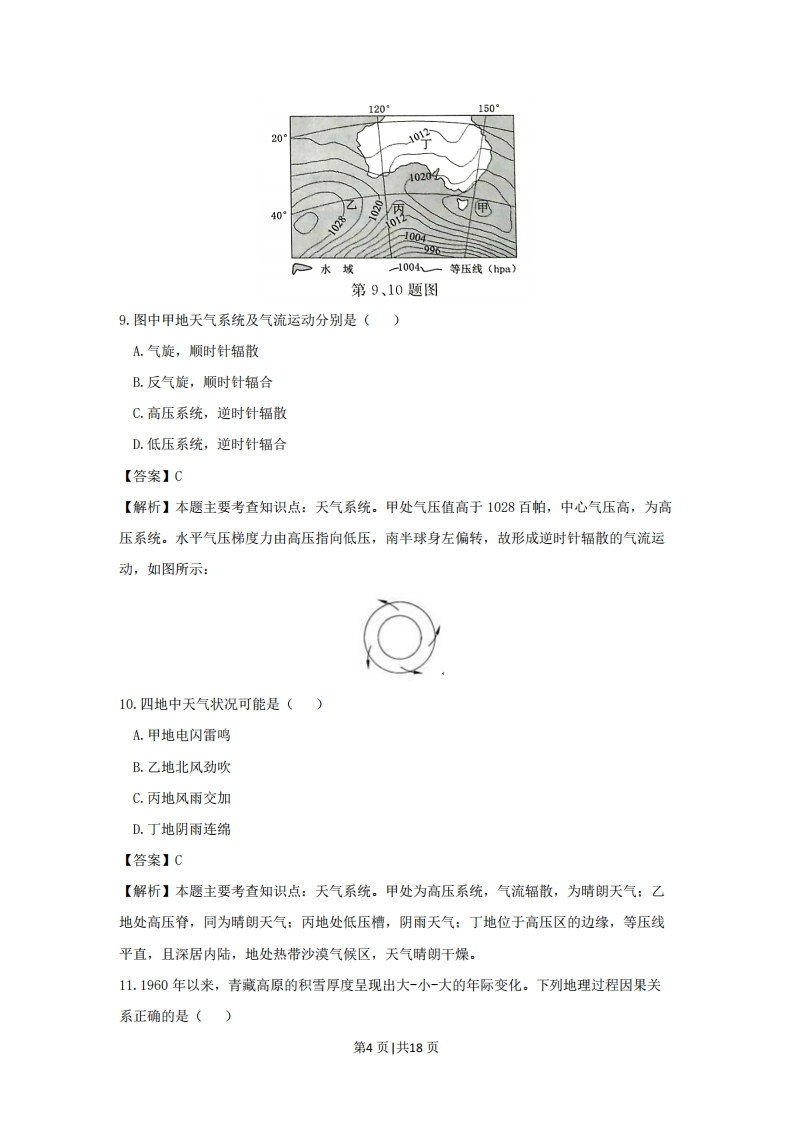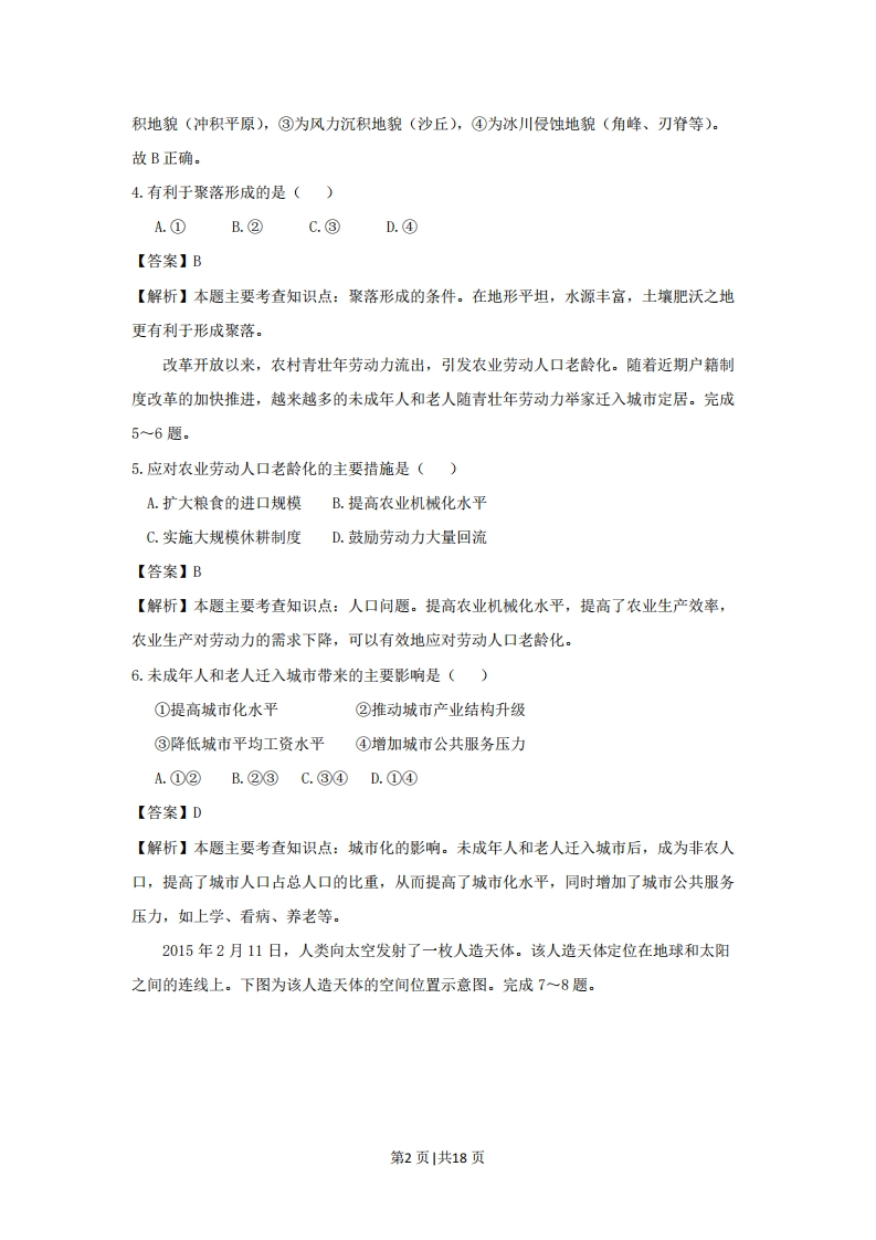 2017年4月浙江省普通高校招生选考考试一、选择题(本大题共25题,每小题2分,共50分。每小题列出的四个备选项中只有一个是符合题目要求的,不选、多选、错选均不得分)近年来,我国山西、内蒙古等能源输出地逐步用电力输出代替煤炭输出。沿海输入地鼓励用电,优化能源消费结构。完成1~2题。1.用电力代替煤炭输出会()①减少我国温室气体排放②促进输出地经济增长③增加我国交通运输压力④增加输出地环境压力A.①②B.①③C.②④D.③④【答案】C【解析】本题主要考查知识点:能源输送方式的比较。山西、内蒙古等地将能源输出由煤炭为主转为火电为主,对于输入地而言利于减少温室气体排放,但不会减少全国的温室气体总排放量,故①错:电力输出采用高压输电线路,不占用交通运输线,故利于减轻输出地和输入地的交通运输压力,故③错:煤炭转化为火电,延长了产业链,利于促进输出地经济增长,但火电加剧输出地的大气污染和水资源等压力,故②④正确。2.输入地鼓励居民用电动汽车替代燃油汽车,主要目的是()A.改善大气环境B.缓解交通拥堵C.减轻噪声污染D.减少交通事故【答案】A【解析】本题主要考查知识点:不同能源的优劣比较。电动汽车相比燃油汽车可以减少汽车尾气的排放,所以有效地改善了大气环境。下图为四种地貌景观。完成3~4题。①④第3、4题图3.主要由沉积作用形成的是()A.①②B.②③C.③④D.①④【答案】B【解析】本题主要考查知识点:外力作用。图中①为海浪侵蚀地貌(海蚀崖),②为流水沉第1页|共18页积地貌(冲积平原),③为风力沉积地貌(沙丘),④为冰川侵蚀地貌(角峰、刃脊等)。故B正确。4.有利于聚落形成的是()A.⊙B.②C.③D.④【答案】B【解析】本题主要考查知识点:聚落形成的条件。在地形平坦,水源丰富,土壤肥沃之地更有利于形成聚落。改革开放以来,农村青壮年劳动力流出,引发农业劳动人口老龄化。随着近期户籍制度改革的加快推进,越来越多的未成年人和老人随青壮年劳动力举家迁入城市定居。完成5~6题.5.应对农业劳动人口老龄化的主要措施是()A.扩大粮食的进口规模B.提高农业机械化水平C.实施大规模休耕制度D.鼓励劳动力大量回流【答案】B【解析】本题主要考查知识点:人口问题。提高农业机械化水平,提高了农业生产效率,农业生产对劳动力的需求下降,可以有效地应对劳动人口老龄化。6.未成年人和老人迁入城市带来的主要影响是()①提高城市化水平②推动城市产业结构升级③降低城市平均工资水平④增加城市公共服务压力A.①②B.②③C.③④D.①④【答案】D【解析】本题主要考查知识点:城市化的影响。未成年人和老人迁入城市后,成为非农人口,提高了城市人口占总人口的比重,从而提高了城市化水平,同时增加了城市公共服务压力,如上学、看病、养老等。2015年2月11日,人类向太空发射了一枚人造天体。该人造天体定位在地球和太阳之间的连线上。下图为该人造天体的空间位置示意图。完成7~8题。第2页1共18页