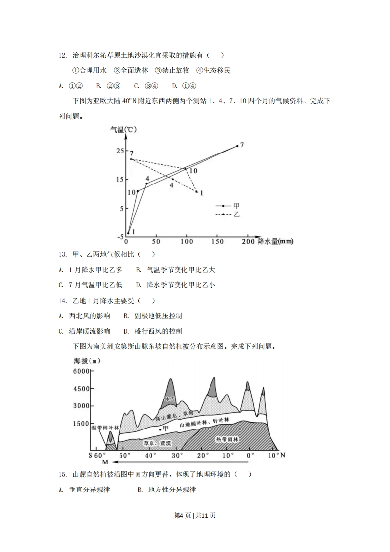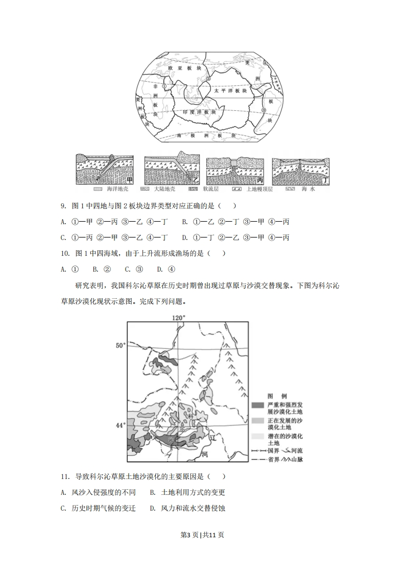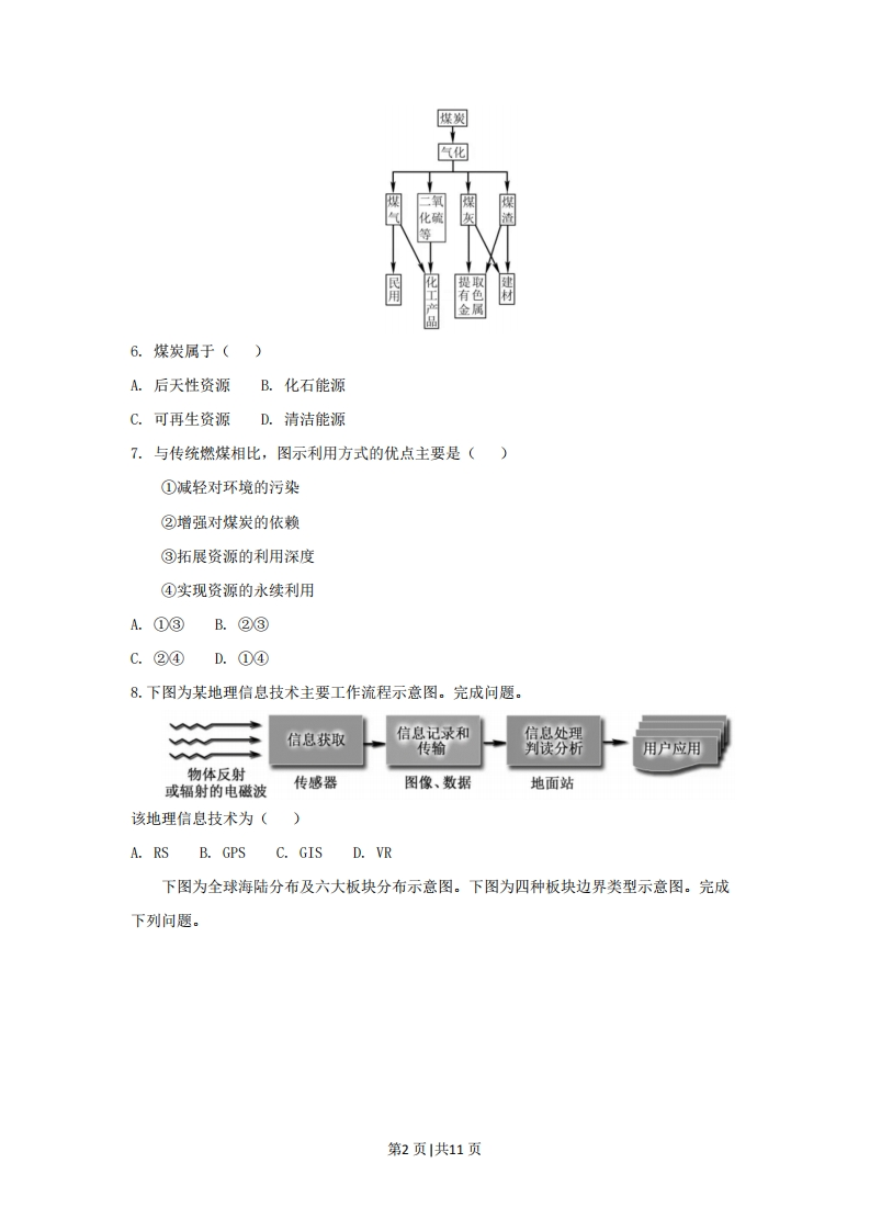2018年11月浙江省普通高校招生选考科目考试一、选择题创意产业是利用创意、专业知识和技能,开发知识产权,创造财官和增加就业机会的新兴产业,人才是创意产业的关键要素。完成下列问题。1.影响创意产业最小的区位因素是()A.社会资金B.科学技术C.通讯信息D.自然资源2.创意产业集群化发展的主要优势是()①便于知识交流②促进分工协作③节约运输成本④集中处理废弃物A.①②B.①③C.②④D.③④3.体现我国四大地区发展差异的是()A.东部地区第三产业比重最高B.西部地区农业总产值最大C.中部地区城市分布密度最大D.东北地区工业化水平最高下图为2016年世界四个国家的人口结构金字塔图。完成下列问题。年龄(岁)>8070-74口男60-64口女50-5440-4430-3420-2410-140-4占总人口比重()4.四国中人口增长属于典型的“高一低一高”模式的是()A.甲B.乙C.丙D.丁5.四国中()A.甲国人口老龄化加剧B.乙国劳动力比重增加C.丙国人口规模会缩小D.丁国出生性别比失衡随着科学技术的进步和社会生产力的发展,人们利用煤炭的方式逐步改革。右图为煤炭气化利用示意图,完成下列问题。第1页|共11页煤炭气化二氧化等提取工产品有色材金属6.煤炭属于()A.后天性资源B.化石能源C.可再生资源D.清洁能源7.与传统燃煤相比,图示利用方式的优点主要是()①减轻对环境的污染②增强对煤炭的依赖③拓展资源的利用深度④实现资源的永续利用A.①③B.②③C.②④D.①④8.下图为某地理信息技术主要工作流程示意图。完成问题。信息获取信息记录和信息处理传输判读分析用户应用物体反射或辐射的电磁波传感器图像、数据地面站该地理信息技术为()A.RSB.GPSC.GISD.VR下图为全球海陆分布及六大板块分布示意图。下图为四种板块边界类型示意图。完成下列问题。第2页1共11页