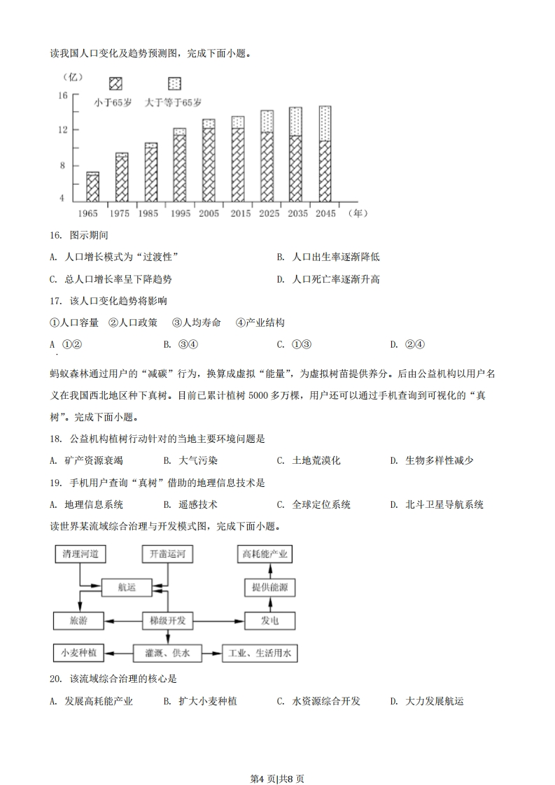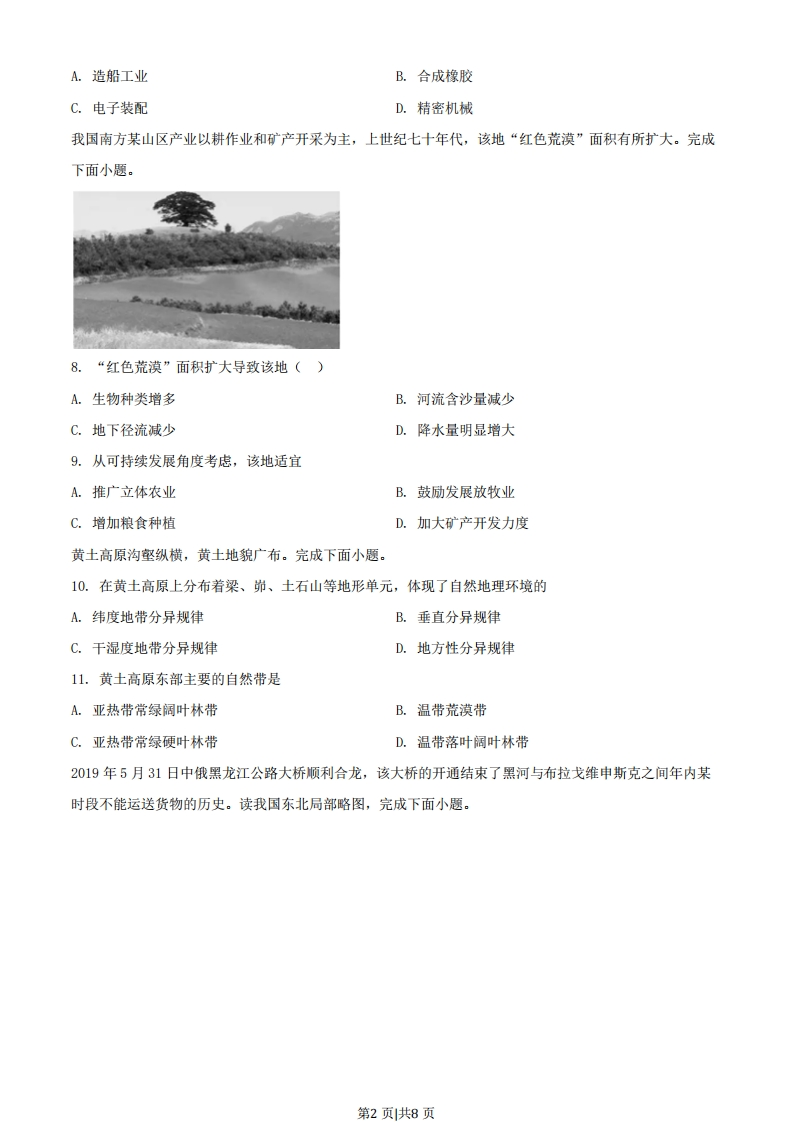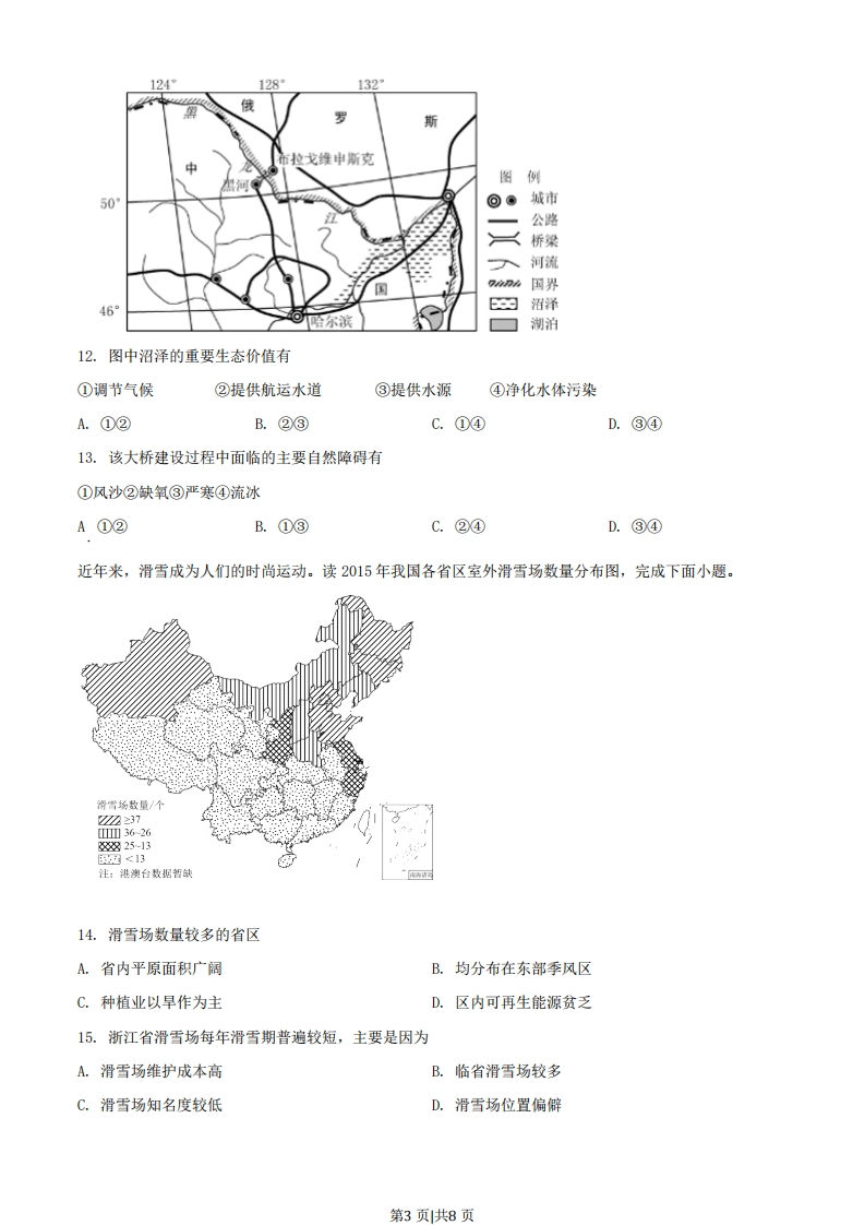 2019年6月浙江省普通高中学业水平考试地理试题一、选择题(本大题共25小题,每小题2分,共50分。每小题列出的四个备选项中只有一个是符合题目要求的,不选、多选、错选均不得分)1.最新研究表明,自2005年以来南极上空臭氧层空洞有逐渐缩小趋势,其原因可能是A.全球气候持续变暖B.植被覆盖率提高C.矿物燃料使用减少D.氟利昂排放减少2.可燃冰又称“天然气水合物”,按自然属性属于A.气候资源B.矿产资源C.土地资源D.生物资源3.夏至日前后,俄罗斯圣彼得堡(60°N)会出现夜晚不黑现象,这是因为大气对太阳辐射具有A.折射作用B.反射作用C.吸收作用D.散射作用2019年6月,呼(呼和浩特)一张(张家口)高铁顺利完工。完成下面小题。1109112114116429白云鄂博图例内蒙古自治区省界乌兰察布河北省©00城市呼和浩特张掌口一一铁路●⊙▲铁矿煤炭40稀土河流仙西省时令河4.白云鄂博兴起的主要区位因素是A.矿产B.政治C.河流D.气候5.“呼一张”高铁的通车,将直接促进沿线地区A.风能开发B.铁矿石输出C.旅游业发展D.水资源利用石化工业是长三角地区重要产业之一。完成下面小题。6.长三角地区重点发展石化工业的优势条件是A.水能丰富B.接近市场C.地价低廉D.劳动力丰富7.从生产协作关系看,长三角石化工业园区能吸引的相关产业是第1页共8页A.造船工业B.合成橡胶C.电子装配D.精密机械我国南方某山区产业以耕作业和矿产开采为主,上世纪七十年代,该地“红色荒漠”面积有所扩大。完成下面小题。8.“红色荒漠”面积扩大导致该地()A.生物种类增多B.河流含沙量减少C.地下径流减少D.降水量明显增大9.从可持续发展角度考虑,该地适宜A.推广立体农业B.鼓励发展放牧业C.增加粮食种植D.加大矿产开发力度黄土高原沟壑纵横,黄土地貌广布。完成下面小题。10.在黄土高原上分布着梁、峁、土石山等地形单元,体现了自然地理环境的A.纬度地带分异规律B.垂直分异规律C.干湿度地带分异规律D.地方性分异规律11.黄土高原东部主要的自然带是A.亚热带常绿阔叶林带B.温带荒漠带C.亚热带常绿硬叶林带D.温带落叶阔叶林带2019年5月31日中俄黑龙江公路大桥顺利合龙,该大桥的开通结束了黑河与布拉戈维申斯克之间年内某时段不能运送货物的历史。读我国东北局部略图,完成下面小题。第2页共8页