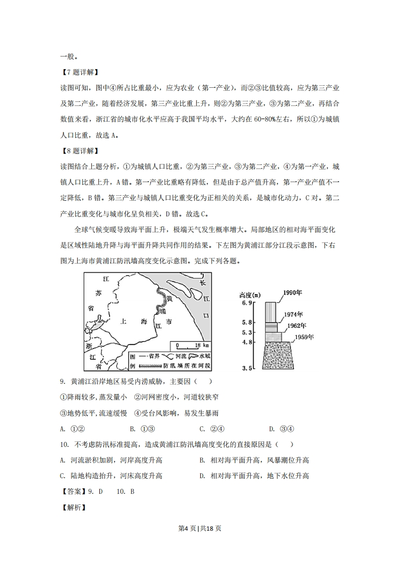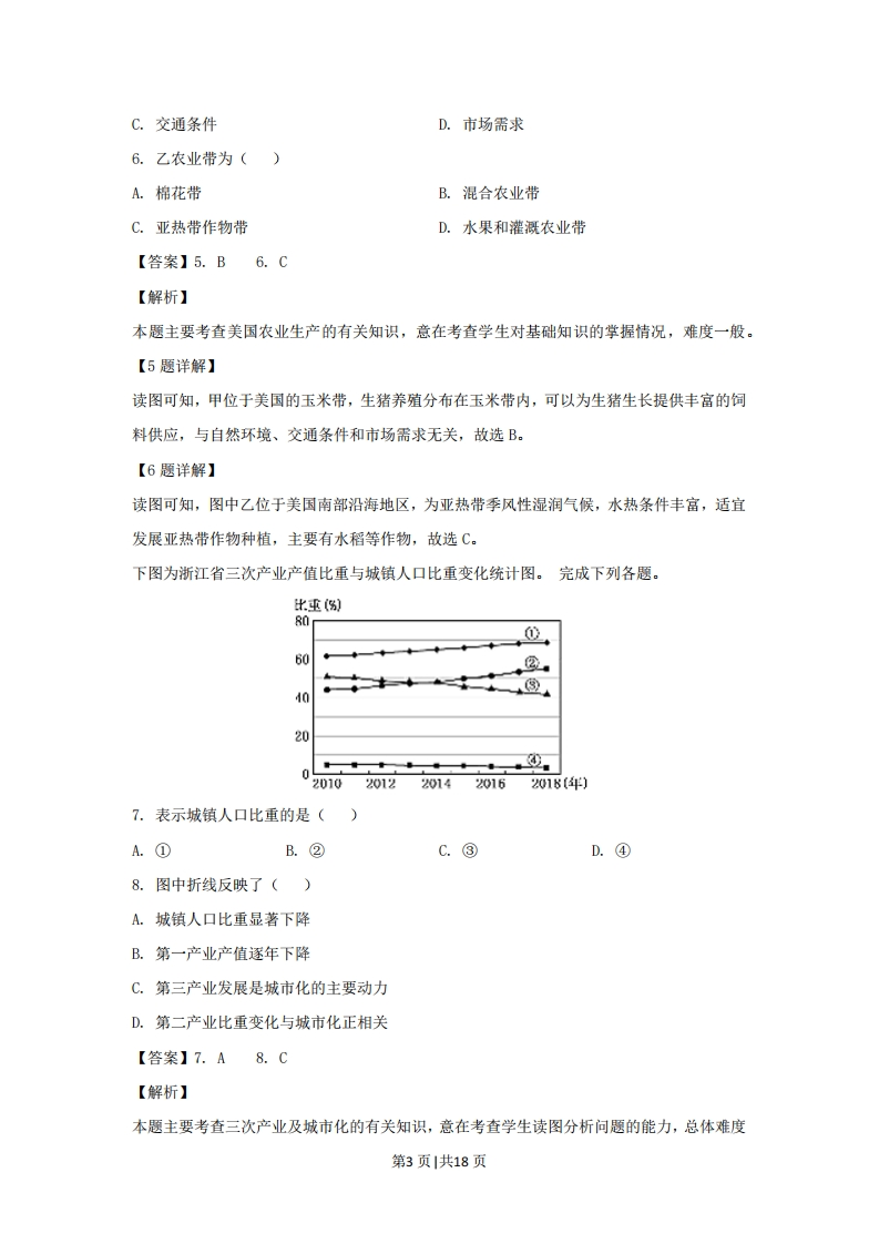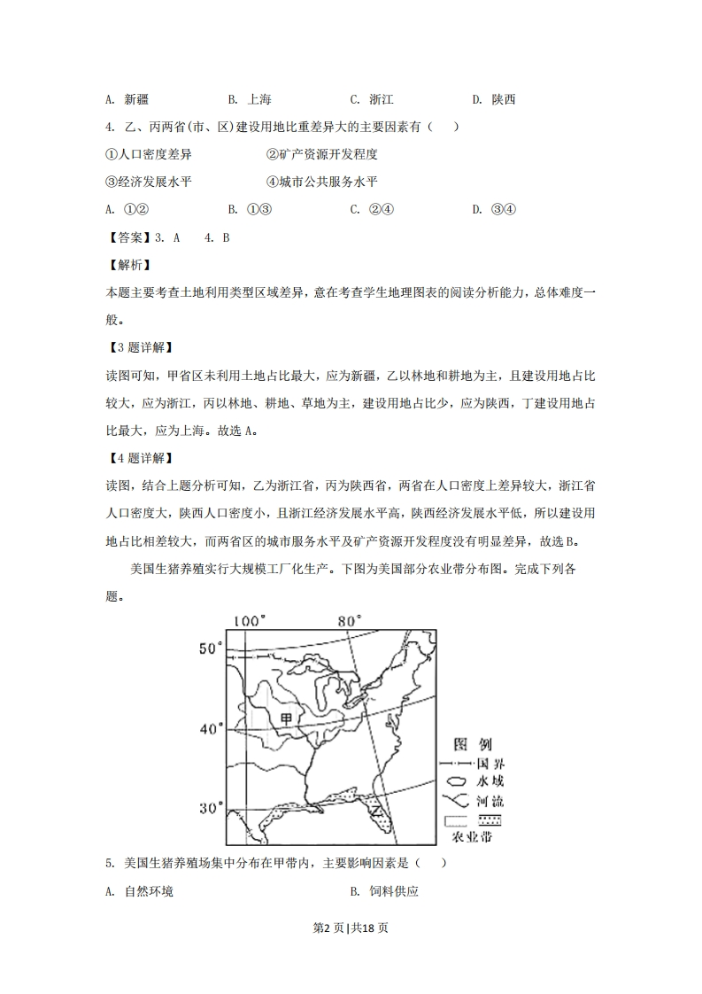 2019年4月浙江省普通高校招生学考选考试题一、选择题。我国西北地区盛产苹果、梨、红枣、核桃等特色农产品,电商企业从西北地区采购农产品在中、东部地区进行加工、包装,并在网上大量销售。完成下列各题。1.电商企业在中、东部地区加工、包装、销售的主要优势是()A.距离市场较近B.土地成本较低C.人才资源丰富D.运输距离较短2.依托电商销售农产品可提高西北地区农业()①规模化水平②自给率水平③商品化水平④专业化水平A.①②③B.①②④C.①③④D.②③④【答案】1.A2.C【解析】本题主要考查电商的优势及对区域农业发展的影响,意在考查学生理解问题、知识迁移的能力,总体难度一般。【1题详解】电商在中东部地区将西北地区出产的农产品加工、包装、销售是由于中东部地区与西北地区地域差异大,且经济相对发达,西北地区的特色农产品具有广阔的消费市场,A对。东部地区经济发达,土地成本高,B错。加工、包装、销售农产品毒药人才需求不很迫切,C错。农产品的生产地与市场之间的距离不会因在何处包装、加工而产生变化,D错。故选A。【2题详解】电商销售农产品,可以使得销售范围扩大,销售量增大,有利于西北地区特色农业的规模化、专业化、商品化水平的提高,而自给率会降低,故选C。下表为2017年我国上海、浙江、陕西和新疆四省(市、区)不同土地利用类型面积比重表(单位:%)。完成下列各题。土地利用类型农业用地建设未利用土地省(市、区)耕地林地草地其他农用地用地及其他甲3.16.521.401.068.0乙18.862.70012.56.0丙19.459.710.50.64.75.1丁23.39.405.337.524.53.甲是()第1页|共18页A.新疆B.上海C.浙江D.陕西4.乙、丙两省(市、区)建设用地比重差异大的主要因素有()①人口密度差异②矿产资源开发程度③经济发展水平④城市公共服务水平A.①②B.①③C.②④D.③④【答案】3.A4.B【解析】本题主要考查土地利用类型区域差异,意在考查学生地理图表的阅读分析能力,总体难度一般。【3题详解】读图可知,甲省区未利用土地占比最大,应为新疆,乙以林地和耕地为主,且建设用地占比较大,应为浙江,丙以林地、耕地、草地为主,建设用地占比少,应为陕西,丁建设用地占比最大,应为上海。故选A。【4题详解】读图,结合上题分析可知,乙为浙江省,丙为陕西省,两省在人口密度上差异较大,浙江省人口密度大,陕西人口密度小,且浙江经济发展水平高,陕西经济发展水平低,所以建设用地占比相差较大,而两省区的城市服务水平及矿产资源开发程度没有明显差异,故选B。美国生猪养殖实行大规模工厂化生产。下图为美国部分农业带分布图。完成下列各题。100°80°50409图例一国口水域30浏流西农业带5.美国生猪养殖场集中分布在甲带内,主要影响因素是(A.自然环境B.饲料供应第2页1共18页