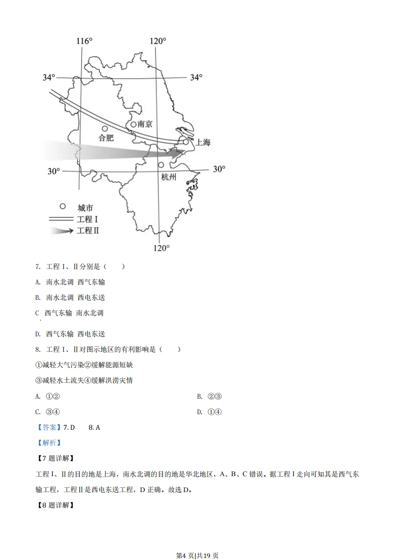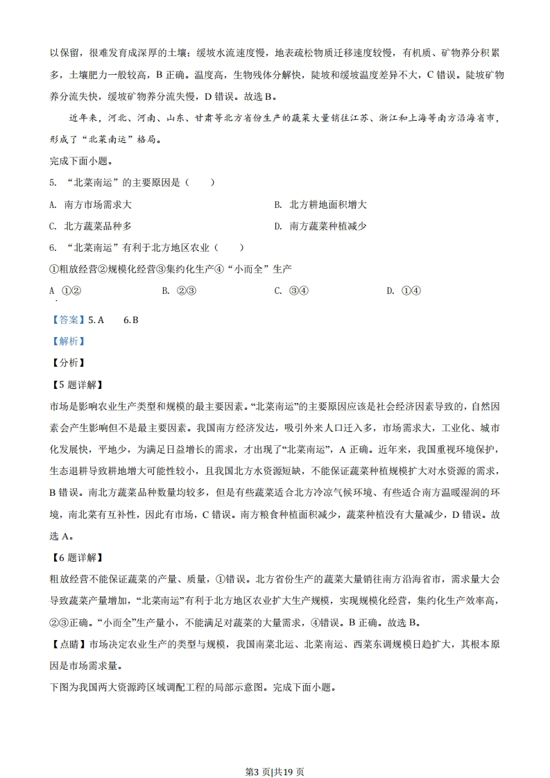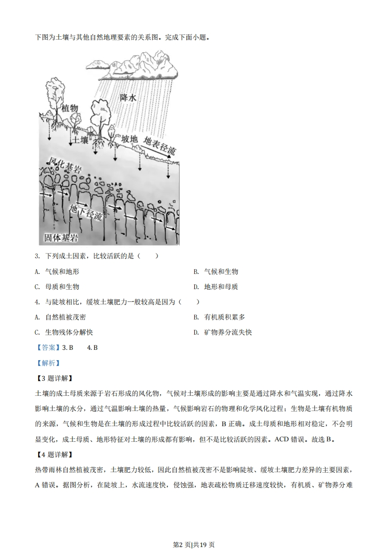 2020年1月浙江省选考地理试卷一、选择题(本大题共20小题,每小题2分,共40分。每小题列出的四个备选项中只有个是符合题目要求的,不选、多选、错选均不得分)1.手机点餐类APP为用户选择餐馆、点餐提供了便利。通过APP查询送餐员即时位置的技术是A.数字地球和遥感B.数字地球和虚拟现实C.遥感和地理信息系统D.地理信息系统和卫星定位系统【答案】D【解析】【分析】【详解】遥感(RS)是人们在航空器(如飞机、高空气球)或航天器(如卫星、飞船)上利用光学仪器或电子仪器等技术装备,对地表物体进行遥远的感知,并传送到地面进行分析,RS没有定位、查询功能,AC错误。数字地球是将各种信息转变成数字,实现网络上共享,无法实现查询、定位:虚拟现实不属于地理信息技术,B错误。GIS主要是分析、处理信息功能,具有查询功能,GPS主要功能是定位、导航,手机点餐类APP可以查询到送餐员的即时位置的技术是GIS和GPS,D正确。A、B、C错误。【点睛】遥感(S)是人们在航空器(如飞机、高空气球)或航天器(如卫星、飞船)上利用光学仪器或电子仪器等技术装备,对地表物体进行遥远的感知,并传送到地面进行分析:GPS技术可以对地球表面上的任一点、任一物体进行全天候的精密三维定位和导航:GIS技术对整个或部分地球表层空间中的有关地理分布数据进行采集、储存、管理、运算、分析、显示和描述的技术系统。2.近年来,我国城市地铁交通发展迅速,与常规公交方式相比,地铁的特点有()①投资少,见效快②废气多,噪声大③用地省,客运量大④速度快,准点率高A.①②B.②③C.③④D.①④【答案】C【解析】【分析】【详解】与地面常规公交方式相比,地铁在地下运行受外界干扰相对较小,道路通畅,地铁运行速度快,不像地面交通一样易发交通拥挤、误点,因此准点率高,④正确:位于地下,节省城市用地空间,用地省,运输效率高,客运量大,③正确:地铁建设需要在地下进行轨道、电力、用水等作业,工程量大,投资大,建设周期长,见效慢,①错误:地铁是电气化交通运输方式,产生废气少,对城市地面环境产生的噪音干扰少,②错误。C正确。第1页共19页下图为土壤与其他自然地理要素的关系图。完成下面小题。坡地地表径流风化基岩固体基岩3.下列成土因素,比较活跃的是()A.气候和地形B.气候和生物C.母质和生物D.地形和母质4.与陡坡相比,缓坡土壤肥力一般较高是因为()A.自然植被茂密B.有机质积累多C.生物残体分解快D.矿物养分流失快【答案】3.B4.B【解析】【3题详解】土壤的成土母质来源于岩石形成的风化物,气候对土壤形成的影响主要是通过降水和气温实现,通过降水影响土壤的水分,通过气温影响土壤的热量,气候影响岩石的物理和化学风化过程:生物是土壤有机物质的来源,气候和生物是在土壤的形成过程中比较活跃的因素,B正确。成土母质和地形相对稳定,不会明显变化,成土母质、地形特征对土壤的形成都有影响,但不是比较活跃的因素。ACD错误。故选B。【4题详解】热带雨林自然植被茂密,土壤肥力较低,因此自然植被茂密不是影响陡坡、缓坡土壤肥力差异的主要因素,A错误。据图分析,在陡坡上,水流速度快,侵蚀强,地表疏松物质迁移速度较快,有机质、矿物养分难第2页共19页