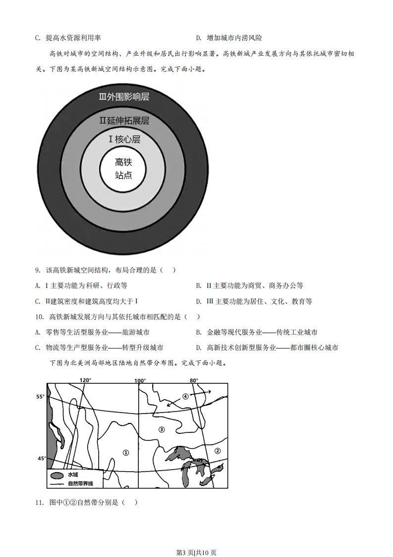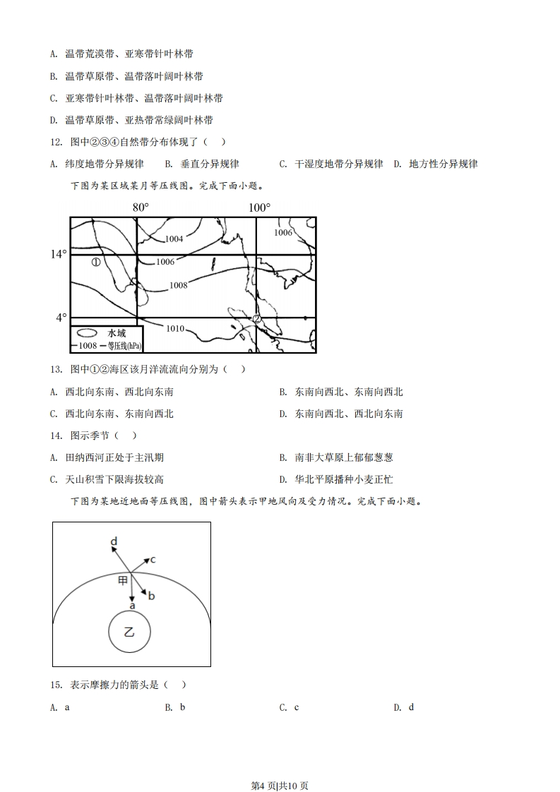 2022年1月浙江省高考地理选考试卷一、选择题1(本大题共20小题,每小题2分,共40分。每小题列出的四个备选项中只有一个是符合题目要求的,不选、多选、错选均不得分)1.农业生产中地膜覆盖对土壤理化性状的主要作用是()①保持土壤温度②减少水肥流失③增加土壤厚度④改善土壤质地A.①②B.①④C.②③D.③④下表为我国某研究机构发布的农田、湿地、森林、草原四种生态系统的单位面积生态服务价值,数值越大表示生态服务价值越高。完成下面小题。生态系统①②③④生态服务功能调节气候2.70.90.917.1涵养水源3.20.80.615.5净化水中污染物1.31.31618.2保护生物多样性3.31.10.72.52.表中①至④依次是()A.农田湿地森林草原B.森林农田湿地草原C.森林草原农田湿地D.草原湿地森林农田3.湿地开发利用中,生态服务价值下降最明显的是()A.休闲垂钓B.滩涂观光C.移植红树林D.水稻田养蟹4.以下地貌景观主要由风化作用形成的是()①②第1页共10页③④A.①③B.①④C.②③D.②④近年来,随着大豆种植面积迅速扩大及生物技术的运用,巴西已成为世界最大的大豆生产国和出口国。完成下面小题。5.巴西成为世界最大的大豆出口国,其主要原因为()A.海运价格下降B.国际市场需求大C.土地资源丰富D.劳动力数量增加6.巴西大豆主产区的农业生产属于()A.混合型农业B.商品性农业C.有机农业D.热带种植园农业下图为北美洲局部地区略图。完成下面小题。125°115°太40平旧金的洋350城市p洛杉矶河流水域A人山脉7.与旧金山比,洛杉矶水资源较少的主要原因是()A.气温较高,蒸发量大B.山脉阻挡,降水量小C.洋流影响,降温减湿D.河流短少,径流量小8.从区域外调水对洛杉肌的影响有()A.减少城市水分蒸发B.减轻城市地质灾害第2页共10页