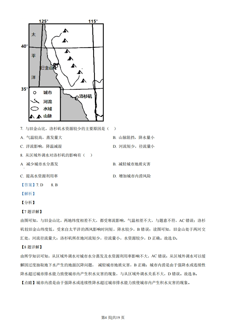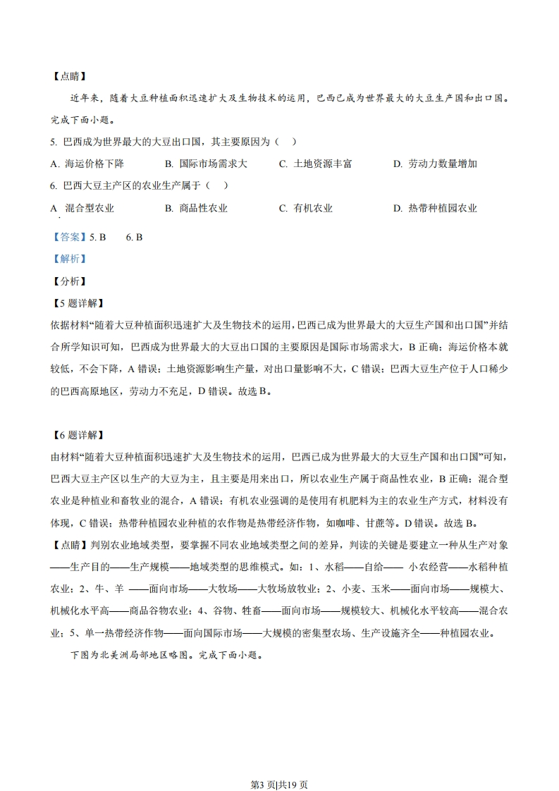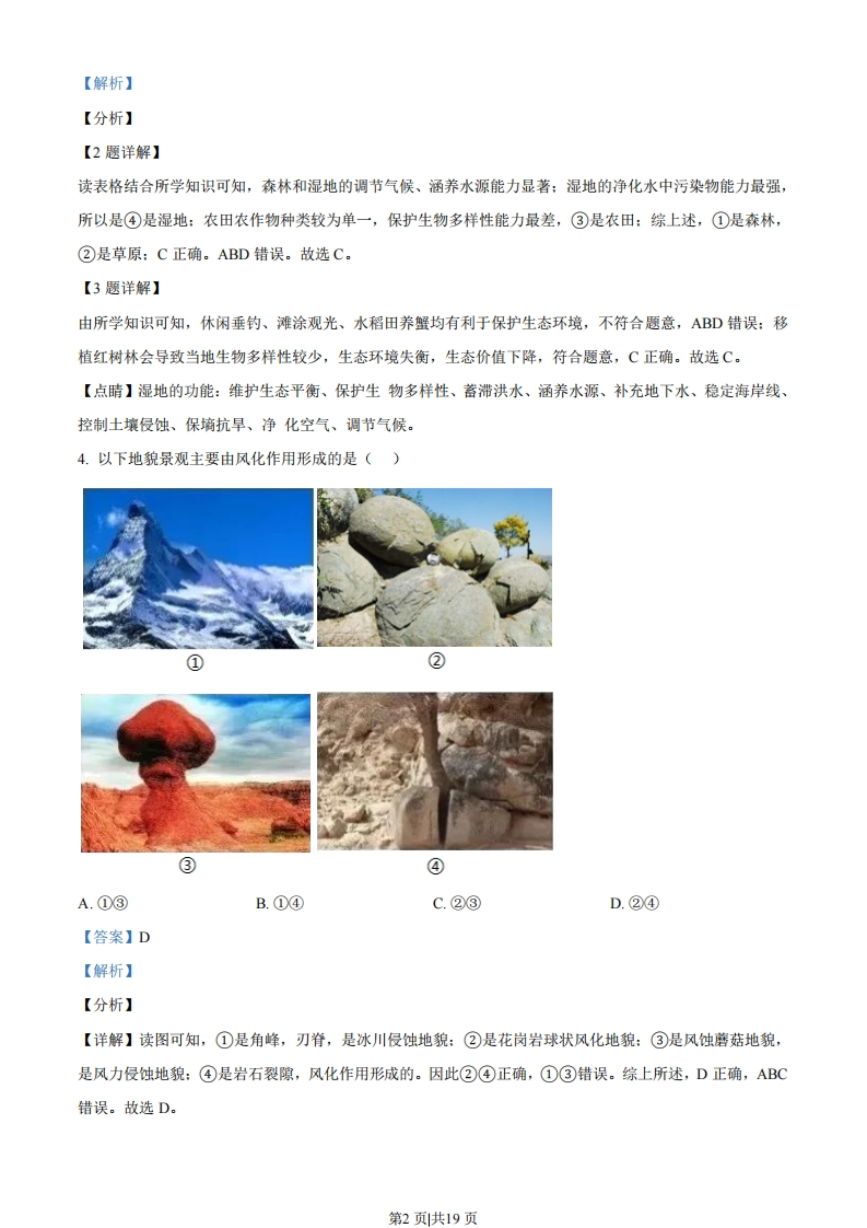 2022年1月浙江省高考地理选考试卷一、选择题1(本大题共20小题,每小题2分,共40分。每小题列出的四个备选项中只有一个是符合题目要求的,不选、多选、错选均不得分)1.农业生产中地膜覆盖对土壤理化性状的主要作用是()①保持土壤温度②减少水肥流失③增加土壤厚度④改善土壤质地A.①②B.①④C.②③D.③④【答案】A【解析】【分析】【详解】农田覆盖地膜可以保温、保土、保湿、保肥,抑制杂草生长,减轻病害,增强光效等,①、②对:土壤层次分为一般可分为腐殖质层、淋溶层、淀积层和成土母质层,土壤厚度是母质层以上的那部分,地膜覆盖不会增加土壤厚度,③错:土壤质地是根据土壤的颗粒组成划分的土壤类型。土壤质地一般分为砂土、壤土和粘土三类,地膜覆盖不会改善土壤质地,④错,A对。故选A。【点睛】下表为我国某研究机枸发布的农田、湿地、森林、草原四种生态系统的单位面积生态服务价值,数值越大表示生态服务价值越高。完成下面小题。生态系统①②③④生态服务功能调节气候2.70.90.917.1涵养水源3.20.80.615.5净化水中污染物1.31.31.618.2保护生物多样性3.31.10.72.52.表中①至④依次是()A.农田湿地森林草原B.森林农田湿地草原C.森林草原农田湿地D.草原湿地森林农田3.湿地开发利用中,生态服务价值下降最明显的是()A.休闲垂钓B.滩涂观光C.移植红树林D.水稻田养蟹【答案】2.C3.C第1页共19页【解析】【分析】【2题详解】读表格结合所学知识可知,森林和湿地的调节气候、涵养水源能力显著:湿地的净化水中污染物能力最强,所以是④是湿地:农田农作物种类较为单一,保护生物多样性能力最差,③是农田:综上述,①是森林,②是草原:C正确。ABD错误。故选C。【3题详解】由所学知识可知,休闲垂钓、滩涂观光、水稻田养蟹均有利于保护生态环境,不符合题意,ABD错误:移植红树林会导致当地生物多样性较少,生态环境失衡,生态价值下降,符合题意,C正确。故选C。【点睛】湿地的功能:维护生态平衡、保护生物多样性、蓄滞洪水、涵养水源、补充地下水、稳定海岸线、控制土壤侵蚀、保墒抗旱、净化空气、调节气候。4.以下地貌景观主要由风化作用形成的是()①②③④A.①③B.①④C.②③D.②④【答案】D【解析】【分析】【详解】读图可知,①是角峰,刃脊,是冰川侵蚀地貌:②是花岗岩球状风化地貌:③是风蚀蘑菇地貌,是风力侵蚀地貌:④是岩石裂隙,风化作用形成的。因此②④正确,①③错误。综上所述,D正确,ABC错误。故选D。第2页共19页