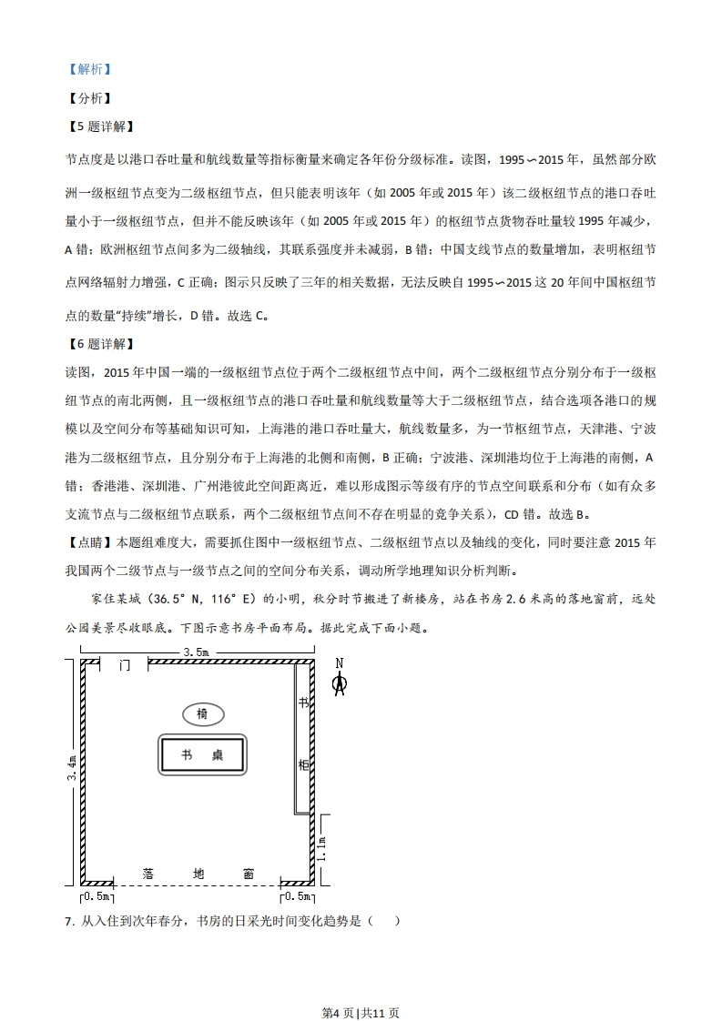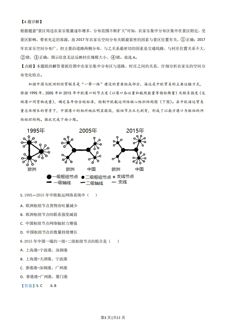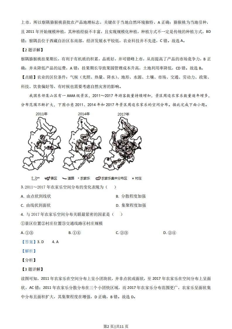 2021年河北省普通高中学生水平选择性考试地理注意事项:1.答卷前,考生务必将自已的姓名、考生号、考场号、座位号填写在答题卡上。2.回答选择题时,选出每小题答案后,用铅笔把答题卡上对应题目的答案标号涂黑。如需改动,用橡皮擦干净后,再选涂其它答案标号。回答非选释题时,将答案写在答题卡上。写在本试卷上无效。3.考试结束后,将本试卷和答题卡一并交回。一、单项选释题:本题共15小题,每小题3分,共45分。在每小题给出的四个选项中,只有一项是符合题目要求的。察隅县位于西藏自治区东南部,当地农牧民曾引种用猕猴桃,2011年开始规模种植(下图)。种植区地处亚热带湿润山区河谷台地,土壤肥沃,水质优良,2017年“察隅猕猴桃”获批农产品标志。察隅猕猴桃挂果期长,可错峰上市。猕猴桃种植带动了当地农牧民脱贫。据此完成下面小题。1.察隅猕猴桃获批农产品地理标志,关键在于()A.独特的自然环境B.传统的生产方式C.先进的农业科技D.丰富的种植经验2.察隅猕猴桃挂果期长,有利于()A.降低产品运输费用B.提高市场竞争力C.降低果园管理成本D.提高土地利用率【答案】1.A2.B【解析】【分析】【1题详解】根据材料,种植区地处亚热带湿润山区河谷台地,土壤肥沃,水质优良,且察隅猕猴桃挂果期长,可错峰第1页|共11页上市,所以察隅猕猴桃获批农产品地理标志,关键在于当地自然环境独特,A正确:猕猴桃为当地引种,且2011年开始规模种植,其种植经验不丰官,且实现规模化种植,种植方式不一定是传统的种植方式,BD错:察隅县位于西藏自治区东南部,经济发展水平较低,农业科技并不先进,C错。故选A。【2题详解】察隅猕猴桃挂果期长,有利于有机质的积累,品质好,并可错峰上市,从而提高了产品的市场竞争力,B正确:并未降低产品的运费,A错:挂果期长导致果园管理成本升高,土地利用率降低,CD错。故选B。【点睛】农业的区位条件:气候(光照、热量、降水)、地形、水源、土壤、市场、交通、劳动力、政策、科技、饮食偏好等,有时候也需要考虑自然灾害的影响。我国东部某山区有一AAAA级景区,2011~2017年游客数量持续增加,景区周边农家乐数量逐年增多,分布范围不断扩大,下图示意2011、2014年和2017年景区周边农家乐的空间分布。据此完成下面小题。2011年2014年2017年?m材景区、道路·衣家乐口农家乐集中分布区·村庄3.2011~2017年农家乐空间分布的变化表现为()A.由点状到线状B.分散程度加强C.由线状到面状D.集聚程度加强4.与2017年农家乐空间分布关联最紧密的因素是()①景区位置②村庄位置③交通线路④村庄规模A.①③B.①④c.②③D.②④【答案】3.D4.A【解析】【分析】【3题详解】读图可知,2011年农家乐在空间分布上呈小团块状,并非点状或面状,至2017年农家乐在空间分布上呈面状,AC错:2011年农家乐分散分布在三个小团快区域,而2017年农家乐分布范围更广,农家乐呈面状集中分布且面积扩大,其集聚程度在增强,D正确,B错。故选D。第2页|共11页