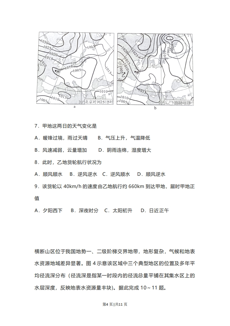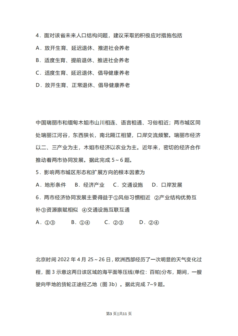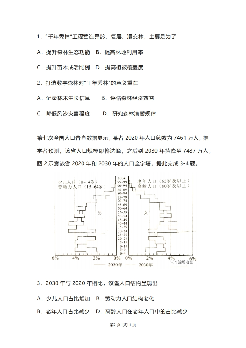 2022年河北省普通高中学业水平选择性考试注意事项:1.答卷前,考生务必将自己的姓名、考生号、考场号、座位号填写在答题卡上。2.回答选择题时,选出每小题答案后,用铅笔把答题卡上对应题目的答案标号涂黑。如需改动,用橡皮擦干净后,再选涂其他答案标号。回答非选择题时,将答案写在答题卡上。写在本试卷上无效。3.考试结束后,将本试卷和答题卡一并交回。一、单项选择题:本题共15小题,每小题3分,共45分。在每小题给出的四个选项中,只有一项是符合题目要求的。华北某国家级新区坚持生态优先、绿色发展理念,于2017年启动“干年秀林”工程,营造异龄、复层、混交林2.9万公顷,并为每棵苗木发放专属二维码(图1),进行全生命周期管理,打造数字森林。据此完成1~2题。回锦绣地理第1页|共11页1.“干年秀林”工程营造异龄、复层、混交林,主要是为了A.提升森林生态功能B.提高林地利用率C.提升苗木成活比例D.提高植被覆盖度2.打造数字森林对”干年秀林”的意义重在A.记录林木生长信息B.评估森林经济效益C.降低风沙灾害程度D.研究森林演替规律第七次全国人口普查数据显示,某者2020年人口总数为7461万人,据学者预测,该省人口规模即将达峰,之后到2030年持降至7437万人,图2示意该省2020年和2030年的人口全字塔,据此完成3-4题。100+少儿人口(0-14岁)95-99老年人口(65岁及以上)劳动力人口(15-64岁)90-94高龄人口(80岁及以上)85-8980-8475-7970-7465-6960-6455-5950-5445-49404435-3930-3425-2920-2415-1910-140-46%4%2%0%0%2%4锦地6%2020年2030年3.2030年与2020年相比,该省人口结构呈现出A.少儿人口占比增加B.劳动力人口结构老化B.老年人口占比减少D.高龄人口在老年人口中的占比减少第2页|共11页