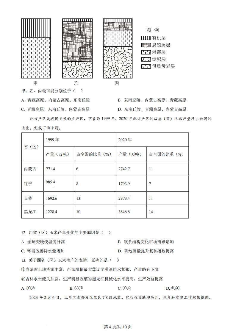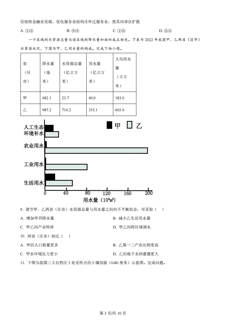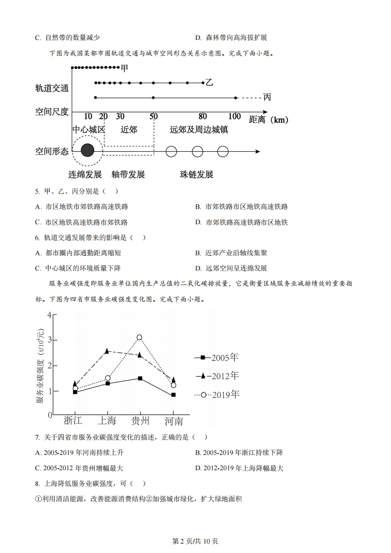 2024年1月普通高等学校招生全国统一考试地理选择题部分一、选择题(本大题共25小题,每小题2分,共50分。每小题列出的四个备选项中只有一个是符合题目要求的,不选、多选、错选均不得分)西安是关中一天水经济区中心城市,拥有国家级航空产业基地,该基地位于阁良。阁良航空产业起步于20世纪50年代末,现已发展成集研发、制造和试飞于一体的“航空城”。下图为关中一天水经济区人口点密度示意图。完成下面小题。50100km海拔(m)3600300图例O城市公航空产业基地1.影响该经济区人口分布的主要自然因素是()A.降水B.气温C.地形D.植被2.航空产业基地布局在与西安中心城区有一定距离的阁良,主要原因是()①劳动力较丰富②市场需求更大③土地供给更充足④产业基础较好A.①②B.③④C.②③D.①④南美洲赤道附近的软博拉索峰海拔6310米。1802年该峰植被分布上限是4600米,2012年上升到5185米。研究表明植被上限上升段的土壤温度有所升高。完成下面小题。3.从受热过程看,引起植被上限上升段土壤温度升高的主要原因是()A.地面辐射减少B.大气辐射减少C.太阳辐射增加D.地面吸收增加4.植被上限上升后,该山地垂直带谱中()A.雪线海拔高度下降B.上限植被是高山草甸第1页供10页C.自然带的数量减少D.森林带向高海拔扩展下图为我国某都市圈轨道交通与城市空间形态关系示意图。完成下面小题。tt●甲●●●●●●乙轨道交通---丙空间尺度1020305080100距离(km)中心城☒近郊远郊及周边城镇空间形态连绵发展轴带发展珠链发展5.甲、乙、丙分别是()A.市区地铁市郊铁路高速铁路B.市郊铁路市区地铁高速铁路C.市区地铁高速铁路市郊铁路D.市郊铁路高速铁路市区地铁6.轨道交通发展带来的影响是()A.都市圈内部通勤距离缩短B.近郊产业沿轴线集聚C.中心城区的环境质量下降D.远郊空间呈连绵发展服务业碳强度即服务业单位国内生产总值的二氧化碳排放量,它是衡量区域服务业减排绩效的重要指标。下图为四省市服务业碳强度变化图。完成下面小题。4■-2005年-4-2012年0…2019年浙江上海贵州河南7.关于四省市服务业碳强度变化的描述,正确的是()A.2005-2019年河南持续上升B.2005-2019年浙江持续下降C.2005-2012年贵州增幅最大D.2012-2019年上海降幅最大8.上海降低服务业碳强度,可()①利用清洁能源,改善能源消费结构②加强城市绿化,扩大绿地面积第2页供10页