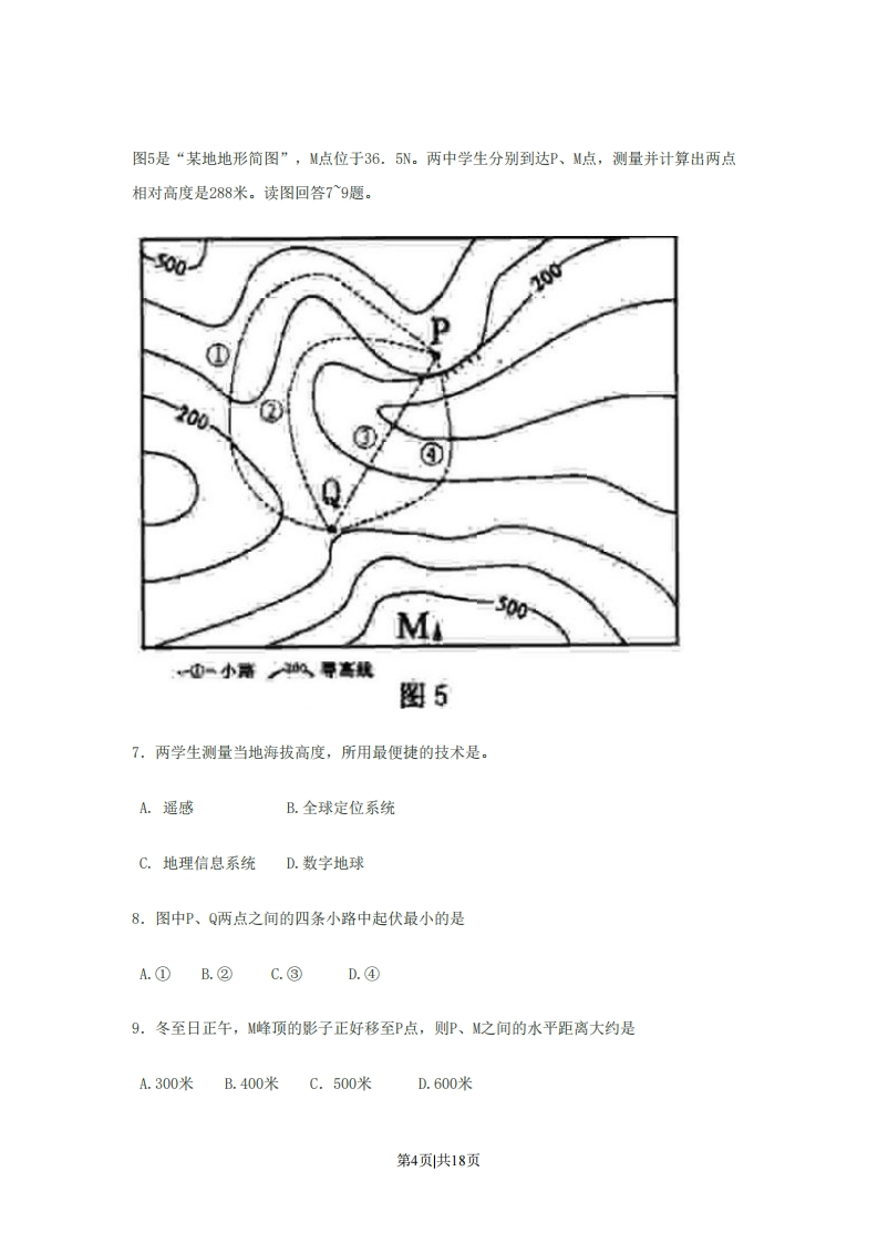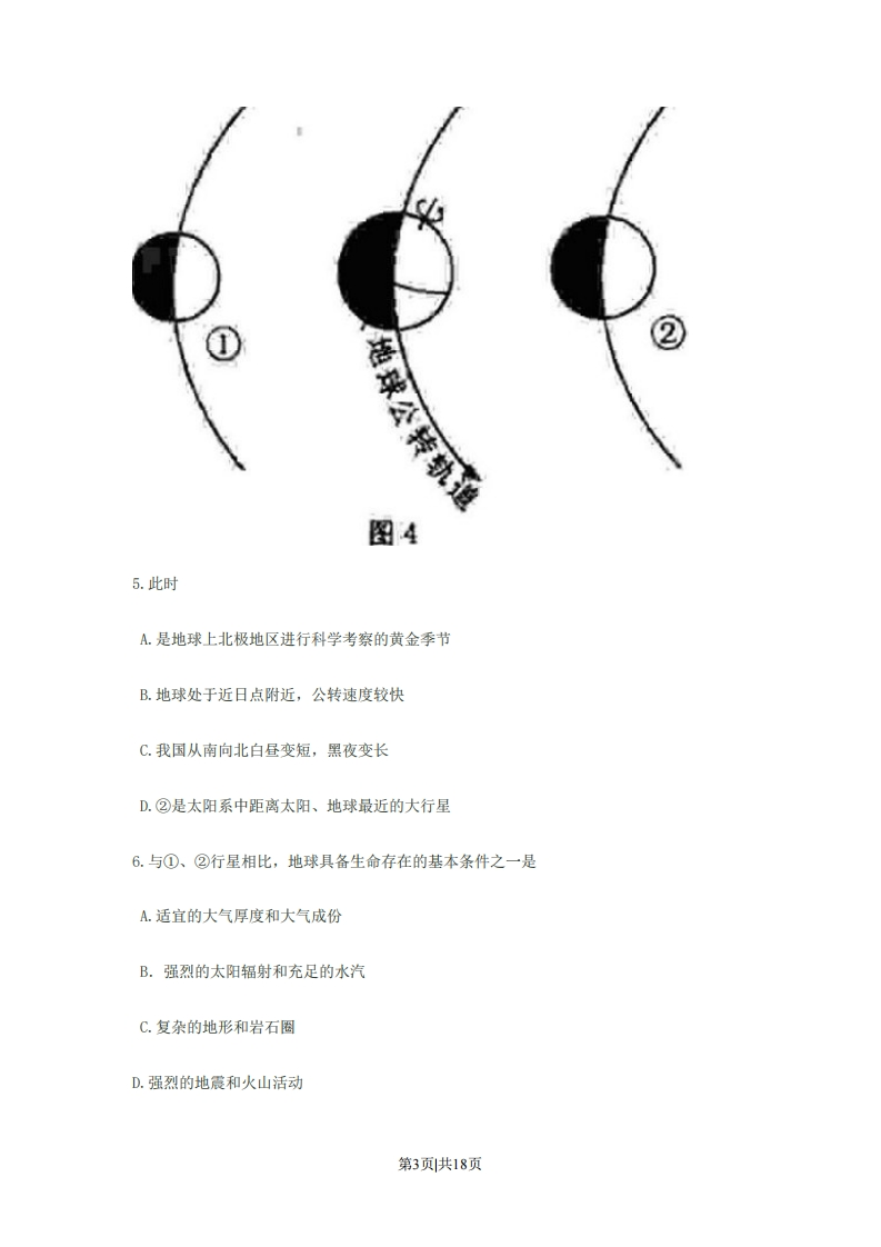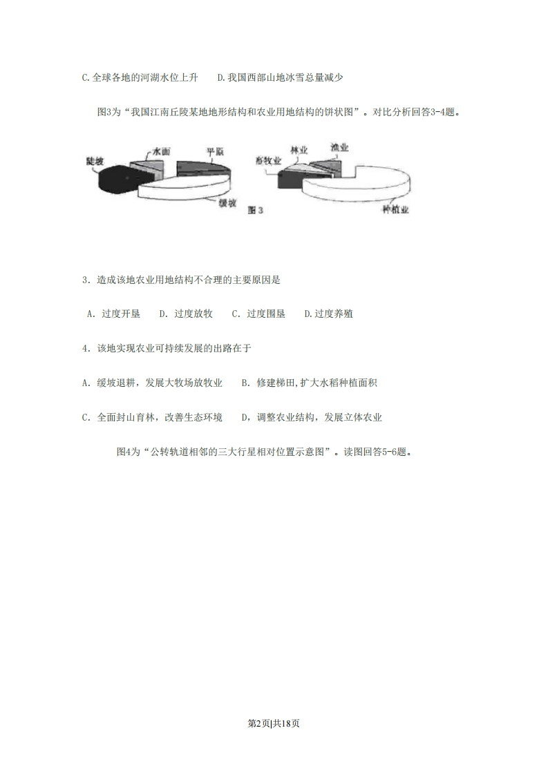 2008年高考地理试题及答案(江苏卷)一、选择题(共60分)(《一)单项选择题:本大题共18小题,每小题2分,共36分。在年小题给出的四个选项中,只有一项是符合题目要求的。图1是”护送2008奥运圣火登顶珠峰的大本营”图片,图2是浙江”雁荡胜境”图片。读图回答第1题。图图21.形成珠峰大本营附近碎屑堆积物和雁荡山陡崖峡谷的主要外力作用分别是A.风力侵蚀、流水堆积B.冰川堆积、流水侵蚀C.流水堆积、冰川侵蚀D.冰川侵蚀、风力沉积2.下列关于全球气候变暖及其影响的叙述,符合实际情况的是A.全球各地的气温持续上升B.我国各地的降水量普遍增多第1页共18页C.全球各地的河湖水位上升D.我国西部山地冰香总量减少图3为“我国江南丘陵某地地形结构和农业用地结构的饼状图”。对比分析回答3-4题。r水面平原林业渔业名牧业缓蚁图3种植业3.造成该地农业用地结构不合理的主要原因是A.过度开垦D.过度放牧C.过度围垦D.过度养殖4.该地实现农业可持续发展的出路在于A.缓坡退耕,发展大牧场放牧业B.修建梯田,扩大水稻种植面积C.全面封山育林,改善生态环境D,调整农业结构,发展立体农业图4为“公转轨道相邻的三大行星相对位置示意图”。读图回答5-6题。第2页共18页