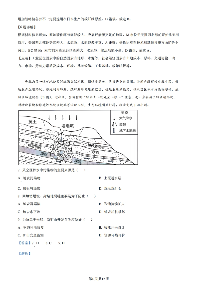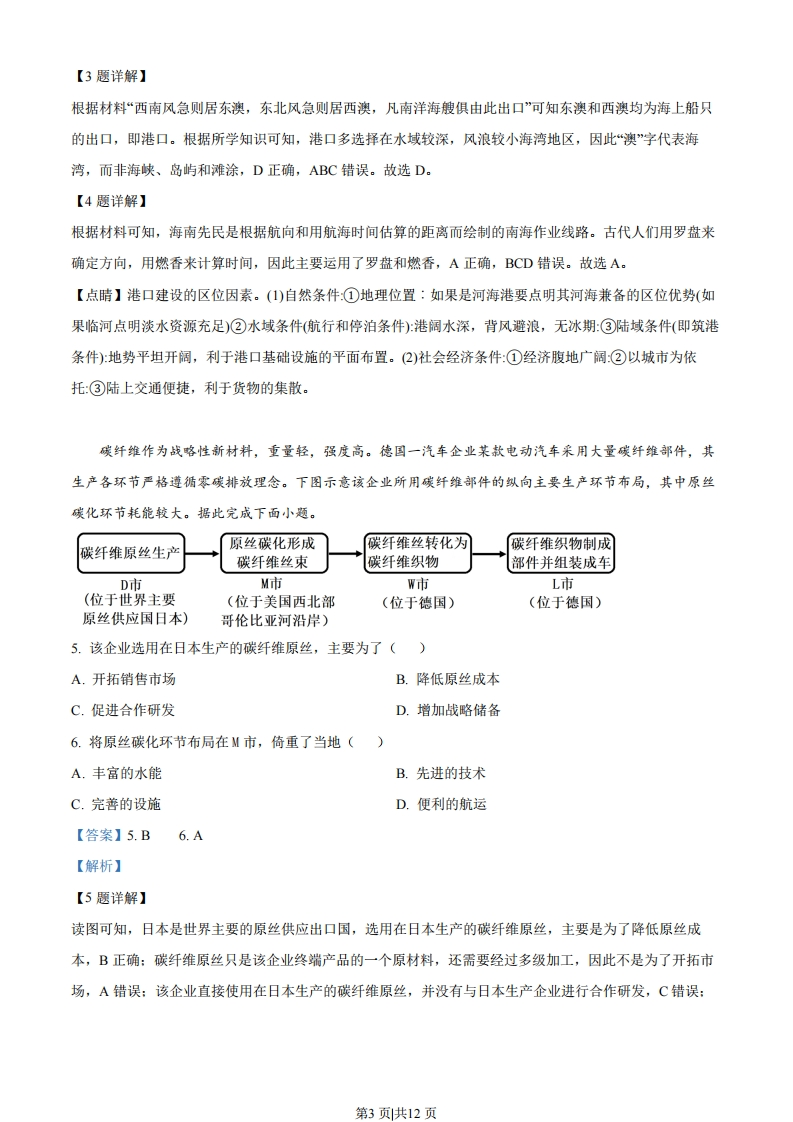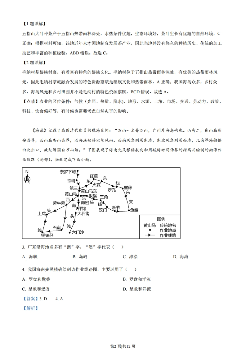 2023年河北省普通高中学业水平选择性考试地理注意事项:1.答题前,考生务必将自己的姓名、准考证号写在答题卡和本试卷上。2.回答选择题时,选出每小题答案后,用铅笔把答题卡上对应题目的答案标号框涂黑。如需改动,用橡皮擦干净后,再选涂其它答案标号。回答非选择题时,将答案写在答题卡上。写在本试卷上无效。3。考试结束后,将本试卷和答题卡一并交回。一、单项选释题:本题共16小题,每小题3分,共48分。在每小题给出的四个选项中,只有一项是符合题目要求的。五指山大叶种茶品质优良,被誉为“华夏第一早春茶”。位于五指山热带雨林深处的毛纳村,曾是一个偏远落后的黎族村寨,近年来因地制宜发展茶产业,并依托茶旅融合(下图),将生态优势转变为产业优势,走上了生态美、产业兴、生活好的发展之路。在党的二十大精神指引下,毛纳村乡村振兴的步伐越来越坚实。据此完成下面小题。1.五指山大叶种茶品质优良,得益于当地()A.悠久的种植历史B.传统的加工技艺C.优越的自然环境D.丰富的种植经验2.除茶产业之外,毛纳村茶旅融合发展的特色资源禀赋是()A.黎族文化和热带雨林B.热带雨林和乡村田园C.黎族文化和海岛风光D.海岛风光和乡村田园【答案】1.C2.A【解析】第1页共12页【1题详解】五指山大叶种茶产于五指山热带雨林深处,水热条件优越,生态环境好,茶叶生长有优越的自然环境,C正确:根据材料可知,该地近年来才因地制宜发展茶产业,因此当地并没有悠久的种植历史、传统的加工技艺和丰富的种植经验,ABD错误。故选C。【2题详解】毛纳村是黎族村寨,有着富有特色的黎族文化。毛纳村位于五指山热带雨林深处,有优美的热带雨林风光,因此毛纳村茶旅融合发展的特色资源禀赋是黎族文化和热带雨林,A正确:我国海岛众多,乡村众多,海岛风光和乡村田园并不是毛纳村的特色资源禀赋,BCD错误。故选A。【点睛】农业的区位条件:气候(光照、热量、降水)、地形、水源、土壤、市场、交通、劳动力、政策、科技、饮食偏好等,有时候也需要考虑自然灾害的影响。《海录》记载了我国清代船员的航海见闻:“万山一名鲁万山,广州外海岛屿也。山有二,东山在新安县界,西山在香山县界,沿海渔船籍以笔风雨。西南风急则居东澳,东北风急则居西澳,凡南洋海般俱由此出口,故纪海国自万山始。”下图展现了海南先民根据航向和用航海时间估算的距离而绘制的南海作业线路(局部)。据此完成下面小题。N奈罗下峙红草头铁峙线第三水哀●黄山吗黄山3东罗孔鲎藤乐劳牛劳东银锅三角南密头线支秤钩双门断节鱼鳞头大秤钩图例线石盘,线黄山马传统地名六门沙●作业地点铜铳仔作业线路3.广东沿海地名多有“澳”字,“澳”字代表()A海峡B.岛屿C.滩涂D.海湾4.我国海南先民精确绘制该作业线路图,主要运用了()A.罗盘和燃香B.罗盘和洋流C.星象和燃香D.星象和洋流【答案】3.D4.A【解析】第2页共12页