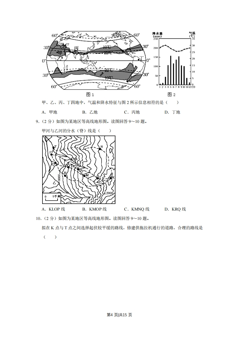 2010年江苏省高考地理试卷一、选择题:共计60分.1.(2分)2010年3月以来,北大西洋极圈附近的冰岛发生大规模火山喷发,火山灰蔓延使欧洲航空业蒙受重大损失.图为火山喷发图片.回答1~2题,导致冰岛火山灰蔓延到欧洲上空的气压带和气流是()A.副热带高气压带和西风B.副极地低气压带和西风C.副热带高气压和东北风D.副极地低气压带和东北风2.(2分)2010年3月以来,北大西洋极圈附近的冰岛发生大规模火山喷发,火山灰蔓延使欧洲航空业蒙受重大损失.图为火山喷发图片.回答1~2题.这些蔓延的火山灰物质在地球圈层中迁移的顺序是()A.大气圈→水圈、生物圈→岩石圈B.岩石圈→大气圈→水圈、生物圈C.水圈、生物圈→大气圈→岩石圈D.水圈、生物圈→岩石圈→大气圈3.(2分)图为6月22日与12月22日地球表面四地正午太阳高度.读图回答3~4题.四地按地球自转线速度由大到小排列,依次是()第1页共15页90题6月22日▣12月22日60A.甲、乙、丙、丁B.乙、丙、丁、甲C.丙、丁、甲、乙D.丁、甲、乙、丙4.(2分)图为6月22日与12月22日地球表面四地正午太阳高度.读图回答3~4题四地自北向南排列,依次是()90题6月22日▣12月22日6030A.甲、乙、丙、丁B.甲、丙、丁、乙C.丁、乙、丙、甲D.甲、丙、乙、丁5.(2分)2010年1月,海地发生7.3级地震,几十万人遇难:同年2月,智利发生8.8级地震,数百人丧生.图为两次大地震震中位置示意图.读图回答5~6题,⊙提中甲区一大板块边界板块南极洲板块两次大地震()A.震中都位于太平洋沿岸B.震中都位于两大板块交界处C.能量源自地球内部D.遇难人数的多少取决于震级的大小6.(2分)2010年1月,海地发生7.3级地震,几十万人遇难:同年2月,智利发生8.8级第2页共15页