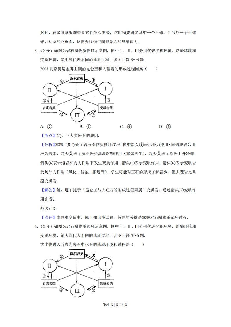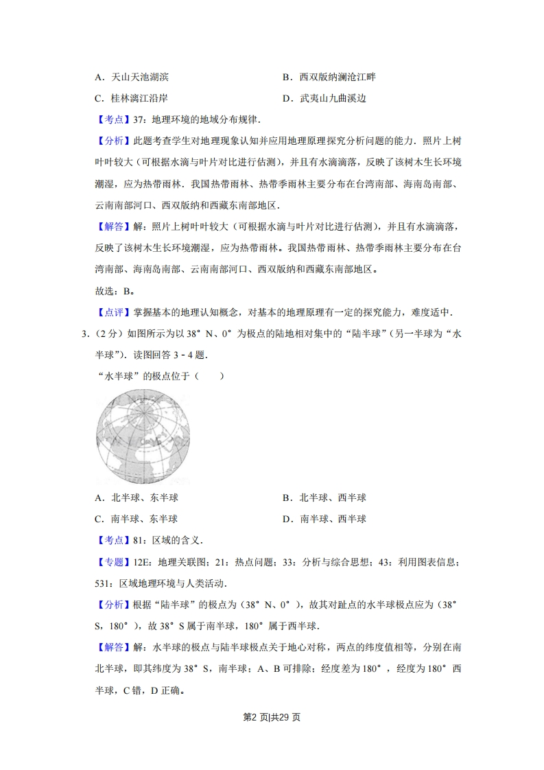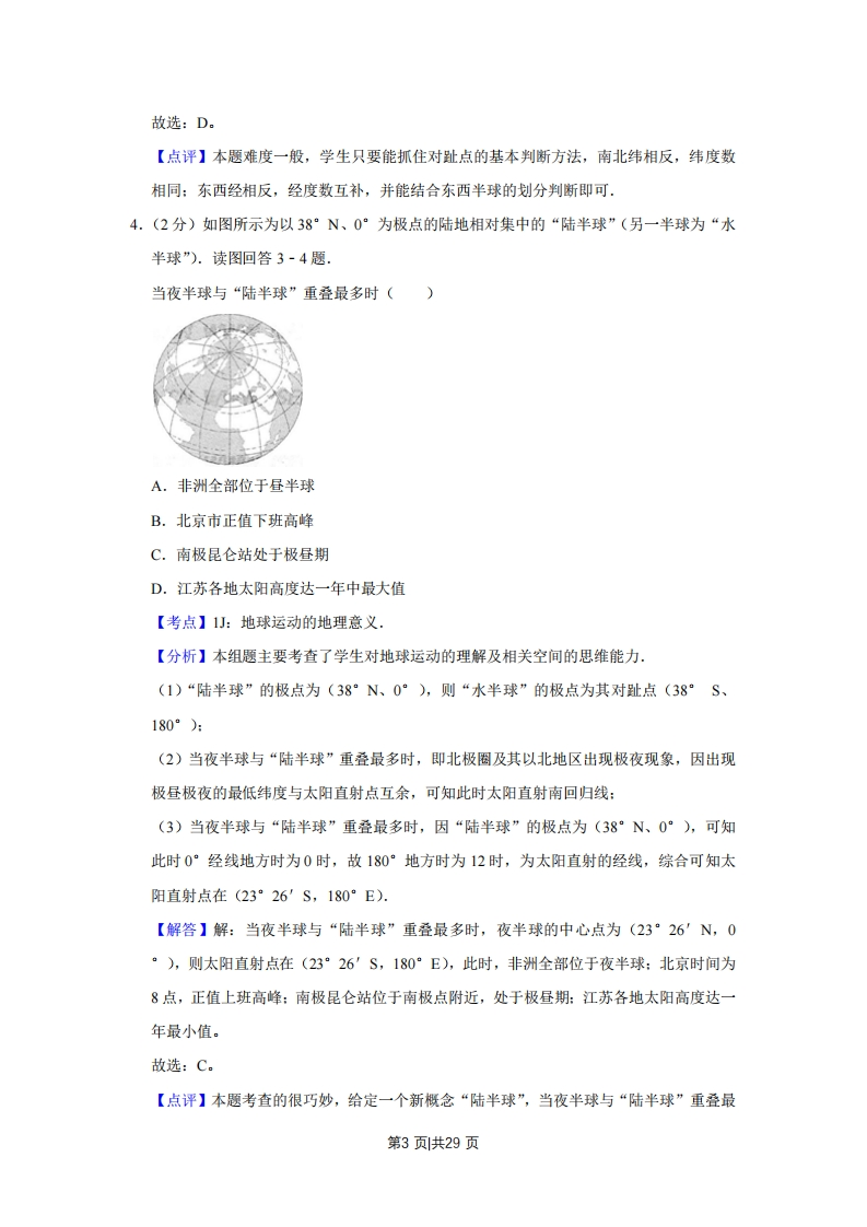 2009年江苏省高考地理试卷解析版◆考答案与试题解析一、选释题(共60分)(一)单项选择题:本大题共10小题,每小题0分,共36分,在年小题给出的四个选项中,只有1一项是符合题目要求的.1.(2分)如图是一张反映“滴水叶尖”现象的照片.据此回答1~2题该现象常年出现在()A.温带落叶阔叶林B.热带草原C.亚热带常绿硬叶林D.热带雨林【考点】37:地理环境的地域分布规律,【分析】此题考查学生对地理现象认知并应用地理原理探究分析问题的能力.从树叶的大小结构和水滴滴落的特征判断即可得出答案,【解答】解:照片上树叶叶较大(可根据水滴与叶片对比进行估测),并且有水滴滴落,反映了该树木生长环境潮湿,应为热带雨林。故选:D。【点评】掌握基本的读图析图的技巧,培养基本的分析能力和推测能力,难度适中2.(2分)如图是一张反映“滴水叶尖”现象的照片.据此回答1~2题.该现象在我国较普遍出现于()第1页共29页A,天山天池湖滨B.西双版纳澜沧江畔C.桂林漓江沿岸D.武夷山九曲溪边【考点】37:地理环境的地域分布规律【分析】此题考查学生对地理现象认知并应用地理原理探究分析问题的能力.照片上树叶叶较大(可根据水滴与叶片对比进行估测),并且有水滴滴落,反映了该树木生长环境潮湿,应为热带雨林.我国热带雨林、热带季雨林主要分布在台湾南部、海南岛南部、云南南部河口、西双版纳和西藏东南部地区。【解答】解:照片上树叶叶较大(可根据水滴与叶片对比进行估测),并且有水滴滴落,反映了该树木生长环境潮湿,应为热带雨林。我国热带雨林、热带季雨林主要分布在台湾南部、海南岛南部、云南南部河口、西双版纳和西藏东南部地区。故选:B。【点评】掌握基本的地理认知概念,对基本的地理原理有一定的探究能力,难度适中.3.(2分)如图所示为以38°N、0°为极点的陆地相对集中的“陆半球”(另一半球为“水半球”).读图回答3-4题.“水半球”的极点位于()A.北半球、东半球B.北半球、西半球C.南半球、东半球D.南半球、西半球【考点】81:区域的含义,【专题】12E:地理关联图:21:热点问题:33:分析与综合思想:43:利用图表信息:531:区域地理环境与人类活动.【分析】根据“陆半球”的极点为(38°N、0°),故其对趾点的水半球极点应为(38S,180°),故38°S属于南半球,180°属于西半球.【解答】解:水半球的极点与陆半球极点关于地心对称,两点的纬度值相等,分别在南北半球,即其纬度为38°S,南半球:A、B可排除:经度差为180°,经度为180°西半球,C错,D正确。第2页共29页