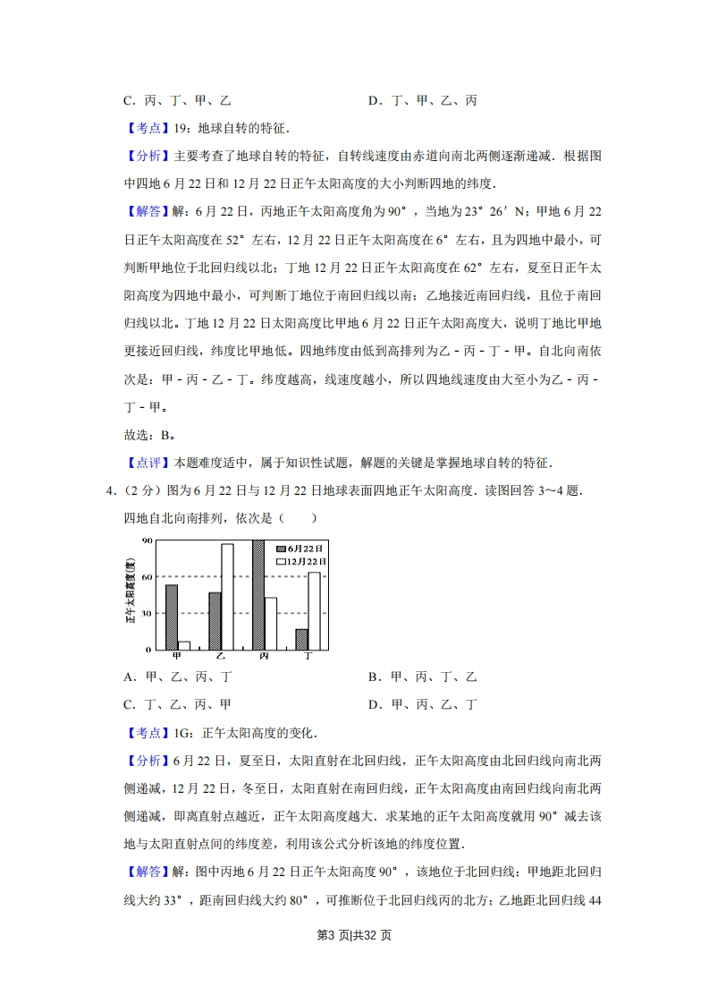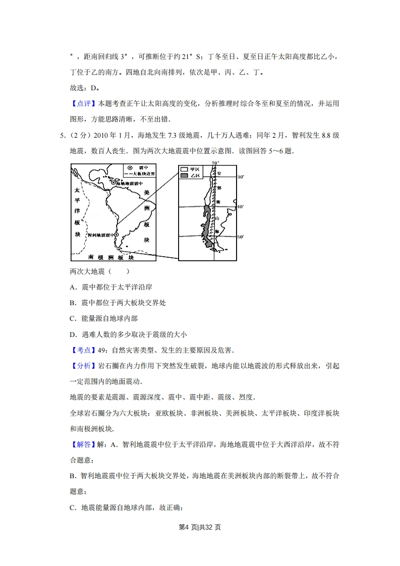 2010年江苏省高考地理试卷解析版事考答案与试题佩折一、选择题:共计60分,1.(2分)2010年3月以来,北大西洋极圈附近的冰岛发生大规模火山喷发,火山灰蔓延使欧洲航空业蒙受重大损失.图为火山喷发图片.回答1一2题。导致冰岛火山灰蔓延到欧洲上空的气压带和气流是()A.副热带高气压带和西风B.副极地低气压带和西风C.副热带高气压和东北风D.副极地低气压带和东北风【考点】25:气压带、风带的分布及移动,【分析】本题考查冰岛位置和气压带风带的分布.冰岛位于北极圈以南附近,根据全球气压带风带的分布,冰岛正好受副极地低气压带控制,而冰岛以南是西风带,盛行西风,所以在副极地低气压带上升气流和西风带西风的影响下,冰岛火山灰蔓延到欧洲上空.【解答】解:A、副热带高气压带位于30°附近,冰岛不受其控制,故不符合题意:B、冰岛位于北极圈以南附近,正好受副极地低气压带和西风影响,故正确:C、副热带高气压和东北风分别位于30°附近和高低纬度地区,故不符合题意:D、东北风位于高低纬度地区,故不符合题意。故选:B。【点评】本题以2010年春季冰岛的火山多次喷发为材料,考查了冰岛所处的气压带和火山喷发对交通的影响.难度一般,熟练掌握气压带风带即可解答此题2.(2分)2010年3月以来,北大西洋极圈附近的冰岛发生大规模火山喷发,火山灰蔓延使欧洲航空业蒙受重大损失.图为火山喷发图片.回答1~2题,这些蔓延的火山灰物质在地球圈层中迁移的顺序是()第1页共32页A.大气圈→水圈、生物圈→岩石圈B.岩石圈→大气圈→水圈、生物圈C.水圈、生物圈→大气圈→岩石圈D.水圈、生物圈→岩石圈→大气圈【考点】1K:地球的圈层结构,【分析】主要考查了地球的圈层结构,岩石圈、大气圈、水圈、生物圈四大圈层相互联系、相互作用.此图为“地球圈层结构示意图”,最上面是大气圈,中间是水圈,最下面是岩石圈,其中,生物圈位于大气圈的底部、水圈的全部、岩石圈的上部.要注意的是火山灰,其己经是漂浮在大气圈中,而不是从火山灰的来源出发,然后进入水圈、生物圈再回到岩石圈.【解答】解:由题干“蔓延的火山灰”知火山灰在地球圈层中迁移的顺序不是从火山灰的来源开始,又根据“地球圈层结构示意图”,最上面是大气圈,中间是水圈,最下面是岩石圈,其中,生物圈为于大气圈的底部、水圈的全部、岩石圈的上部。很显然火山灰漂浮在大气圈中慢慢会沉积下来进入到水圈、生物圈最终沉积下来到岩石圈。故蔓延的火山灰物质在地球圈层中迁移的顺序是大气圈-水圈-生物圈-岩石圈。故选:A【点评】本题难度较小,属于基础题,解题的关键是掌握地球的圈层结构3.(2分)图为6月22日与12月22日地球表面四地正午太阳高度.读图回答3~4题,四地按地球自转线速度由大到小排列,依次是()90器6月22日☐12月22日A.甲、乙、丙、丁B.乙、丙、丁、甲第2页共32页