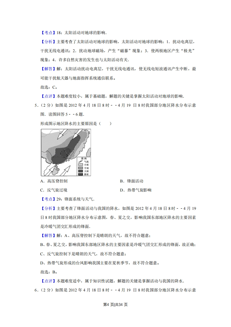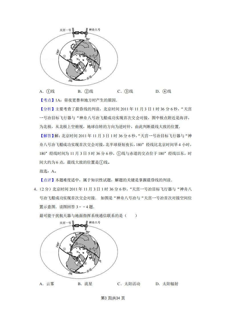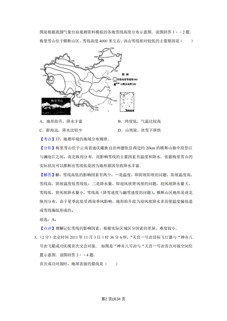 2012年江苏省高考地理试卷解析版◆考答案与试题解析一、选择题(共60分)(一)单项选择题:本大题共9小题,每小题0分,共计36分,在年小题给出的四个选项中,只有一项是符合题目要求的.1.(2分)雪线高度是指永久性积雪的下限高度,与所在地区的气温与降水有密切关系.如图是根据我国气象台站观测资料模拟的各地雪线高度分布示意图.读图回答1·-2题。模拟的我国雪线高度分布的基本趋势是(图例雪线高度等值线(m)△?40山峰及高程(m)梅里雪山诸到A.从南向北逐渐升高B.从西向东逐渐升高C.从西南向东北逐渐降低D.从西北向东南逐渐降低【考点】37:地理环境的地域分布规律【分析】该图主要考察了基本的读图能力。同一等值线上数值相等,认真看图数值,找出最大值及最小值,以及之间的递变规律。【解答】解:雪线高低的影响因素有两个:一是温度,纬度越高温度越低,造成雪线越低,而同一座山脉上阴坡阳坡的问题,阳坡温度高,雪线高,阴坡温度低雪线低:二是降水量,即迎风坡背风坡的问题,迎风坡降水量大,雪线低,背风坡降水量小,雪线高(降雪速度与融雪速度的问题)。依据图形中雪线高度等值线分布情况可以看出:西南地区由于纬度较低,温度较高使雪线较高,而向东北方向逐渐递减。故雪线高度分布自西南向东北逐渐降低,东北最低。故选:C。【点评】学会根据图形掌握一定的获取和解读信息的能力,难度较小。2.(2分)雪线高度是指永久性积雪的下限高度,与所在地区的气温与降水有密切关系.如第1页共34页图是根据我国气象台站观测资料模拟的各地雪线高度分布示意图.读图回答1·-2题。梅里雪山位于横断山区,雪线高度4000米左右.该山雪线相对较低的主要原因是()图例Q雪拔高度等值线(m)?40山峰及高餐(m)梅里雪山A.地形抬升,降水丰富B.纬度低,气温比较高C.距海远,降水比较少D.山坡陡,冰雪下移快【考点】37:地理环境的地域分布规律【分析】梅里雪山位于云南省迪庆藏族自治州德钦县西边约20k的横断山脉中段怒江与澜沧江之间,南北纵列分布.而影响雪线的主要因素有温度和降水.依据梅里雪山的实际状况可以推断出雪线低是因为地形原因导致降水丰富.【解答】解:雪线高低的影响因素有两个:一是温度,即阴坡阳坡的问题,阳坡温度高,雪线高,阴坡温度低雪线低:二是降水量,即迎风坡背风坡的问题,迎风坡降水量大,雪线低,背风坡降水量小,雪线高(降雪速度与融雪速度的问题)。横断山区地形是南北纵列分布,由于夏季此处受西南季风影响,地形抬升故为迎风坡降水多而使温度偏低造成雪线偏低形成的。故选:A。【点评】理解记忆雪线的影响因素,根据实际区域区分因素的差异,难度较小3.(2分)北京时间2011年11月3日1时36分6秒,“天宫一号冶目标飞行器与“神舟八号治飞船成功实现首次交会对接.如图是“神舟八号治与“天宫一号治首次对接空间位置示意图.读图回答3--4题,首次成功对接时,地球表面的晨线是()第2页共34页