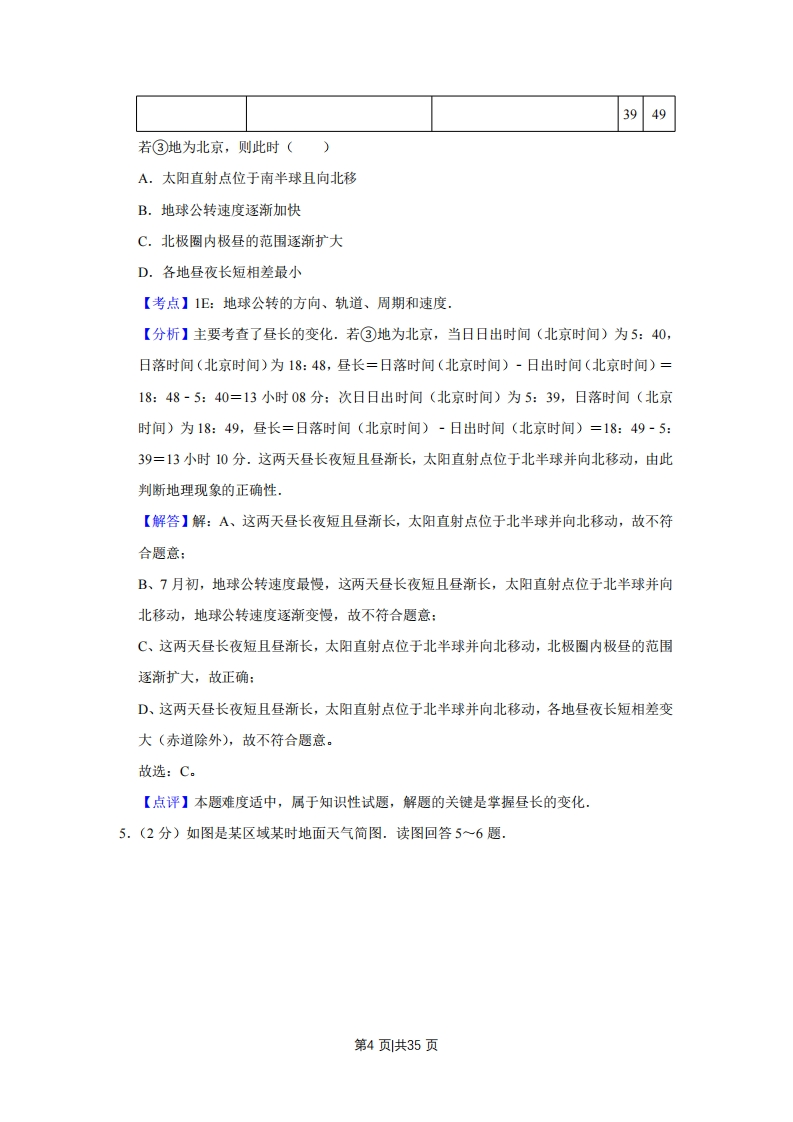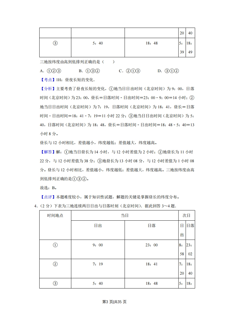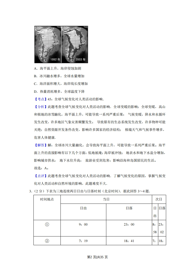 2011年江苏省高考地理试卷解析版◆考答案与试题解析一、选择题(共36分)单项选择题:本大题共9小题,每小题0分,共计36分.在每小题给出的四个选项中,只有一项是符合题目要求的,1.(2分)如图是1992年和2003年格陵兰冰原面积对比图.读图回答1~2题。1992年至2003年格陵兰冰原面积不断缩小,反映了()1992年2003年A.地壳活动强烈B.日地距离缩短C.黄赤交角增大D.全球气候变暖【考点】45:全球气候变化对人类活动的影响。【分析】此题考查全球气候变化对人类活动的影响.全球变暖的影响:全球变暖,高山和极地的冰雪融化,海平面上升,可能导致一系列严重后果:气候变暖,降水和水循环发生改变,许多地区气象灾害频繁发生:导致原有的生态系统发生改变,许多物种可能灭绝:自然资源开发条件改变,影响许多国家的经济结构:极端天气和气候事件增多,危害人体健康【解答】解:格陵兰冰原面积不断缩小,很显然是由于全球变暖,高山和极地的冰雪融化。故选:D。【点评】此题考查全球气候变化对人类活动的影响.了解气候变化的原因,掌握气候变化对人类活动和自然环境的影响,此题难度不大,2.(2分)如图是1992年和2003年格陵兰冰原面积对比图.读图回答1一2题,全球冰川大量融化和退缩会导致()第1页共35页1992年2003年A.海平面上升,海岸侵蚀加剧B.冰川融水增多,全球水量增加C.海洋面积增大,海岸线长度增加D.热量消耗增多,全球温度下降【考点】45:全球气候变化对人类活动的影响.【分析】此题考查全球气候变化对人类活动的影响.全球变暖的影响:全球变暖,高山和极地的冰雪融化,海平面上升,可能导致一系列严重后果:气候变暖,降水和水循环发生改变,许多地区气象灾害频繁发生:导致原有的生态系统发生改变,许多物种可能灭绝:自然资源开发条件改变,影响许多国家的经济结构:极端天气和气候事件增多,危害人体健康【解答】解:全球冰川大量融化,会导致海平面上升,可能导致一系列严重后果。海平面上升的直接影响有以下几个方面:低地被淹:海岸被冲蚀:地表水和地下水盐分增加,影响城市供水:地下水位升高:旅游业受到危害:影响沿海和岛国居民的生活。故选:A。【点评】此题考查全球气候变化对人类活动的影响.了解气候变化的原因,掌握气候变化对人类活动和自然环境的影响,此题难度不大,3.(2分)下表为三地连续两日日出与日落时刻(北京时间).据此回答3~4题.时间地点当日次日日出日落◇日落出①9:0023:008:23:5802②7:1918:417:18:第2页共35页