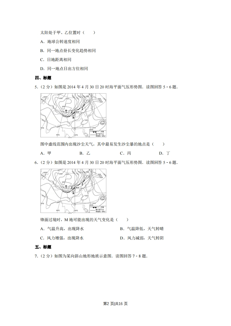 2014年江苏省高考地理试卷一、选择思1.(2分)《桃花源记》中描述:“缘溪行,忘路之远近.忽逢桃花林,…林尽水源,便得一山,山有小口,仿佛若有光.便舍船,从口入.初极狭,才通人·复行数十步,豁然开朗.土地平旷,屋舍俨然,有良田美池桑竹之属.”据此回答1-2题.“桃花源”的地形最可能是()A.山间峡谷B.山前平原C.山间盆地D.平缓高原2.(2分)《桃花源记》中描述:“缘溪行,忘路之远近.忽逢桃花林,…林尽水源,便得一山,山有小口,仿佛若有光.便舍船,从口入.初极狭,才通人.复行数十步,豁然开朗.土地平旷,屋舍俨然,有良田美池桑竹之属.”据此回答1-2题,“桃花源”环境与下列因素紧密相关的是()A,地理位置B.灌溉系统C.农业科技D.水力资源三、标思3.(2分)在地球公转过程中,若以地球为参照系,可看到太阳在黄道上运行.图1是天赤道与黄道的示意图,图2是太阳在黄道上的视运行轨迹图.读图回答3-4题.夏至点黄道,春分点天水通春分点分图1图26月初,太阳在黄道上的位置是(A.甲B.乙C.丙D.丁4.(2分)在地球公转过程中,若以地球为参照系,可看到太阳在黄道上运行.图1是天赤道与黄道的示意图,图2是太阳在黄道上的视运行轨迹图.读图回答3-4题.黄道春分点天通春分点分条至点图1图2第1页共16页太阳处于甲、乙位置时()A.地球公转速度相同B.同一地点昼长变化趋势相同C.日地距离相同D.同一地点日出方位相同四、标题5.(2分)如图是2014年4月30日20时海平面气压形势图.读图回答5-6题.图中虚线范围内出现沙尘天气,其中最易发生沙尘暴的地点是()A.甲B.乙C.丙D.丁6.(2分)如图是2014年4月30日20时海平面气压形势图.读图回答5-6题.锋面过境时,M地可能出现的天气变化是()A.气温升高,出现降水B.气温降低,天气转晴C.风力增强,出现降水D.风力减弱,天气转阴五、标题7.(2分)如图为某向斜山地形地质示意图.读图回答7-8题,第2页共16页