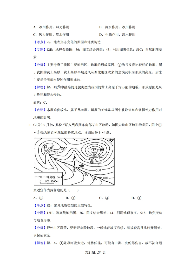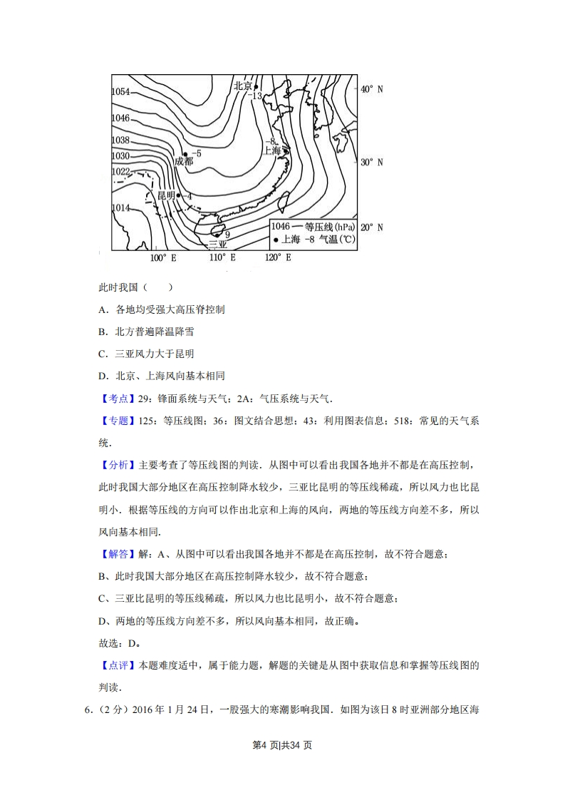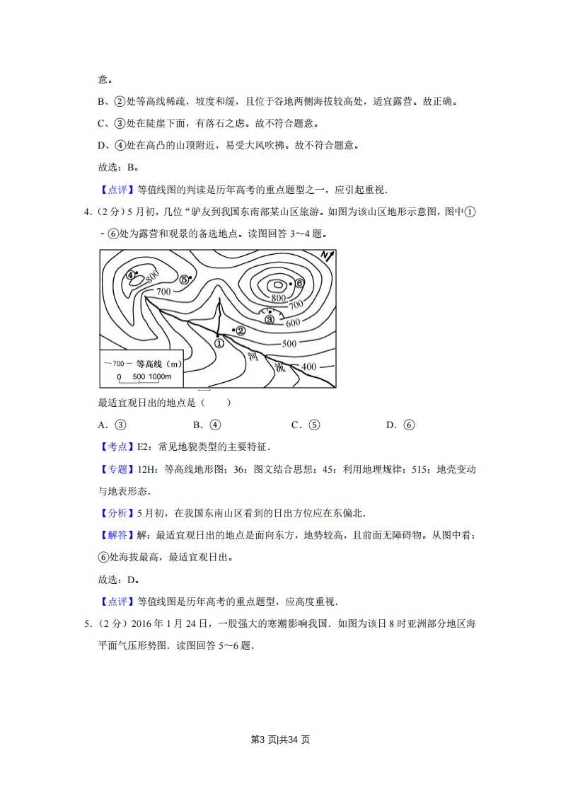 2016年江苏省高考地理试卷解析版◆考答案与试题解析一、单项选择题:本大题共9小题,每小题0分,共计36分,在每小题给出的四个选项中,只有一项是符合题目要求的,1.(2分)中国山水画家多师法自然,其作品往往具有明显的地域特征.图1为我国四幅山水画作品.读图回答1~2题,①画中描绘江南丘陵景观的是()A.①B.②c.③D.④【考点】82:自然环境、人类活动的区域差异.【专题】12D:地理漫画图:36:图文结合思想:43:利用图表信息:51D:地理环境的整体性和差异性.【分析】地理环境具有明显的区域差异,这种差异往往表现在地理景观上,【解答】解:从四幅山水画作品中可以读出,①是天坑,②是桂林山水,这两者都是喀斯特地貌:③是黄土高原,黄土高原的形成是风力搬运沉积,现在的千沟万壑是流水侵蚀所致:④是雨朦胧,小桥流水的江南景致。故选:D。【点评】不同区域可能表现出不同的自然景观,学习中注意这些景观差别很重要,2.(2分)中国山水画家多师法自然,其作品往往具有明显的地域特征.图1为我国四幅山水画作品.读图回答1~2题,①②34画③中描绘的地貌类型形成于原因是()第1页共34页A,冰川作用、风力作用B.流水作用、冰川作用C.风力作用、流水作用D.生物作用、流水作用【考点】2S:地表形态变化的原因和地质构造【专题】12E:地理关联图:36:图文结合思想:43:利用图表信息:51C:自然地理要素。【分析】主要考查了我国主要地形区,地形的形成原因.③沟谷发育比较好的地形,属于我国的黄土高原。黄土高原早期是风从西北地区吹来的尘埃沉积而形成的高原,后来主要是受到流水侵蚀作用形成的,【解答】解:画③中描绘的地貌类型为我国的黄土高原千沟万壑的地貌,形成原因是风力堆积和流水侵蚀。故选:C。【点评】本题难度较小,属于基础题,解题的关键是从图中获取信息和掌握外力作用对地貌的影响。3.(2分)5月初,几位“驴友到我国东南部某山区旅游。如图为该山区地形示意图,图中①-⑥处为露营和观景的备选地点。读图回答3一4题。600②500700-等高线(m)40005001000m最适宜作为露营地的是()A.①B.②C.③D.④【考点】E2:常见地貌类型的主要特征【专题】12H:等高线地形图:36:图文结合思想:44:利用地理事实:515:地壳变动与地表形态【分析】野外山区露营,要避开危险地段,一般选在坡度和缓,海拔较高且比较开阔处,以保证安全,【解答】解:A、①处靠河流太近,地势低洼,可能有山洪、虫蛇等伤害。故不符合题第2页共34页