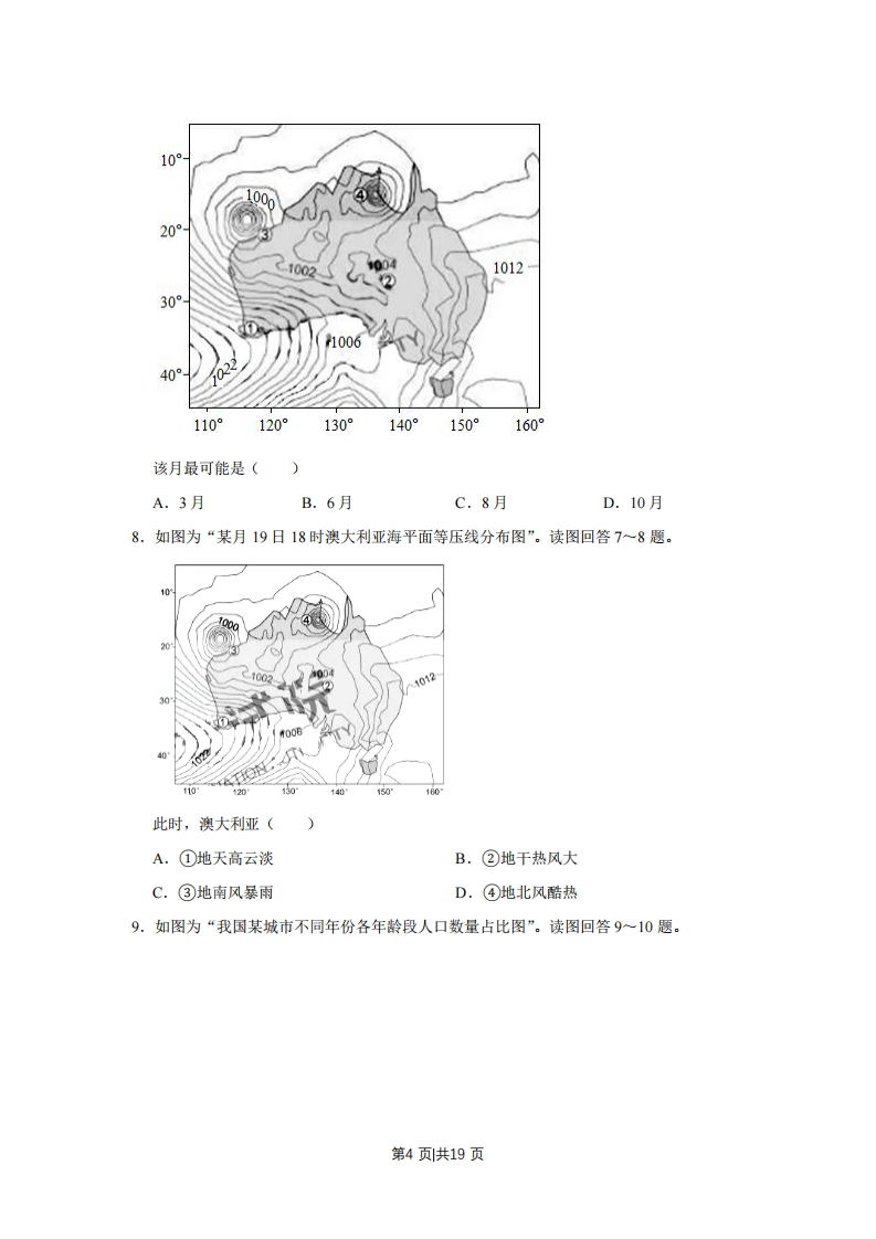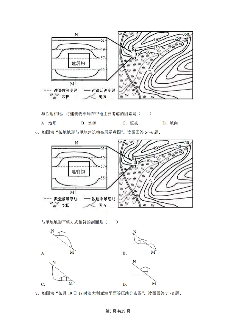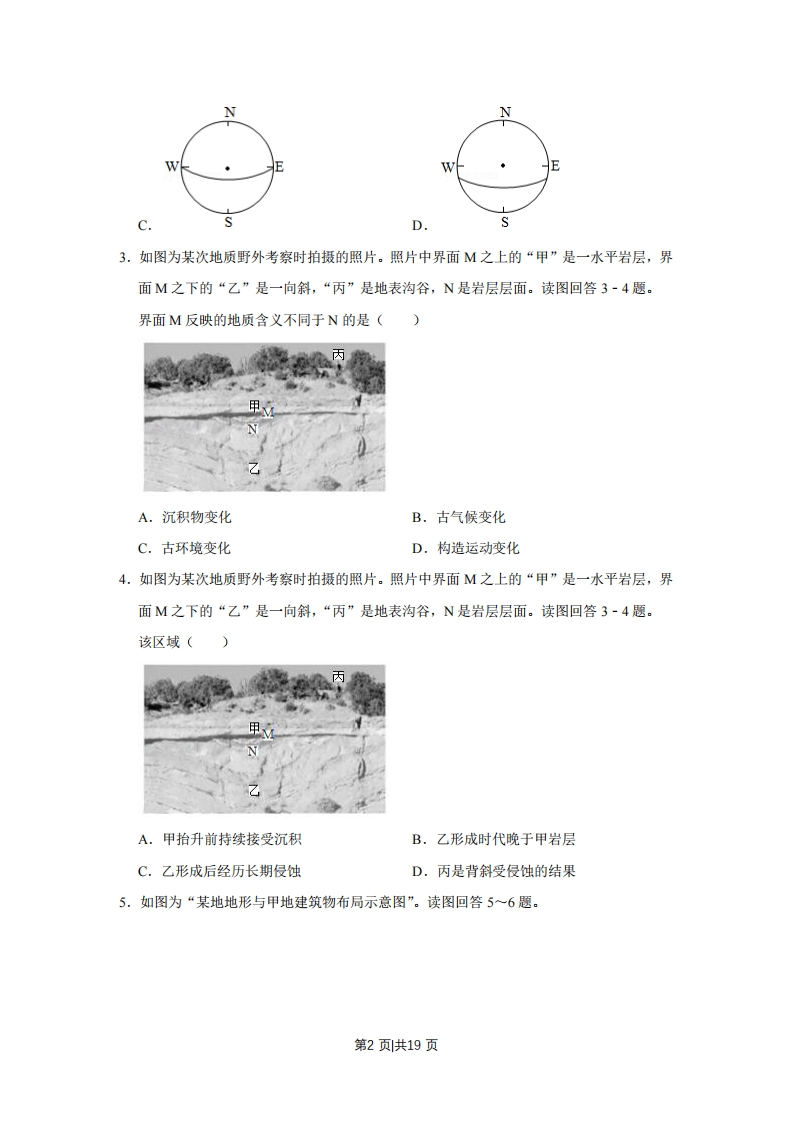 2019年江苏省高考地理试卷一、选择题(共60分)(一)单项选择题:本大题共9小题,每小题4分,共计36分.在每小题给出的四个选项中,只有一项是符合题目要求的,1.雾灵山位于北京与承德交界处,海拔2118米,素有“京东第一峰”的美称,是观赏日出和日落的理想之地。如表为“雾灵山部分日期的日出和日落时刻表”。据此回答1-2题。如表日期日出时刻日落时刻①7:3217:08②6:3118:15③4:4519:39④7:2216:49四个日期中,太阳直射点最靠近赤道的是()A.①B.②c.③D.④2.雾灵山位于北京与承德交界处,海拔2118米,素有“京东第一峰”的美称,是观赏日出和日落的理想之地。如表为“雾灵山部分日期的日出和日落时刻表”。据此回答1-2题。如表日期日出时刻日落时刻①7:3217:08②6:3118:15③4:4519:39④7:2216:49一游客于7月某日去雾灵山旅游,当日的太阳视运动轨迹是(NNEAB.第1页共19页NEWEC.DS3.如图为某次地质野外考察时拍摄的照片。照片中界面M之上的“甲”是一水平岩层,界面M之下的“乙”是一向斜,“丙”是地表沟谷,N是岩层层面。读图回答3-4题。界面M反映的地质含义不同于N的是()A.沉积物变化B.古气候变化C.古环境变化D.构造运动变化4.如图为某次地质野外考察时拍摄的照片。照片中界面M之上的“甲”是一水平岩层,界面M之下的“乙”是一向斜,“丙”是地表沟谷,N是岩层层面。读图回答3-4题。该区域()丙甲A.甲抬升前持续接受沉积B.乙形成时代晚于甲岩层C.乙形成后经历长期侵蚀D.丙是背斜受侵蚀的结果5.如图为“某地地形与甲地建筑物布局示意图”。读图回答5~6题。第2页共19页