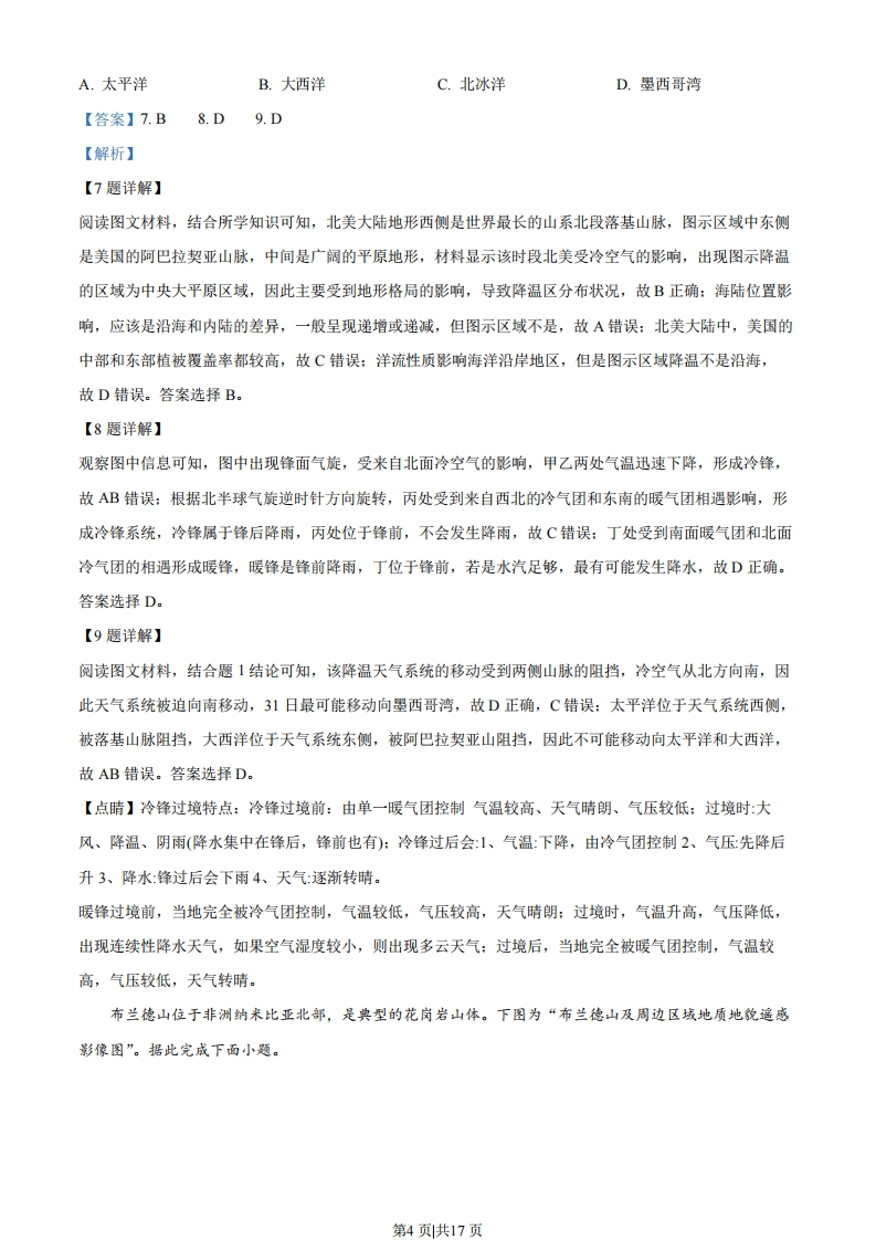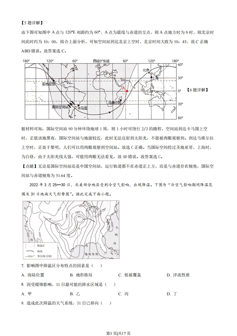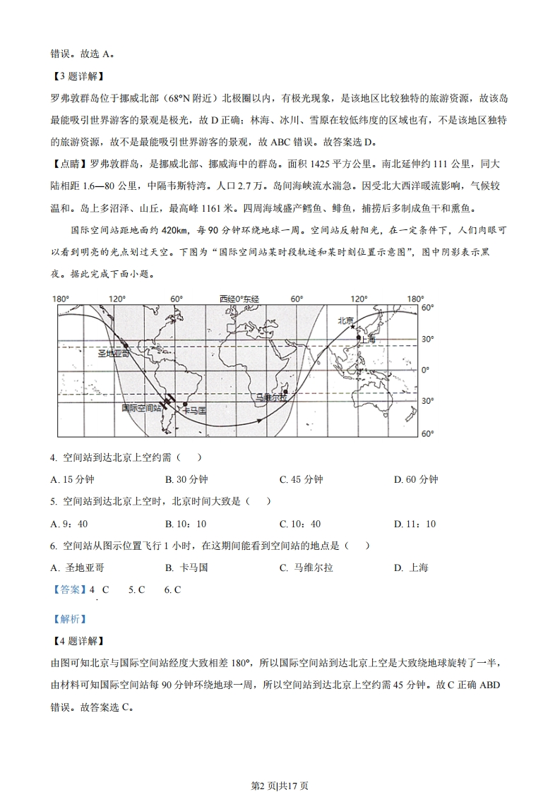 江苏省2022年普通高中学业水平选择性考试地理一、单项选释题:共23题,每题2分,共46分。每题只有一个选项最符合题意。罗弗敦群岛位于挪威北部(68°N附近),捕鱼为岛上居民主要经济活动。下图为“罗弗敦群岛聚落景观图”。据此完成下面小题。1.许多居民房屋底部以木柱支撑,屋顶用厚重石板铺设,这样建造主要是为了()A.防御海浪,便于出行B.扩展用地,抵御强风C.稳固地基,承受积雪D.减少潮湿,保暖防寒2.岛上搭建了许多木架,其主要功能是(A.风干海鱼B.晾晒衣物C.堆放薪柴D.圈养牲畜3.该岛最能吸引世界游客的景观是()A.林海B.冰川C.雪原D.极光【答案】1.B2.A3.D【解析】【1题详解】由图可知,该地地势起伏大,平地狭小,房屋底部以木柱支撑目的主要扩展平整的用地空间,由材料知该区域为岛屿,四面环海,风力强劲,屋项用厚重石板铺设,目的为了抵御强风,防止强风掀翻屋顶。故B正确:屋顶用厚重石板铺设,对防御海浪,便于出行关系不大,故A错误:减少屋顶积雪的承受,应将增加屋顶坡度,与屋顶用厚重石板铺设无关,故C错误:保暖防寒与屋顶用厚重石板铺设无关,故D错误。故选B。【2题详解】由材料可知岛上居民主要经济活动为捕鱼,搭建许多木架主要是用来晾晒鱼干,故A正确:晾晒衣物不会搭建许多木架,故B错误,由图中木架的形状,可知搭建的木架不是用来堆放薪柴、圈养牲畜的。故CD第1页共17页错误。故选A。【3题详解】罗弗敦群岛位于挪威北部(68N附近)北极圈以内,有极光现象,是该地区比较独特的旅游资源,故该岛最能吸引世界游客的景观是极光,故D正确:林海、冰川、雪原在较低纬度的区域也有,不是该地区独特的旅游资源,故不是最能吸引世界游客的景观,故ABC错误。故答案选D。【点睛】罗弗敦群岛,是挪威北部、挪威海中的群岛。面积1425平方公里。南北延伸约111公里,同大陆相距1.6一80公里,中隔韦斯特湾。人口2.7万。岛间海峡流水湍急。因受北大西洋暖流影响,气候较温和。岛上多沼泽、山丘,最高峰1161米。四周海域盛产鳕鱼、鲱鱼,捕捞后多制成鱼干和熏鱼。国际空间站距地面约420km,每90分钟环绕地球一周。空间站反射阳光,在一定条件下,人们肉眼可以看到明亮的光点划过天空。下图为“国际空间站某时段轨迹和某时刻位置示意图”,图中阴影表示黑夜。据此完成下面小题。1801209609西经0东经601209180°数1609北3030闺际空间站卡马604.空间站到达北京上空约需()A.15分钟B.30分钟C.45分钟D.60分钟5.空间站到达北京上空时,北京时间大致是()A.9:40B.10:10C.10:40D.11:106.空间站从图示位置飞行1小时,在这期间能看到空间站的地点是()A.圣地亚哥B.卡马国C.马维尔拉D.上海【答案】4C5.C6.【解析】【4题详解】由图可知北京与国际空间站经度大致相差180°,所以国际空间站到达北京上空是大致绕地球旋转了一半,由材料可知国际空间站每90分钟环绕地球一周,所以空间站到达北京上空约需45分钟。故C正确ABD错误。故答案选C。第2页共17页