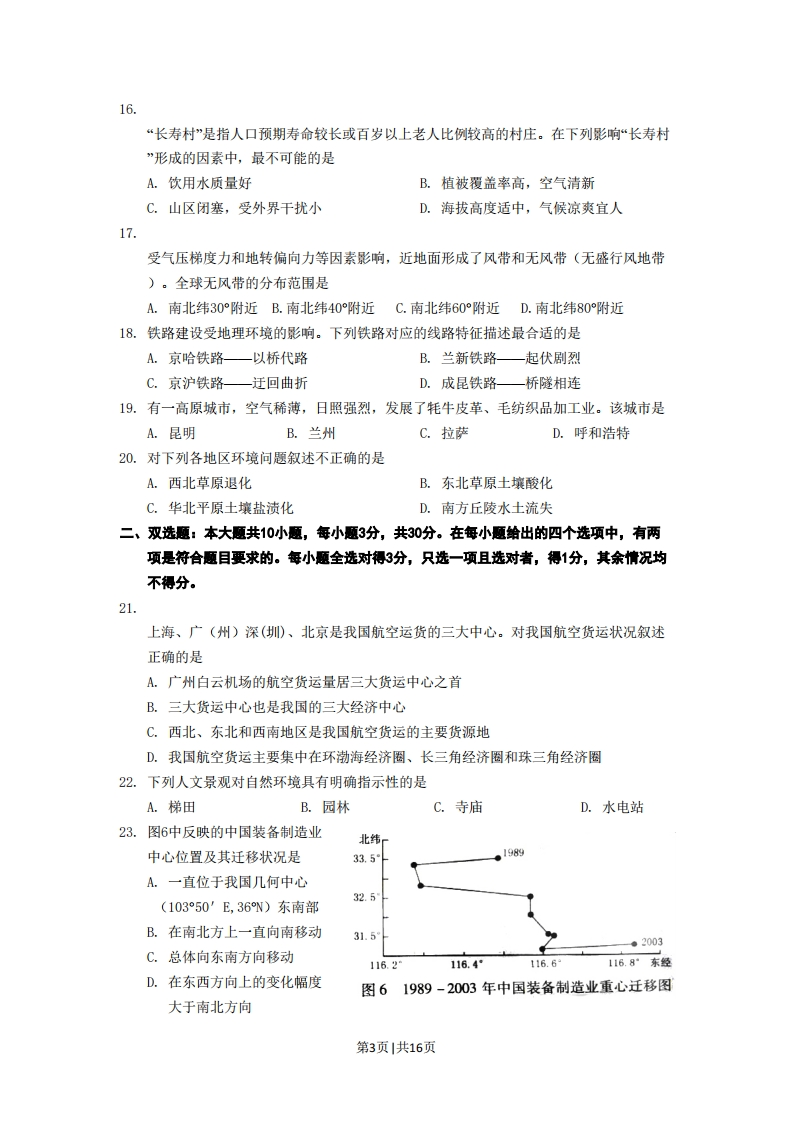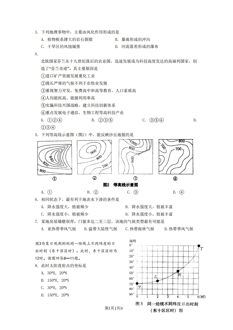 绝密★启用前试卷类型:B2008年普通高等学校招生全国统一考试(广东卷)地理本试卷共12页,37小题,满分150分。考试时间120分钟。注意事项:1.答卷前,考生务必用黑色字迹的钢笔或签字笔将自己的姓名和考生号、试室号、座位号填写在答题卡上,用2B铅笔将试卷类型(B)填涂在答题卡相应位置上。将条形码横贴在答题卡右上角“条形码粘贴处”。选择题每小题选出答案后,用2B铅笔把答题卡上对应题目选项答案信息点涂黑,如需改动,用橡皮擦干净后,再选涂其他答案,答案不能答在试卷上。3.非选择题必须用黑色字迹的钢笔或签字笔作答,答案必须写在答题卡各题目指定区域内相应位置上:如需改动,先划掉原来的答案,然后再写上新的答案:不准使用铅笔和涂改液。不按以上要求作答的答案无效。4.作答选做题时,请先用2B铅笔填涂选做题的题号(或题组号)对应的信息点,再作答。漏涂、错涂、多涂的,答案无效。5.考生必须保持答题卡的整洁。考试结束后,将试卷和答题卡一并交回。一、单选题:本大题20小题,每小题2分,共40分。在每题给出的四个选项中,只有一项是符合题目要求的。1.2008年2月26日“植物界诺亚方舟”仓库在北欧挪威的西斯匹次卑尔根岛(图1)正式落成,以便在地球遭遇极端灾害后还能保存世界各地的生命种子。选择仓库在建在此处最主要的原因是A.寒流流经此处,气候寒流80°N130°EB.国际航线众多,交通便利C.人烟稀少,安全性好D.冷高压控制之下,气候严寒2.下列传统民居各对应的分布地域不正确的是10°EA.蒙古包—呼伦贝尔草原B.架空支撑的房屋一青藏高原图1西斯匹次卑尔根岛位置图C.平顶屋一塔里木盆地D.白色墙壁的房屋—撒哈拉沙漠第0页1共16页3.下列地理事物中,主要由风化作用形成的是A.植物根系撑大的岩石裂隙B.暴雨形成的冲沟C.干旱区的风蚀城堡D.河流落差形成的瀑布4.北欧国家芬兰从十九世纪落后的农业国,迅速发展成为科技高度发达的高福利国家,创造了“芬兰奇迹”。其主要原因是①进口矿产资源发展重化工业②漫长严寒的气候不利于农牧业发展③重视智力开发,免费高中和高等教育,人口素质高④人均能耗高、能源利用率高⑤实施科技兴国战略,建立科技创新体系⑥重点发展电子通信、生物工程等高科技产业A.①②④B.②③⑤C.③⑤⑥D.②③④5.下列等高线示意图(图2)中,能反映沙丘地貌的是1000800800700800820700800①②③④图2等高线示意图A.①B.②C.③D.④6.相同状态下,最有利于地表水下渗的条件是A.降水强度大,植被稀少B.降水强度大,植被丰富C.降水强度小,植被稀少D.降水强度小,植被丰富7.某地房屋墙壁很厚,门窗多达二至三层,该地的气候类型最有可能是A.亚热带季风气候B.温带大陆性气候C.热带雨林气候D.热带季风气候南线图3为某日观测到的同一经线上不同纬度的日0°出时刻(东十区区时)。此时,东十区区时为1012时。读图回答8一11题。209308.此时太阳直射点的坐标是40°A.30°E,20W50B.150°E,20S6070°C.30°E,20S80甲D.150°E,20N906(时)图3同一经线不同纬度日出时刻第1页1共1(东十区区时)图