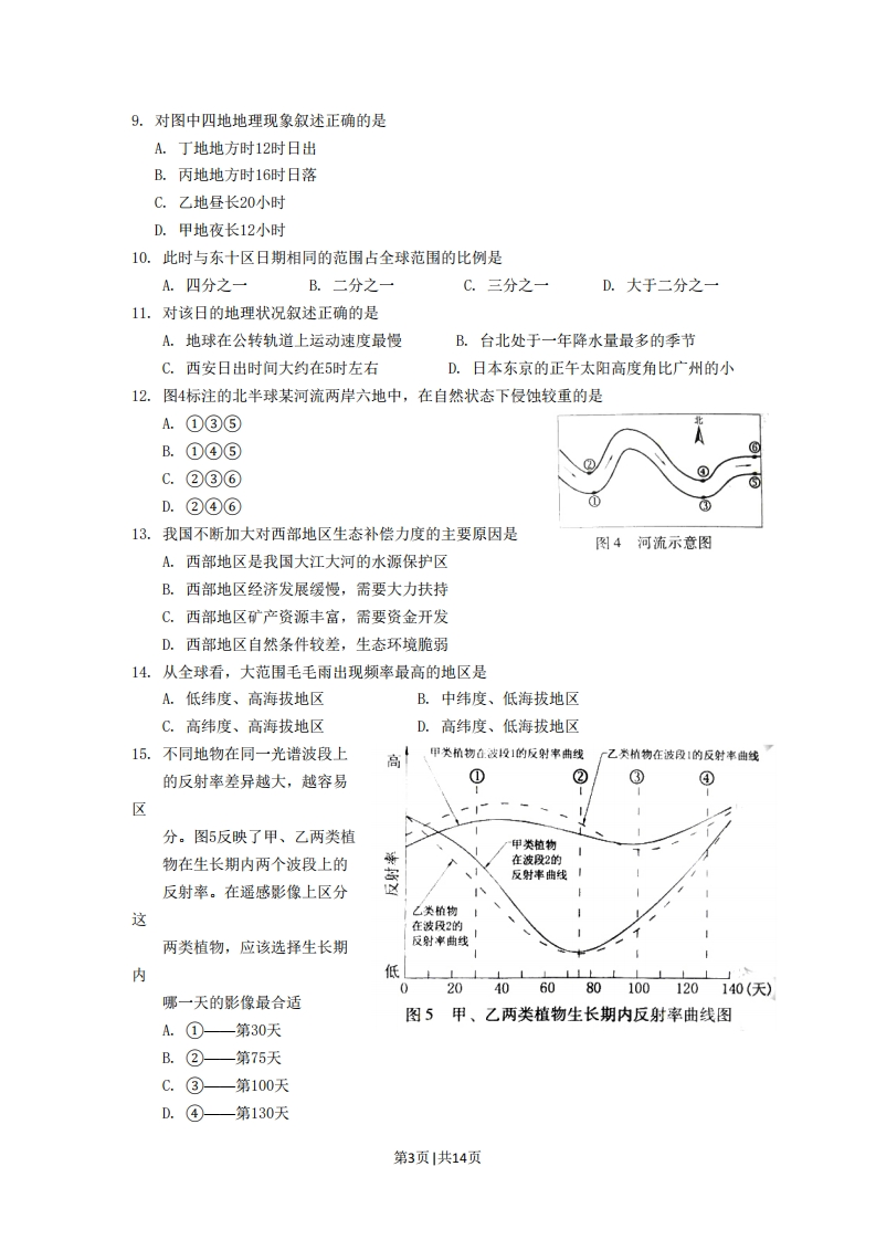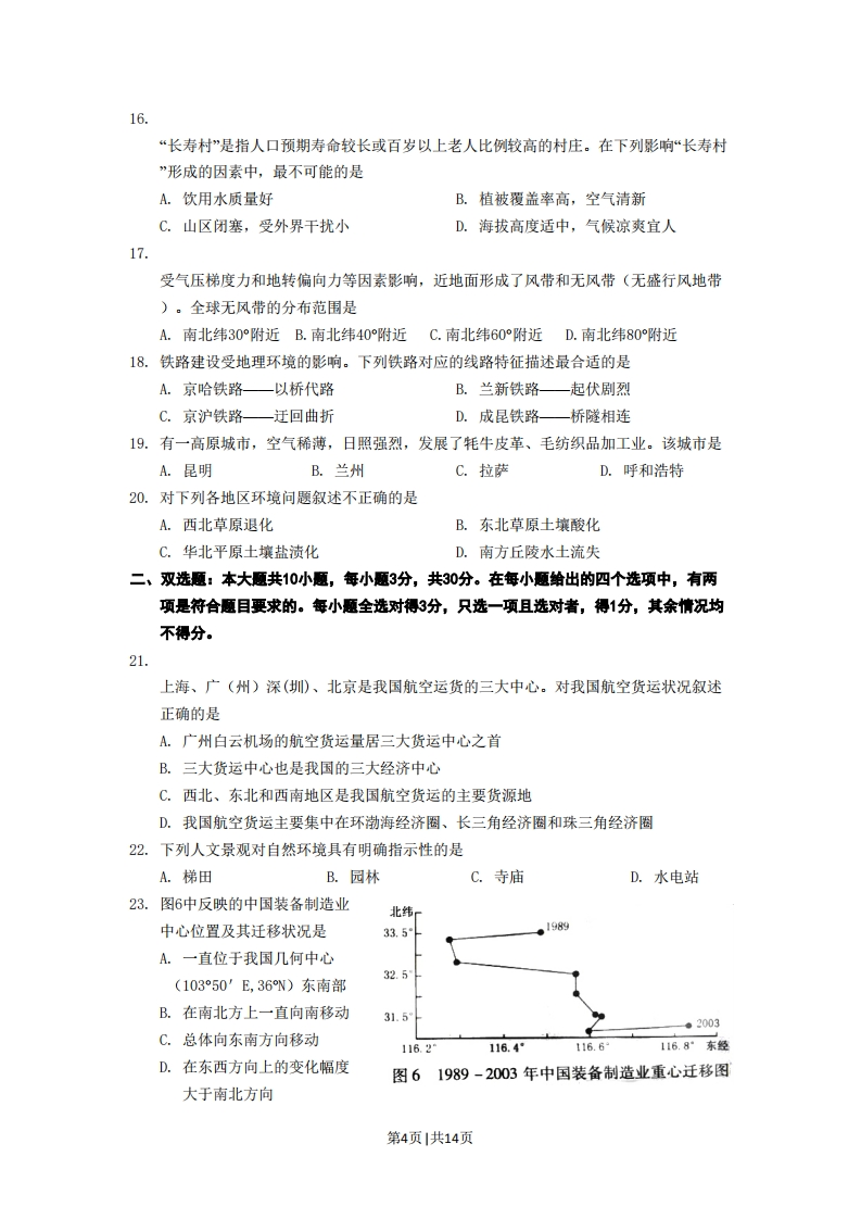 绝密★启用前试卷类型:B2008年普通高等学校招生全国统一考试(广东卷)地理本试卷共12页,37小题,满分150分。考试时间120分钟。注意事项:1.答卷前,考生务必用黑色字迹的钢笔或签字笔将自己的姓名和考生号、试室号、座位号填写在答题卡上,用2B铅笔将试卷类型(B)填涂在答题卡相应位置上。将条形码横贴在答题卡右上角“条形码粘贴处”。选择题每小题选出答案后,用2B铅笔把答题卡上对应题目选项答案信息点涂黑,如需改动,用橡皮擦干净后,再选涂其他答案,答案不能答在试卷上。3.非选择题必须用黑色字迹的钢笔或签字笔作答,答案必须写在答题卡各题目指定区域内相应位置上:如需改动,先划掉原来的答案,然后再写上新的答案:不准使用铅笔和涂改液。不按以上要求作答的答案无效。4.作答选做题时,请先用2B铅笔填涂选做题的题号(或题组号)对应的信息点,再作答。漏涂、错涂、多涂的,答案无效。5.考生必须保持答题卡的整洁。考试结束后,将试卷和答题卡一并交回。一、单选题:本大题20小题,每小题2分,共40分。在每题给出的四个选项中,只有一项是符合题目要求的。1.2008年2月26日“植物界诺亚方舟”仓库在北欧挪威的西斯匹次卑尔根岛(图1)正式落成,以便在地球遭遇极端灾害后还能保存世界各地的生命种子。选择仓库在建在此处最主要的原因是A.寒流流经此处,气候寒流80°N130°EB.国际航线众多,交通便利C.人烟稀少,安全性好D.冷高压控制之下,气候严寒2.下列传统民居各对应的分布地域不正确的是10°EA.蒙古包—呼伦贝尔草原B.架空支撑的房屋一青藏高原图1西斯匹次卑尔根岛位置图C.平顶屋一塔里木盆地D.白色墙壁的房屋—撒哈拉沙漠第1页1共14页3.下列地理事物中,主要由风化作用形成的是A.植物根系撑大的岩石裂隙B.暴雨形成的冲沟C.干旱区的风蚀城堡D.河流落差形成的瀑布4.北欧国家芬兰从十九世纪落后的农业国,迅速发展成为科技高度发达的高福利国家,创造了“芬兰奇迹”。其主要原因是①进口矿产资源发展重化工业②漫长严寒的气候不利于农牧业发展③重视智力开发,免费高中和高等教育,人口素质高④人均能耗高、能源利用率高⑤实施科技兴国战略,建立科技创新体系⑥重点发展电子通信、生物工程等高科技产业A.①②④B.②③⑤C.③⑤⑥D.②③④5.下列等高线示意图(图2)中,能反映沙丘地貌的是1000800800700800820700800①②③④图2等高线示意图A.①B.②C.③D.④6.相同状态下,最有利于地表水下渗的条件是A.降水强度大,植被稀少B.降水强度大,植被丰富C.降水强度小,植被稀少D.降水强度小,植被丰富7.某地房屋墙壁很厚,门窗多达二至三层,该地的气候类型最有可能是A.亚热带季风气候B.温带大陆性气候C.热带雨林气候D.热带季风气候南线图3为某日观测到的同一经线上不同纬度的日0°出时刻(东十区区时)。此时,东十区区时为1012时。读图回答8一11题。209308.此时太阳直射点的坐标是40°A.30°E,20W50B.150°E,20S6070°C.30°E,20S80甲D.150°E,20N906(时)图3同一经线不同纬度日出时刻第2页|共1(东十区区时)图