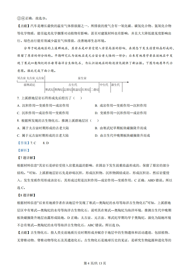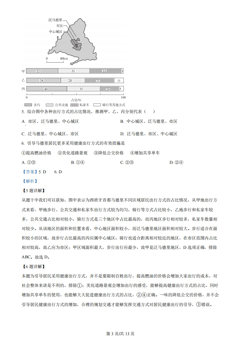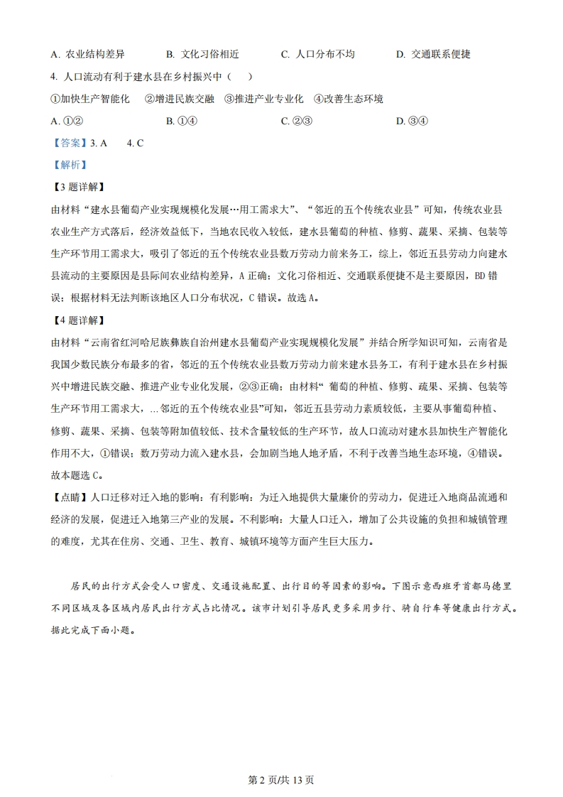 广西壮族自治区2024年普通高中学业水平选择性考试地理本试卷满分100分,考试时间75分钟。一、选择题:本题共16小题,每小题3分,共48分。在每小题给出的四个选项中,只有一项是符合题目要求的。河北某化妆刷企业从我国传统毛笔制作工艺中挖据生产技艺,打造国内知名自主品牌,推出的国风系列等匠心产品深受欢迎。该企业通过跨境电商和海外展会等途径打开了国际市场,但业界认为目前其走出的只是产品。据此完成下面小题。1.该企业能成功打造匠心产品,主要得益于()A.企业文化底蕴深厚B.企业管理制度规范:C.生产技艺融合创新D.当地政府大力扶持2.目前该企业在国际市场竞争中面临的主要困难是()A.关税壁垒B.品牌认可度低C.产能不足D.产品性价比低【答案】1.C2.B【解析】【1题详解】由材料“从我国传统毛笔制作工艺中挖掘生产技艺,打造国内知名自主品牌”可知,该企业能成功打造匠心产品主要得益于生产技艺融合创新,C正确:企业文化底蕴深厚、企业管理制度规范、当地政府大力扶持不是该企业能成功打造匠心产品的主要原因,ABD错误。故选C。【2题详解】由材料“业界认为目前其走出的只是产品”可知,目前该企业在国际市场竞争中面临的主要困难是品牌认可度低,B正确:由材料“该企业通过跨境电商和海外展会等途径打开了国际市场”可知,关税壁垒不是其目前在国际市场竞争中面临的主要困难,A错误:河北是人口大省,劳动力资源丰富,化妆刷生产企业属于劳动力密集型产业,该企业生产历史悠久,工业基础好,工艺精,有丰富的技术好、经验丰富的技术工人,产能充足,产品性价比高,CD错误。故选B。【点睛】关税壁垒是一种通过征收高额进口关税来限制商品进口的措施。这种措施的主要目的是提高外国商品的成本,削弱其在国内市场的竞争能力,从而达到限制这些商品进口,保护本国产品在国内市场上竞争优势的目的。实施乡村振兴战略以来,云南省红河哈尼族彝族自治州建水县葡萄产业实现规模化发展。葡萄的种植、修剪、蔬果、采摘、包装等生产环节用工需求大,吸引了邻近的五个传统农业县数万劳动力前来务工。据此完成下面小题。3.邻近五县劳动力向建水县流动的主要原因是县际间()第1页供13页A.农业结构差异B.文化习俗相近C.人口分布不均D.交通联系便捷4.人口流动有利于建水县在乡村振兴中(①加快生产智能化②增进民族交融③推进产业专业化④改善生态环境A.①②B.①④C.②③D.③④【答案】3.A4.C【解析】【3题详解】由材料“建水县葡萄产业实现规模化发展…用工需求大”、“邻近的五个传统农业县”可知,传统农业县农业生产方式落后,经济效益低下,当地农民收入较低,建水县葡萄的种植、修剪、蔬果、采摘、包装等生产环节用工需求大,吸引了邻近的五个传统农业县数万劳动力前来务工,综上,邻近五县劳动力向建水县流动的主要原因是县际间农业结构差异,A正确:文化习俗相近、交通联系便捷不是主要原因,BD错误:根据材料无法判断该地区人口分布状况,C错误。故选A。【4题详解】由材料“云南省红河哈尼族彝族自治州建水县葡萄产业实现规模化发展”并结合所学知识可知,云南省是我国少数民族分布最多的省,邻近的五个传统农业县数万劳动力前来建水县务工,有利于建水县在乡村振兴中增进民族交融、推进产业专业化发展,②③正确:由材料“葡萄的种植、修剪、疏果、采摘、包装等生产环节用工需求大,邻近的五个传统农业县”可知,邻近五县劳动力素质较低,主要从事葡萄种植、修剪、蔬果、采摘、包装等附加值较低、技术含量较低的生产环节,故人口流动对建水县加快生产智能化作用不大,①错误:数万劳动力流入建水县,会加剧当地人地矛盾,不利于改善当地生态环境,④错误。故本题选C。【点睛】人口迁移对迁入地的影响:有利影响:为迁入地提供大量廉价的劳动力,促进迁入地商品流通和经济的发展,促进迁入地第三产业的发展。不利影响:大量人口迁入,增加了公共设施的负担和城镇管理的难度,尤其在住房、交通、卫生、教育、城镇环境等方面产生巨大压力。居民的出行方式会受人口密度、交通设施配置、出行目的等因素的影响。下图示意西班牙首都马德里不同区域及各区域内居民出行方式占比情况。该市计划引导居民更多采用步行、骑自行车等健康出行方式。据此完成下面小题。第2页供13页