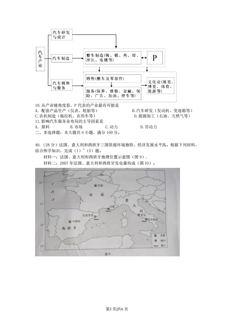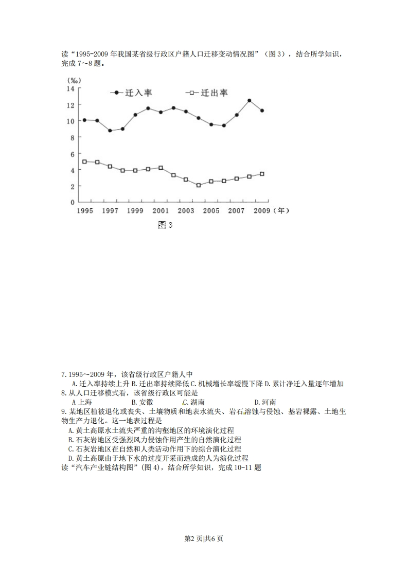 2011年普通高等学校招生全国统一考试(广东卷)文科综合一、选择题:本大题共35小题,每小题4分,共140分。在每小题列出的四个选项中,只有一项是符合题目要求的。1.读“某区域地质剖面简图”(图1),图中甲、乙、丙三处的地质构造分别是丙图10A.断层、向斜、背斜B.断层、背斜、向斜C.向斜、断层、背斜D.背斜、向斜、断层2.研究发现,长江干流江苏段河床在1985年前后平均冲淤状态发生了明显的转变,由淤积转变为冲刷。其主要原因是A.该河段平均流速下降B.该河段径流量减少C.流域年降水量减少D.上游来沙量减少3.1996~2006年,我国城镇人口数量年均增长4.46%,城镇建成区面积年均增长5.23%,2006年人均建设用地面积是发达国家的1.58倍。由此可推断该阶段我国A.城镇建成区城镇人口密度升高B.城镇化水平己经超过发达国家C.城镇土地集约利用水平高于发达国家D.城镇人口增长速度滞后于城镇空间扩张速度读“2007年我国部分省级行政区人均GDP与人均C02排放量点图”(图2),结合所学知识答4-5题a晋内蒙吉12宁全国平均,津鲁沪6,黔4京阀售201234567人均GDP(万元)4.与全国平均水平相比,人均GDP高、人均CO,排放量低的是A.上海、天津B.广东、福建C.海南、贵州D.辽宁、山东5.山西、内蒙古人均GDP高,但人均CO2排放量量高。其主要原因是A.自然资源贫乏B.交通设施落后C.煤炭消耗量大D.第三产业发达6.暖锋过境期间的天气一般表现为A.锋前气压急剧升高,常出现雷暴天气B.锋后空气湿度增加,常形成大范围降水C.锋前水汽凝结,常形成雨、雾天气D.锋后气温降低,常出现晴朗天气第1页供6页读“1995-2009年我国某省级行政区户籍人口迁移变动情况图”(图3),结合所学知识,完成7~8题。(%)】14f。迁入率。一迁出率1210。●660.000200-000019951997199920012003200520072009(年)图37.1995~-2009年,该省级行政区户籍人中A.迁入率持续上升B.迁出率持续降低C.机械增长率缓慢下降D.累计净迁入量逐年增加8.从人口迁移模式看,该省级行政区可能是A上海B.安徽C.湖南D.河南9.某地区植被退化或丧失、土壤物质和地表水流失、岩石溶蚀与侵蚀、基岩裸露、土地生物生产力退化。这一地表过程是A.黄土高原水土流失严重的沟壑地区的环境演化过程B.石灰岩地区受强烈风力侵蚀作用产生的自然演化过程C.石灰岩地区在自然和人类活动作用下的综合演化过程D.黄土高原由于地下水的过度开采而造成的人为演化过程读“汽车产业链结构图”(图4),结合所学知识,完成10-11题第2页供6页