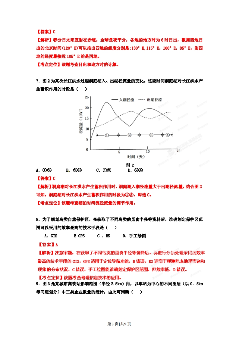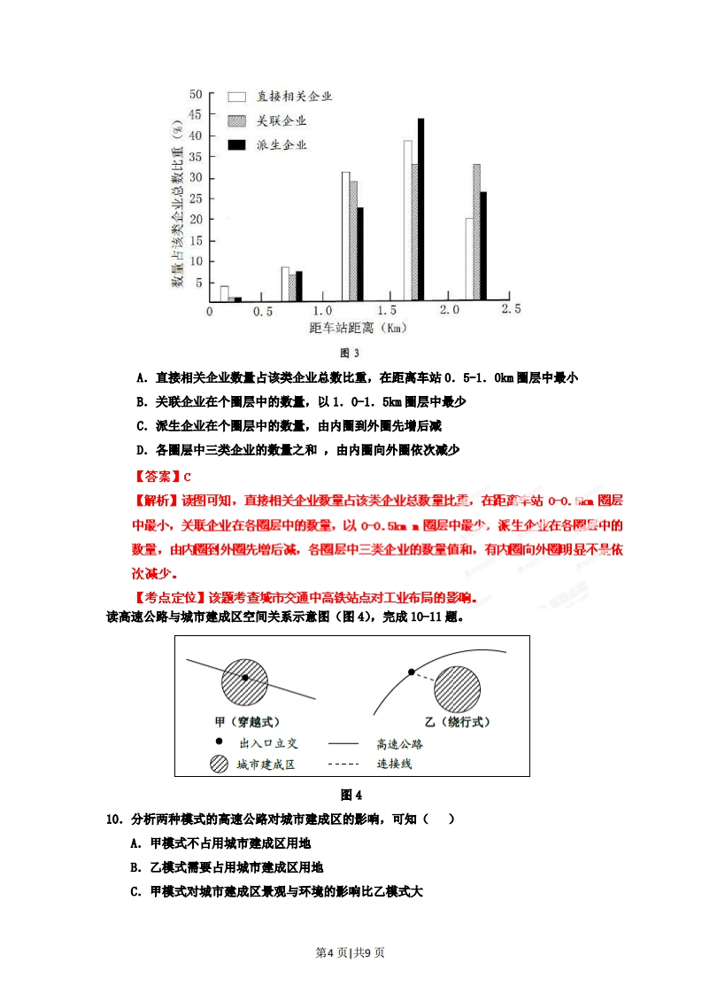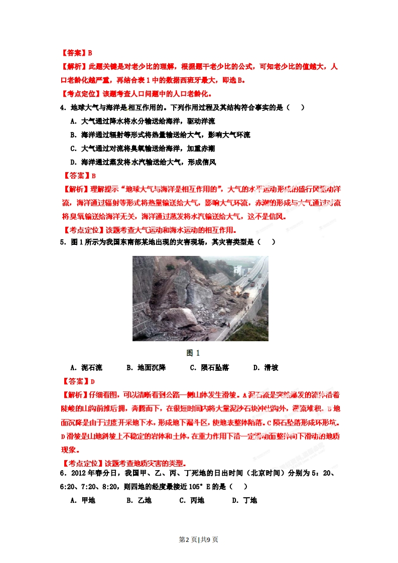 2012年高考广东文综地理试卷解析(教师版)【试卷总评】该套试题考查知识较全面,难度适中偏易,符合新课标地理高考特点和广东高考学生的实际情况,是一套高质量的试愿。选择愿,通过图表考查学生正确获取地理信息和理解运用的能力,11道选择题中,3和911考查人文地理知识,剥余7道选择题考查自然地理部分和地理信息技术,个人觉得911三题都与交通高速公路、铁路有关,有点过了;综合题以区域地理为背景材料来命题,重点考查学生对材料阅读理解和综合分析的能力,考查学生描述和阐释地理基本原理与规律的能力。一、选择题:本大题共35小题,每小题4分,共140分。在每小题列出的四个选项中,只有一项是符合题目要求的。1.剧烈太阳活动产生的太阳风吹袭地球,可能引起()A,人口迁移加快B.风力电厂增产C.生活耗能降低D.卫星导航失效【答案】D【解折】本题考查了太阳活动对地球的影响。剧烈的太阳活动产生的太风吹袭地求,干扰地球大气层中的电离层,导致无线电短波受到响,从而使得卫星导航生效,而对地球上的风力、生活耗能、人口迁移没有影响.【考点定位】该题考查太阳活动对地球的影鹏。2。海洋浮游植物通过光合作用与呼吸作用能够对大气中的C0浓度进行调节,有人称之为海洋“生物泵”作用。该作用可能()A.缓解全球变暖B.缩小臭氧层空洞C.减轻酸雨污染D.加快洋流流速【答案】A【解析】本题主要考查了环境向题的成因。此题关键是对海祥“生物泵”的理解,能对大气中C0:浓塘进行调节,可能增加减少C0,浓度,则该作用可能缓解全球变暖。【考点定位】该题考查植物的大气中00浓度进行调节作用.3.老少比=老龄(65岁以上)人口数×100。表1是2009年四个国家人口统计数据,其少儿(0-14岁)人口数中人口老龄化程度最高的国家是()国家0-14岁人口比重(%)老少比波兰1587西班牙15113白俄罗斯1593匈牙利15107A.波兰B.西斑牙C.白俄罗斯D.甸牙利第1页共9页【答案】B【解析】此题关键是对老少比的理解,根据愿干老少比的公式,可知老少比的值越大,人口老龄化越严重,再结合表1中的数据西班牙最大,即选B。【考点定位】该题考查人口问题中的人口老龄化。4,地球大气与海洋是相互作用的。下列作用过程及其结构符合事实的是()A.大气通过降水将水分输送给海洋,驱动洋流B。海洋通过辐射等形式将热量输送给大气,形响大气环流C。大气通过对流将臭氧输送给海洋,加重赤潮D.海洋通过蒸发将水汽输送给大气,形成信风【答案】B【解析】理解提示“地球大气与海洋是相互作用的”,大气的水平运动形成的盛行风题动洋流,海洋通过福射等形式将热量输送给大气,影响大气环流,赤潮的形成与大气通由对流将臭氧输送给海洋无关,海祥通过蒸发将水汽输送给大气,这不是信风。【考点定位】该题考查大气运动和海水运动的相互作用.5。图1所示为我国东南部某地出现的灾害现场,其灾害类型是()图1A.泥石流B.地面沉降C.陨石坠落D.滑坡【答案】D【解析】仔细看图,可以清晰看到公路一侧山体发生滑坡。A泥石流是突然廉发的流补沿着陡峻的山胸前推后拥,奔鸯而下,在很短时间内将大量泥沙石块冲出沟外,漫流堆积。。地面沉降是由于过度开采地下水,形成地下漏斗区,使地表整体陷落。C陨石坠落形成环形坑。D滑坡山地斜坡上不稳定的岩体和土体,在重力作用下沿一定需面整向下滑南的地质现象.【考点定位】该题考查地皎害的类型.6.2012年春分日,我国甲、乙、丙、丁死地的日出时间(北京时间)分别为5:20、6:20、7:20、8:20,则四地的经度最接近105°B的是()A。甲地B.乙地C.丙地D.丁地第2页共9页